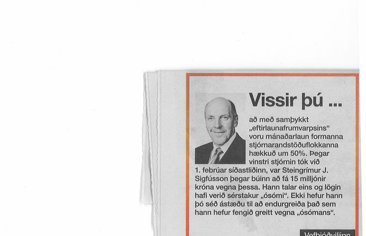 Vinstri hreyfingin grænt framboð hefur kært auglýsingu Vefþjóðviljans, andriki.is sem haldið er úti af hægri mönnum, til siðanefndar SÍA en auglýsingin birtist í Fréttablaðinu í dag. Þar er birt mynd af Steingrími J. Sigfússyni formanni flokksins og vill flokkurinn kanna hvort myndbirtingin standist siðareglur SÍA. Áður hefur VG kært Sjálfstæðisflokkinn í Norðvesturkjördæmi fyrir svipaðar auglýsignar sem birst hafa í héraðsblöðum. Stjórnarmaður Andríkis segir merkilegt að VG hafi ekki gert neina efnislega athugasemd við auglýsinguna. Fordæmi eru fyrir myndbirtingum af fólki úr öðrum flokkum í kosningum. Auglýsing Vefþjóðviljans sem birtist í dag fjallar um að laun formanna stjórnarandstöðuflokkanna hafi hækkað um 50% með samþykkt „eftirlaunafrumvarpsins" svokallaða. Þegar vinstri flokkarnir hafi síðan tekið við 1.febrúar hafi Steingrímur verið búinn að fá 15 milljónir króna vegna þessa. Síðan er sagt frá því að Steingrímur hafi kallað frumvarpið „ósóma" en ekki séð ástæðu til þess að endurgreiða umrædda upphæð. Í kæru VG sem undirrituð er af Finni Dellsén miðlægum kosningastjóra flokksins segir að birting myndarinnar af Steingrími sé óheimil samkvæmt siðareglum SÍA og stjórnin beðin um að úrskurða í málinu. „Það er merkilegt að Vinstri grænir hafa enga efnislega athugasemd við auglýsinguna. Þeir vilja bara stoppa hana vegna myndbirtingar af Steingrími. Það er eins og þeim þyki það mikið feimnismál að Steingrímur hefur hagnast um 15 milljónir króna vegna eftirlaunafrumvarpsins svonefnda frá árinu 2003. Þuríður Bachman þingmaður VG var einn af upphaflegum flutningsmönnum frumvarpsins en Steingrímur kallaði það nýlega ósóma. Hvers vegna skilar hann þá ekki þessum 15 milljónum af ósómanum?," segir Glúmur Jón Björnsson stjórnarmaður Andríkis. Glúmur segir að myndbirtingar af andstæðingum í auglýsingum stjórnmálaflokka þekkist í gegnum tíðina. Nefnir hann í því sambandi auglýsingu frá Samfylkingunni í aðdraganda kosninganna 2003 þar sem myndir af öllum fyrrum forsætisráðherrum landsins voru birtar ásamt mynd af Ingibjörgu Sólrúnu Gísladóttur, þáverandi forsætisráðherraefni flokksins. Fréttastofa hefur einnig undir höndum auglýsingu frá Frjálslyndaflokknum sem dreift var í hús. Þar er birt auglýsing frá Sjálfstæðisflokknum síðan í kosningunum 2007 þar sem er mynd af Geir H. Haarde. Einnig má benda á barmmerki sem ungir vinstri grænir hafa dreift undanfarið með mynd af Bjarna Benediktsson formanni Sjálfstæðisflokksins með áletruninni, „Olía á eldinn".Auglýsing Frjálslynda flokksinsAuglýsing VefþjóðviljansBarmmerki UVG