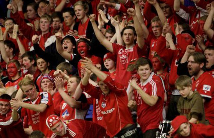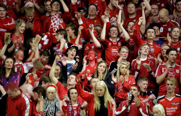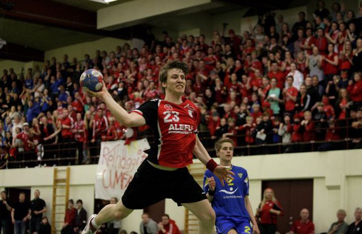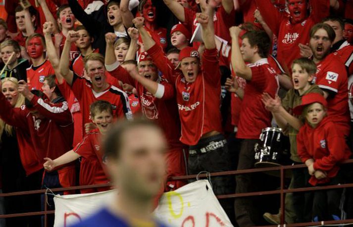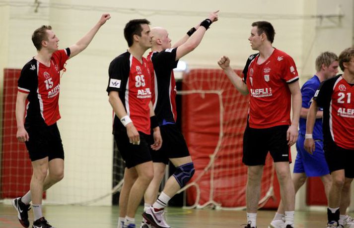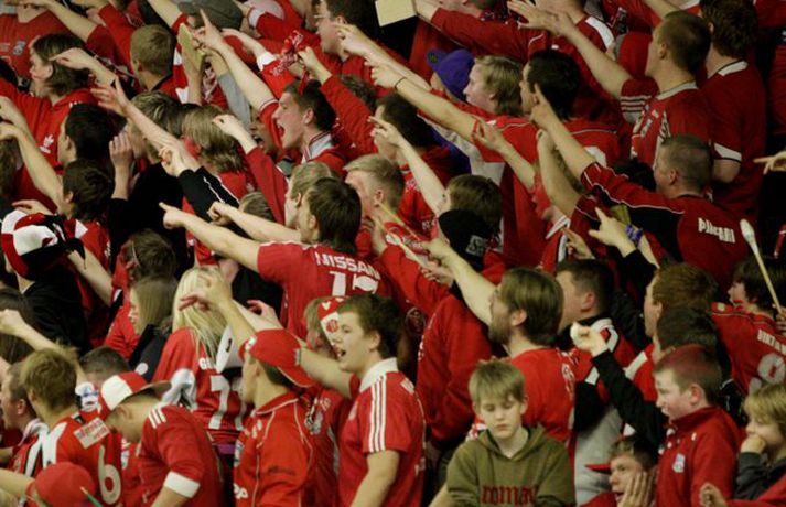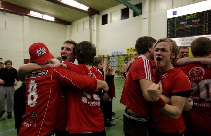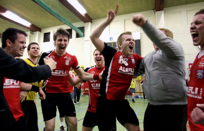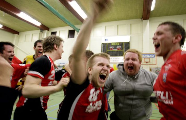Afturelding úr Mosfellsbæ tryggði sér í gær sæti í N1-deild karla næsta vetur með mögnuðum sigri á Gróttu sem fór fyrir vikið niður í 1. deild. Stemningin í gamla íþróttasalnum að Varmá í gær var með hreinum ólíkindum. Troðið út úr dyrum og sungið allan tímann. Það sást varla sá maður sem fékk sér sæti allan leikinn. Valgarður Gíslason, ljósmyndari Fréttablaðsins og Vísis, var á svæðinu og myndi stemninguna á vellinum sem og í stúkunni. Afraksturinn má sjá í myndaalbúminu hér að neðan. Hægt er að sjá myndirnar stærri með því að smella á þær. Gunnar Andrésson, þjálfari Aftureldingar, fær hér flugferð.Mynd/Valli