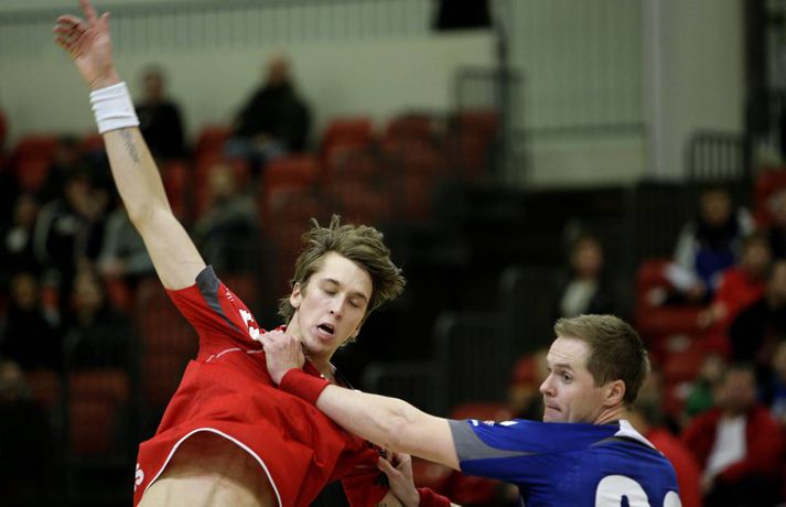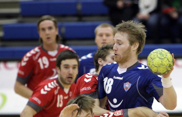 Einar Örn Jónsson var hetja Vals í kvöld er hann skoraði sigurmark Íslandsmeistara Hauka gegn Val á lokasekúndum leiksins. Vilhelm Gunnarsson, ljósmyndari Fréttablaðsins og Vísis, var á vellinum í kvöld og myndaði hasarinn. Afraksturinn má sjá í albúminu hér að neðan.