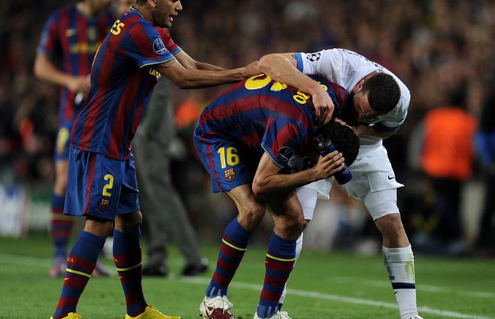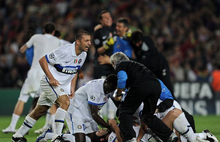 Það var rafmagnað andrúmsloftið á Camp Nou í Barcelona í kvöld er Inter sótti Barcelona heim í síðari leik liðanna í undanúrslitum Meistaradeildar Evrópu. Inter tapaði leiknum, 1-0, en komst áfram þar sem liðið vann fyrri leik liðanna á Ítalíu, 3-1. Það gekk ýmislegt á þegar leik liðanna lauk í kvöld. Victor Valdes, markvörður Barcelona, reyndi að tuska José Mourinho, þjálfara Inter, til þar sem honum mislíkaði fögnuður hans. Vallarstarfsmenn Barca vildu greinilega ekki horfa upp á leikmenn Inter fanga og kveiktu þó fljótlega eftir leik á vökvunarkerfinu. Það stöðvaði ekki gleði leikmanna Inter sem böðuðu sig í vatninu. Hægt er að sjá svipmyndir af dramatíkinni í albúminu hér að neðan. Myndirnar eru síðan stærri ef smellt er á þær. Nordic Photos/AFPNordic Photos/AFPNordic Photos/AFPNordic Photos/AFPNordic Photos/AFPNordic Photos/AFPNordic Photos/AFPNordic Photos/Getty ImagesNordic Photos/Getty ImagesNordic Photos/Getty ImagesNordic Photos/Getty ImagesNordic Photos/Getty ImagesNordic Photos/Getty ImagesNordic Photos/Getty ImagesNordic Photos/Getty Images