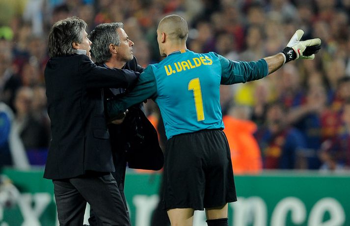 Inter fagnaði í Barcelona - myndir Henry Birgir Gunnarsson skrifar 28. apríl 2010 22:45 Valdes var ekki sáttur við fagnaðarlæti Mourinho í kvöld. Það var rafmagnað andrúmsloftið á Camp Nou í Barcelona í kvöld er Inter sótti Barcelona heim í síðari leik liðanna í undanúrslitum Meistaradeildar Evrópu. Inter tapaði leiknum, 1-0, en komst áfram þar sem liðið vann fyrri leik liðanna á Ítalíu, 3-1. Það gekk ýmislegt á þegar leik liðanna lauk í kvöld. Victor Valdes, markvörður Barcelona, reyndi að tuska José Mourinho, þjálfara Inter, til þar sem honum mislíkaði fögnuður hans. Vallarstarfsmenn Barca vildu greinilega ekki horfa upp á leikmenn Inter fanga og kveiktu þó fljótlega eftir leik á vökvunarkerfinu. Það stöðvaði ekki gleði leikmanna Inter sem böðuðu sig í vatninu. Hægt er að sjá svipmyndir af dramatíkinni í albúminu hér að neðan. Myndirnar eru síðan stærri ef smellt er á þær. Nordic Photos/AFPNordic Photos/AFPNordic Photos/AFPNordic Photos/AFPNordic Photos/AFPNordic Photos/AFPNordic Photos/AFPNordic Photos/Getty ImagesNordic Photos/Getty ImagesNordic Photos/Getty ImagesNordic Photos/Getty ImagesNordic Photos/Getty ImagesNordic Photos/Getty ImagesNordic Photos/Getty ImagesNordic Photos/Getty Images Meistaradeild Evrópu Mest lesið Bíll Shaquille O'Neal enn ófundinn Körfubolti Epicbet sýni handboltann í leyfisleysi: „Enda ólöglegar síður“ Handbolti Óskar Hrafn fer ekki fet Íslenski boltinn Sú leikjahæsta leggur skóna á hilluna og klárar læknanámið Fótbolti Arteta óttast ekki að keppinautarnir steli undrabarninu frá honum Enski boltinn Búin að finna leiðina til að pirra og vinna Liverpool Enski boltinn Barnabarn Donalds Trump keppir á LPGA-mótaröðinni Golf Hákon Rafn hélt hreinu þegar Brentford flaug áfram Enski boltinn FH bíður með að tilkynna nýjan þjálfara Íslenski boltinn Dagskráin í dag: Íslenskur körfubolti í sviðsljósinu Sport Fleiri fréttir Búin að finna leiðina til að pirra og vinna Liverpool Sú leikjahæsta leggur skóna á hilluna og klárar læknanámið Stuðningsmaður RB Leipzig lést á bikarleiknum í gærkvöldi Arteta óttast ekki að keppinautarnir steli undrabarninu frá honum FH bíður með að tilkynna nýjan þjálfara Óskar Hrafn fer ekki fet Spánn og Þýskaland mætast í úrslitum Anguissa hetja meistaranna Hákon Rafn hélt hreinu þegar Brentford flaug áfram Jón Dagur gulltryggði sigurinn með sínu fyrsta marki Leikið á Þróttaravelli á miðvikudag Vinícius Júnior íhugar að yfirgefa Real Madríd Kaupir sér tveggja milljarða króna hús Alexander Máni með fimm mörk í tveimur leikjum og Ísland áfram Birnir frá Akureyri í Garðabæ Klobbaði íslensku strákana og fór á flug á netmiðlum Hættir með Fram Landsliðskonur aðstoðuðu ökumenn í vanda Landsleiknum aflýst og framhaldið óljóst Segir að Slot verði að taka tvo leikmenn út úr Liverpool-liðinu Vonast til að komast í Kórinn: „Menn hafa aldrei séð annað eins“ „Alltaf gaman að fá nýjar raddir inn“ Gleðifréttir fyrir Argentínumenn: Messi vill spila á HM Stöðufundur í Laugardal klukkan 10:30 Enska úrvalsdeildin í jólaköttinn Nýi íþróttastjóri Kjartans stal mörgæs og endaði í fangelsi í Singapúr Tyrkneska sambandið segir dómara hafa veðjað á þúsundir leikja Brendan Rodgers sagði starfinu sínu lausu eftir ásakanir Segir sitt fyrrum lið í krísu Fylltu í eyðurnar: Vanmetnasti leikmaður deildarinnar? Sjá meira