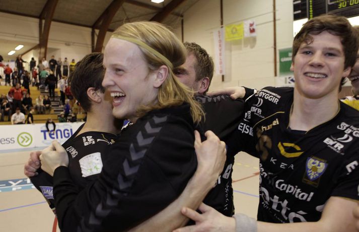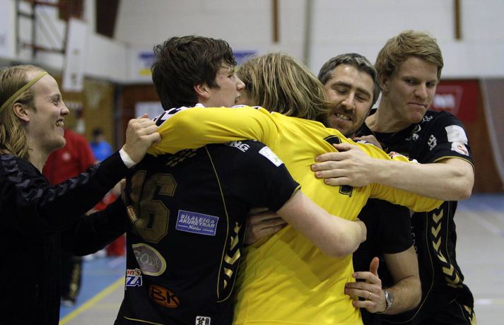 Akureyringar fögnuðu innilega í Digranesi í gær er liðið tryggði sér deildarmeistaratitilinn í N1-deild karla. Þetta var þriðja tækifæri Akureyrar til að tryggja sigur í deildinni og það hafðist loksins. Akureyringar hafa verið lagnir við að klúðra úrslitaleikjum og þeir fögnuðu því innilega er þeir brutu loksins ísinn í gær. Vilhelm Gunnarsson, ljósmyndari Vísis og Fréttablaðsins, myndaði fögnuð Akureyringa og má sjá afraksturinn hér að neðan.