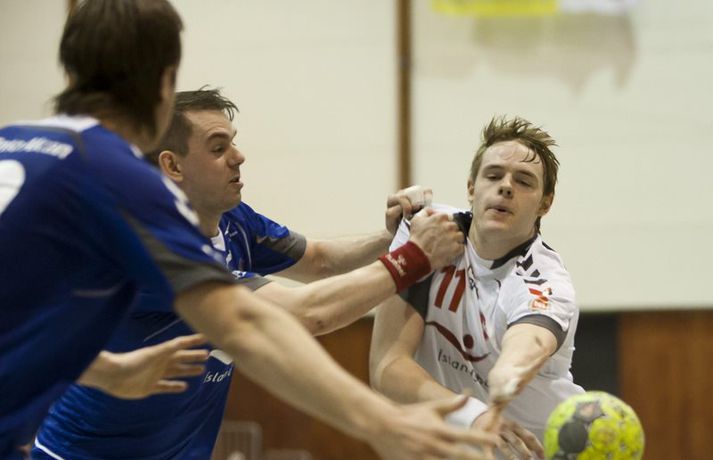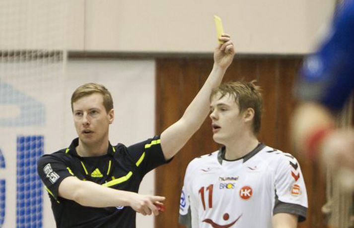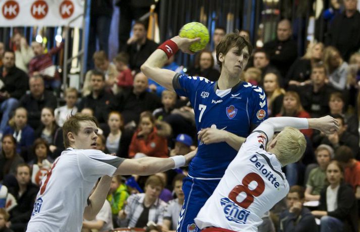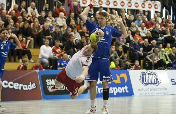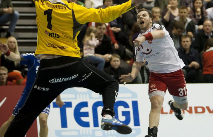 Umfjöllun og viðtöl: HK - Haukar 21-18 | HK leiðir 2-0 Kristinn Páll Teitsson í Digranesi skrifar 20. apríl 2012 10:33 Haukamaðurinn Tjörvi Þorgeirsson sækir að marki HK í kvöld. Mynd/HAG HK eru komnir í afar vænlega stöðu í undanúrslitarimmu sinni við Hauka í N1-deild karla eftir 21-18 sigur í kvöld. Þeir eru 2-0 yfir í einvíginu en það þarf þrjá sigra til að komast í sjálfann úrslitaleikinn. HK unnu fyrsta leik sinn gegn Haukum í fyrsta leik liðanna á miðvikudaginn örugglega, 30-24. Þeir gátu því tekið stórt skref í átt að úrslitum í kvöld en um leið er staða Hauka orðin verulega slæm. Jafnræði var með liðunum fyrstu mínútur leiksins þar til að Haukar hrukku í gang um miðbik hálfleiksins. Þeir náðu fjögurra marka forystu á 19. mínútu og tóku þá þjálfarar HK leikhlé. Það virtist skila sér í betri varnarleik því gestirnir úr Hafnafirði skoruðu ekki annað mark í hálfleiknum. Sóknarleikur HK lagaðist hins vegar ekki mikið en liðið náði þó að jafna metin áður en flautað var til hálfleiks. Staðan var þá 8-8. Haukar misstu þar að auki lykilmann af velli stuttu fyrir leikhlé þegar Gylfi Gylfason fékk sína þriðju brottvísun fyrir að fara með fótinn í boltann. Gríðarleg spenna var allan seinni hálfleikinn. Liðin skiptust á að vera í forystu allt fram að síðustu tíu mínútum leiksins. Þá stigu leikmenn HK upp og sigldu fram úr Haukum, líkt og þeir gerðu á Ásvöllum síðasta miðvikudag. Niðurstaðan var þriggja marka sigur sem fyrr segir. Haukar eru komnir í erfiða stöðu og þurfa að sýna á sér betri hlið ef liðið ætlar sér ekki í sumarfrí á mánudagskvöldið. Annan leikinn í röð láta þeir í minni pokann á lokasprettinum. HK-ingar mega hins vegar verið gríðarlega ánægðir enda spiluðu þeir vel í vörn á Ásvöllum en voru enn betri í kvöld. Rétt eins og þá átti markvörðurinn Björn Ingi Friðþjófsson stórleik. Ólafur Bjarki Ragnarsson átti góðan leik fyrir HK en hann skoraði sex mörk í leiknum. Hjá Haukum var Stefán Rafn Sigurmannsson markahæstur með fimm mörk. Kristinn: Erum ekki búnir að vinna neitt ennþá„Við erum 2-0 yfir og þurfum að vinna einn leik í viðbót og það verður hörkuspennandi leikur en við erum ekki búnir að vinna neitt ennþá," sagði Kristinn Guðmundsson, annar þjálfara HK eftir leikinn. „Við erum búnir að eiga tvo frábæra leiki á móti Haukum núna og við þurfum að halda því áfram. Núna þurfum við að greina hvað var að í þessum leik og fara yfir það, við lentum í bullandi vandræðum með sóknarleikinn okkar í kvöld." Ekki var mikið skorað í þessum leik og áttu varnir og markmenn liðanna flottan leik. „Við vorum að spila frábæra vörn, það má laga slæmu hlutina úr þessum leik og hamra á þeim góðu og reyna með því að ná í þennan eina sigur í viðbót sem okkur vantar." „Við erum komnir í úrslitakeppnina, þetta eru tvö góð lið sem þekkja mjög vel inn á hvort annað og þá á handboltinn oft til að vera svolítið þungur. Þá verður maður að finna lausnir og reyna að nota þær - baráttan og samstaðan er það sem skiptir máli í þessu." „Það er mikið búið að gagnrýna markmennina okkar en við erum búnir að spila frábæra vörn og fá frábæra markvörslu í síðustu leikjum þannig ég hef fulla trú á varnarleiknum okkar," sagði Kristinn. Heimir: Ætla ekki í sumarfrí í næstu viku„Við erum búnir að mála okkur út í horn, við erum búnir að spila illa og ekki sem lið og núna þurfum við bara að rísa upp eins og lið og spila eins og menn," sagði Heimir Óli Heimisson, leikmaður Hauka eftir leikinn. „Vörnin og markvarslan var fín í dag, það er ekkert hægt að sakast út á það hér í dag. Sóknin er hinsvegar ekki að gera góða hluti, við verðum að rífa okkur upp á næstu tvemur dögum og koma fullir einbeitingar í næsta leik." „Einvígið er alls ekki búið, þetta snýst um liðsheildina hjá okkur. Við erum ekki liðsheild hér í dag og ekki í fyrsta leik og við þurfum einfaldlega að vinna okkur saman út úr þessu." „Að skora átján mörk er hrikalega lélegt í úrslitakeppni, við höfum alltaf verið að skora yfir tuttugu mörk í leik og við þurfum að fara að taka okkur á, allir saman." „Við erum ekki búnir að segja okkar síðasta, það þurfa allir að hugsa sinn gang og að skoða hver og einn hvað við getum gert betur. Ég ætla ekki í sumarfrí í næstu viku," sagði Heimir ákveðinn. Ólafur Bjarki: Megum ekki slaka á„Við erum þvílíkt sáttir að vera komnir í tvö núll hérna í Digranesinu gegn einu sterkasta liði landsins," sagði Ólafur Bjarki Ragnarsson, leikmaður HK eftir leikinn. „Bjössi stóð sig eins og hetja, það er búinn að vera mikill stígandi í markvörslunni hjá okkur og vörnin okkar var hrikalega flottur í kvöld. Sóknarleikurinn var slakur í byrjun en við héldum haus og þetta kom í lokin," HK eru komnir í 2-0 í einvíginu en það þarf þrjá sigra til að vinna einvígið. „Við ætlum okkur að reyna að klára þetta í næsta leik, við megum ekkert slaka á." „Ég hef aldrei farið í úrslitaleikinn með HK og við höfum aldrei orðið Íslandsmeistarar. Við erum staðráðnir í að komast í úrslitarimmuna og við gefum allt í næstu leiki og sjá hvert það skilar okkur," sagði Ólafur. Olís-deild karla Mest lesið Ísland lenti í algjörum martraðarriðli Fótbolti Liverpool vann risaslaginn Fótbolti Þjálfari sem mætti Víkingi í fyrra lést í miðjum leik Fótbolti Lýsir eftir leiðtoga íslenska landsliðsins Handbolti Þjálfaragoðsögn látin taka pokann sinn: „Ég er undrandi“ Fótbolti Falla fleiri gleðitár hjá fjölskyldu Viktors í kvöld? Fótbolti Meistararnir lágu á heimavelli Fó