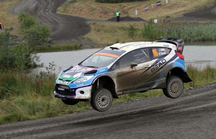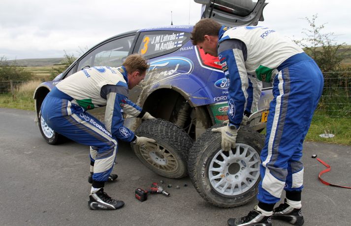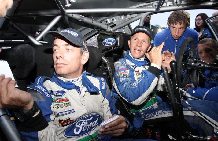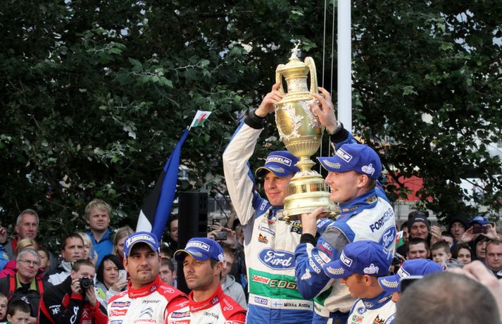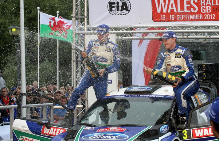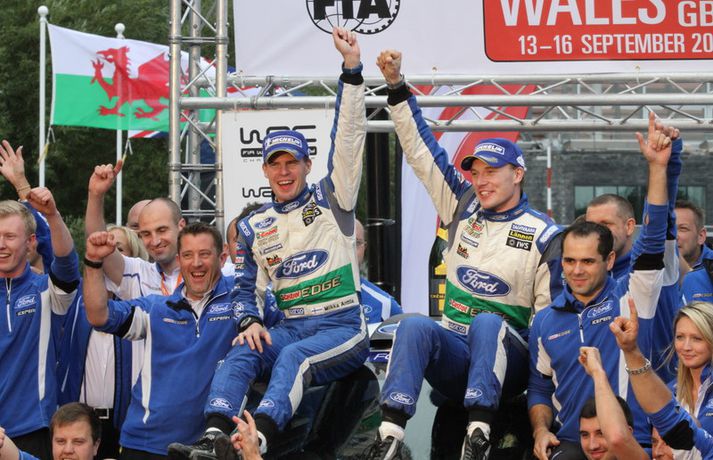 Citroen hinn franski og Ford hinn breski háðu stríð í Wales Páll Halldór Halldórsson skrifar 21. september 2012 17:45 Jari-Matti Latvala og Miikka Anttila fagna sigrinum. Gunnlaugur Briem Það var spenna innan hópsins, þegar nokkrir áhugamenn um rallý drifu sig til Wales á Englandi dagana 13. – 16. september, til að fylgjast með 80 ára afmæli breska rallsins, en það var fyrst haldið árið 1932. Maður sér ekki alveg fyrir sér aksturskeppnir á Íslandi árið 1932 þegar fjöldi bíla á Íslandi var einungis um 1500 talsins og enginn af þeim notaður til keppnishalds. Félaganir Gunnlaugur Briem áhugaljósmyndari, Björn Ragnarsson, Gunnar Viggósson, Ásgrímur Kristjánsson, Jóhannes Jóhannesson og undirritaður Páll Halldór Halldórsson áhugamenn um rallakstur hafa allir farið nokkrum sinnum áður til að fylgjast með þessari keppni. Einungis 78 keppendur voru skráðir til leiks, þar á meðal kunnulegir Land Rover jeppar og ökumenn þeirra frá Breska hernum sem oft hafa keppt hér á landi. En mesta spenna hjá okkur var að sjá fyrstu 15 bílana sem keppa í heimsmeistaramótinu. Að fá tækifæri til þess að sjá þessa ofurbíla í návígi er ótrúlegt, jafnvel fyrir sjóaða rallýkappa sem okkur. Að finna kraftinn, heyra hljóðin, finna lyktina og allt það sem maður vill upplifa er hverrar krónu virði. Við brosum okkar breiðasta, verðum aftur 17 ára. Sjá hvernig ökumennirnir hafa 100 % stjórn á bílunum er alveg með ólíkindum. Þessir bestu ökumenn heims gera bara nánast engin mistök. Menn koma í mark eftir sekúntuslag og úrslitin ráðast á síðustu sérleið. Þó var ansi skemmtilegt að upplifa, þegar einn út hópnum tekur upp videovél í fyrsta sinn eftir tveggja daga áhorf og segir "Er ekki rétt að taka smá video?“ og Rússinn Evgeny Novikov ekur fyrstur hjá og klúðrar næstu beygju, rennur út á hlið og festist smá stund uppá grasbakka. Losnar þaðan með hjálp áhorfenda. Videovélin er aftur sett niður í tösku. Kannski er kreppa í Bretlandi?Mun færri áhorfendur eru mættir inn á sérleiðir til að horfa á keppnina en oft áður og það sama má segja um fjölda keppenda. Kannski að það sé kreppa í Bretlandi ? Skömmu síðar sjáum við 15 blaðamenn og ljósmyndara troða myndavélum og míkrafónum inn í bíl með rásnúmer 4. Sumir eru vinsælli en aðrir. Hættur eru á hverju strái í ralli sem þessu, stutt er á milli hláturs og gráturs. Þann 16 júní sl lét Gareth Roberts aðstoðarökumaður lífið í keppni á Sikiley. Ökumaðurinn ungi, Írinn Craig Breen slapp ómeiddur frá slysinu og tekur hér þátt á ný og vinnur sinn flokk. Það er mikil og tilfinningarík stund, þegar bílnum er ekið er uppá verðlaunapallinn, fólk klappar, grætur, brosir, allt í senn. Foreldrar og vinir taka öll þátt í stundinni. Allir vita að hverju er gengið, þegar ákveðið er að taka þátt í akstursíþóttakeppnum. Undirritaður hefur upplifað þetta sjálfur, kyssti ætíð börn sín og konu, horfði vel á þau sofandi í rúmum sínum, þegar hann fór í keppnir. Þótt maður kæmi ekki heim aftur, þá færi maður sáttur yfir móðuna miklu við það sem maður elskaði að gera. Langt er síðan heimamaður hefur unnið þessa keppni. Tveir helstu ökumenn Bretlands á árunum 1990 - 2007 eru sennilega þeir Colin McRae og Richard Burns. Colin McRae létst í þyrluslysi fyrir 5 árum síðan og Richard Burns úr veikindum, báðir langt fyrir aldur fram, báðir elskaðir og dáðir um allan heim. Og kaldhæðni örlaganna valda því að þeir fara á þennan hátt, ekki undir stýri á rallýbíl. Jú, menn eru vel varðir í bílnum, með veltibúrið, hjálminn og annan öryggisbúnað sem þurfa þykir. Burns vann rallið þrisvar, 1998, 1999 og 2000. McRae árið 1997 og þar áður Roger Clark 1972 og 1976. Heimamenn eru því farnir að þrá sigur. Citroen vildi fagna tvöföldum sigri á heimavelli Við hlerum það hjá Ford liðinu, að þeir upplifi það þannig að Citroen vilji ekki vinna hér í Bretlandi, þeim langar að vinna tvöfalt í Frakklandi um næstu helgi, enda þá á heimavelli. Já, þetta vorum við ekki búnir að sjá fyrir. Allar líkur eru á því, að heimsmeistarinn Sébastien Loeb með aðstoðarökumanninn Daniel Elena sér við hlið verði heimsmeistari í 9. sinn umrædda helgi í Frakklandi, auk þess að liðið vinni titil bílasmiða, en þrjár keppnir eru eftir af keppnistímabilinu. Við sjáum í gögnum að nokkrir ökumenn sem eru hér skráðir til leiks eru afar ungir, keppa jafnvel á öflugustu bílum. Hugsanlega er Playstation kynslóðin að taka hér völdin. Yngsti ökumaðurinn í flokki ofurbíla er rússinn Novikov og er fæddur 1990. Hann virðist gera bílinn út sjálfur með aðstoð sinna styrktaraðila í Rússlandi og víðar. Heimsmeistarinn Loeb og hinn Norski Petter Solberg eru báðir fæddir 1974. Og þeir frændur okkar Norðmenn, Svíar og Finnar þykja einstaklega lagnir á ökutækjum ýmiskonar og margir þykjast sjá víkingablóð renna í æðum þessara manna. Eitthvað valdi því að þeir ná þessum tökum og hafa kjarkinn sem þarf. Það er því réttlát spurning til að velta fyrir sér, hvað veldur því að Íslenskir ökumenn hafa ekki sést á meira þessum vettvangi? Hugsanlega má halda því almennt fram, að besti ökumaðurinn fái aldrei möguleika, enginn veit af honum, hann fékk aldrei tækifæri á að sanna sig. Undirritaður getur viðurkennt að hann fann svo sem fyrir því á sínum keppnisferli hér heima, að stutt er yfir í stóru deildina, en peningaleysi stöðvuðu slíka drauma. Ljóst er að það þarf mikið af starfsmönnum við keppni sem þessa, sjálfboðaliðar koma alls staðar úr heiminum. Frá hinum ýmsu bílaklúbbum og mæta mörgum tímum áður en keppni hefst, til að loka vegum, stígum og t