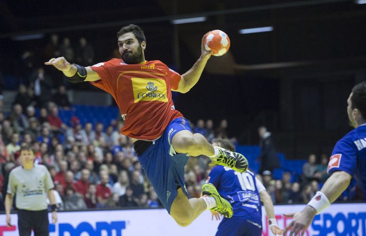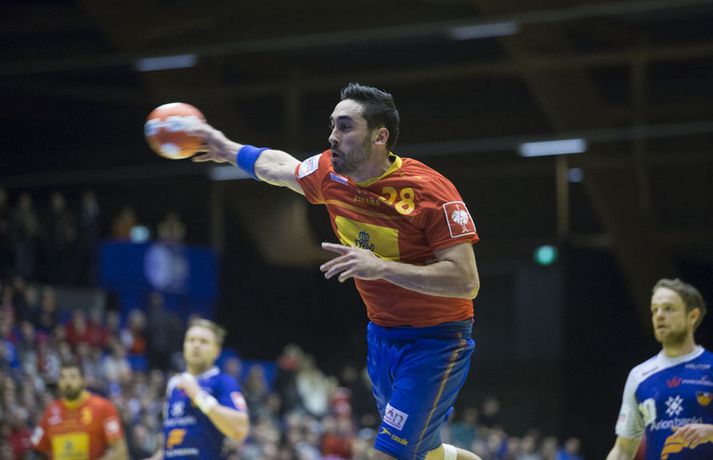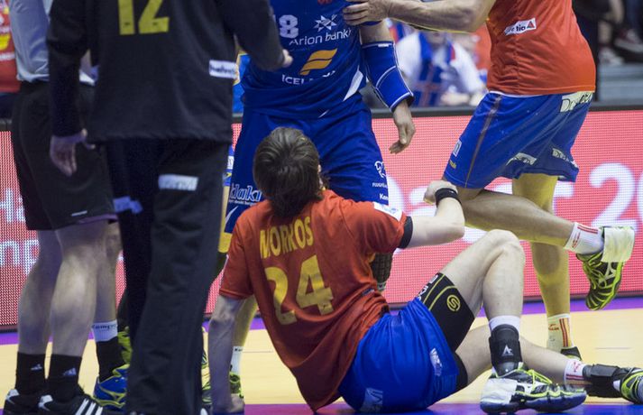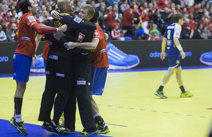 Íslenska landsliðið varð að sætta sig við annað sætið í B-riðli og að taka bara eitt stig með sér í milliriðilinn eftir fimm marka tap á móti heimsmeisturum Spánverja í kvöld, 28-33, í lokaleik sínum í riðlakeppni Evrópumótsins í handbolta í Danmörku. Það voru helst tveir frábærir kaflar hjá spænski heimsmeisturunum sem reyndust íslensku strákunum banvænir í þessum leik og þeir komu báðir eftir að íslenska liðið komst þremur mörkum yfir. Fyrst skoraði spænska liðið fjögur síðustu mörk fyrri hálfleiks og komst yfir í 16-15 fyrir hálfleik og Spánverjarnir breyttu síðan stöðunni úr 22-19 fyrir Ísland í 25-22 fyrir Spán með því að skora sex mörk í röð um miðjan seinni hálfleikinn. Daníel Rúnarsson, ljósmyndari Vísis og Fréttablaðsins, var í höllinni í Álaborg í kvöld og náði fullt af skemmtilegum myndum sem má sjá bæði hér fyrir ofan og hér fyrir neðan.Vísir/DaníelVísir/DaníelVísir/DaníelVísir/DaníelVísir/DaníelVísir/DaníelVísir/DaníelVísir/Daníel