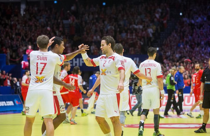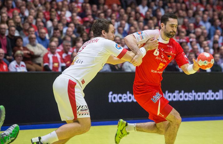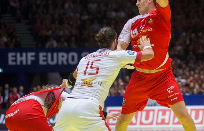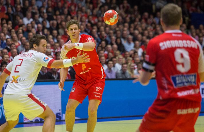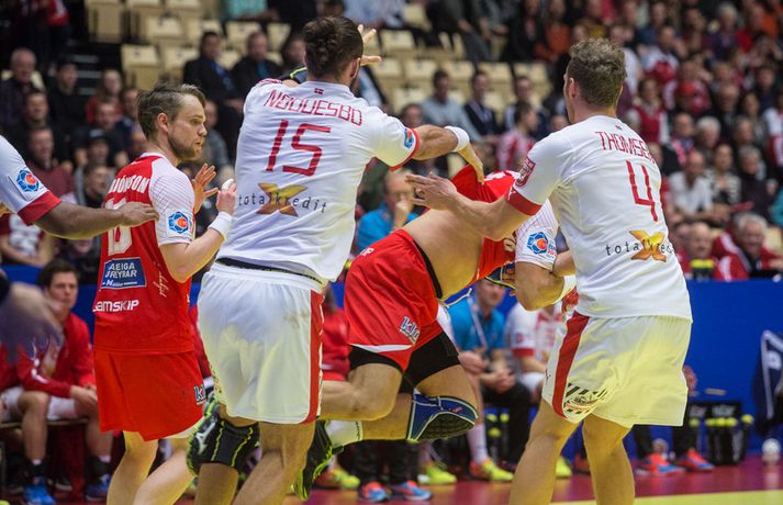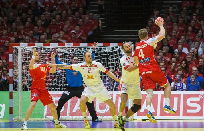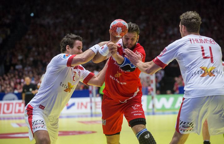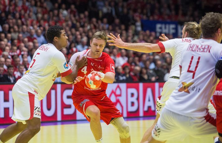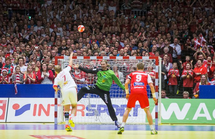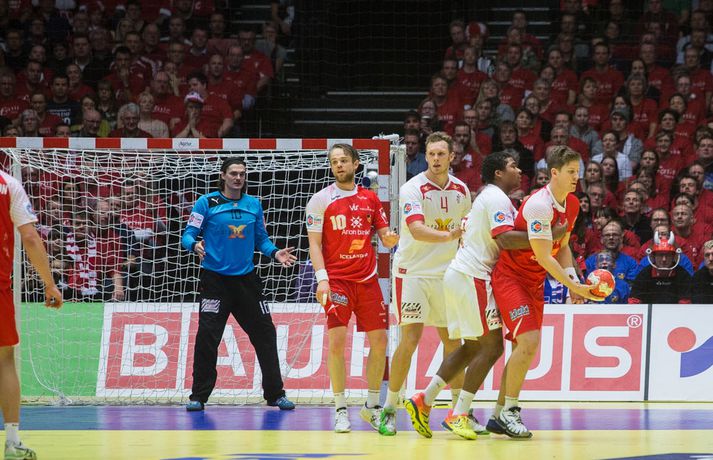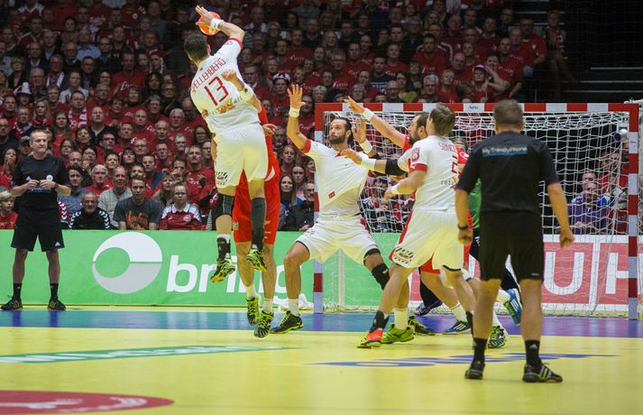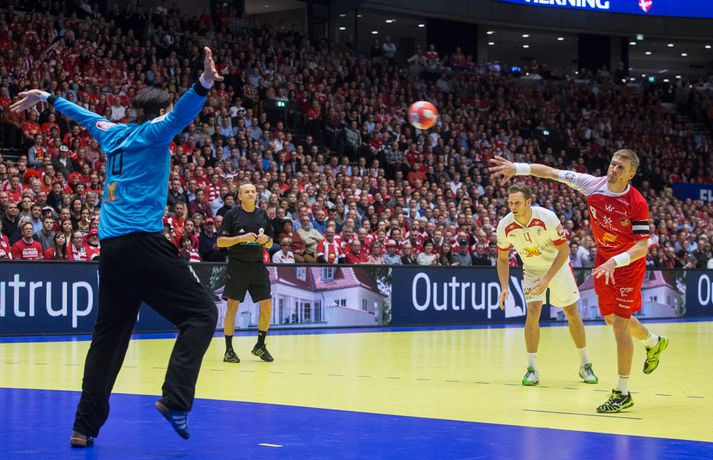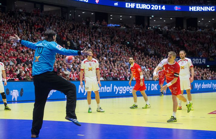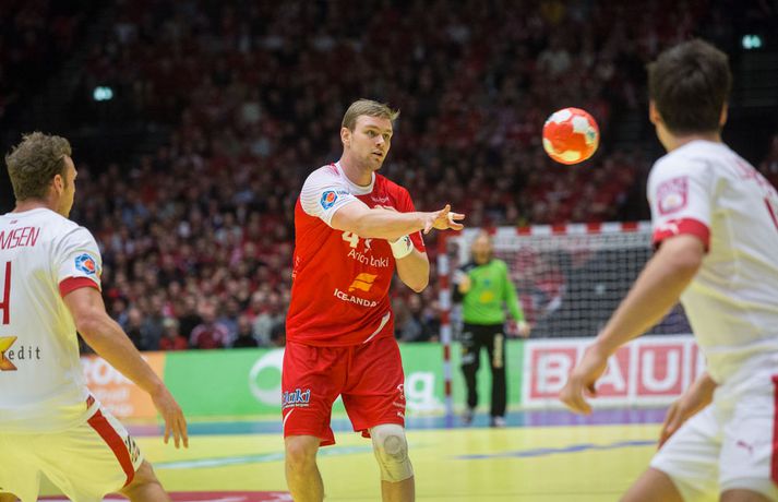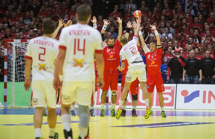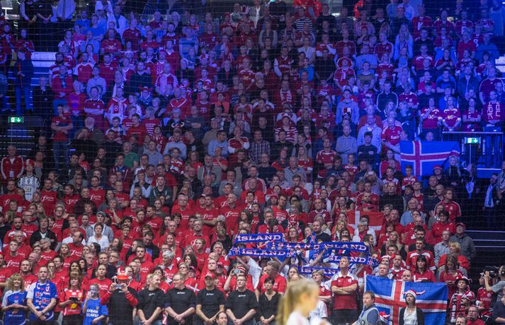 Ísland tapaði fyrir Danmörku í lokaleik milliriðlakeppninnar á EM í handbolta, 32-23, þar sem heimamenn í Herning fóru á kostum fyrir troðfullri höll. Leikurinn hafði þó enga þýðingu fyrir liðin enda var ljóst fyrir leikinn að Danmörk myndi enda í efsta sæti riðilsins og Ísland því þriðja, óháð því hver niðurstaðan yrði í kvöld. Strákarnir eiga þó enn einn leik eftir á mótinu en það er gegn Póllandi á föstudaginn. Í húfi er fimmta sætið á EM sem væri frábær árangur hjá strákunum okkar.Daníel Rúnarsson, ljósmyndari Vísis og Fréttablaðsins, var í Herning í kvöld og tók þessar myndir.vísir/daníel