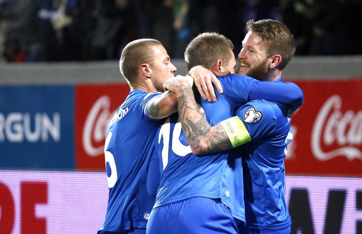 Strákarnir fagna í klefanum eftir leik - myndband Lars Lagerback upplýsti á blaðamannafundi eftir leik hver stjórnaði fagnaðarlátunum inni í klefa. Þar væri á ferðinni mikið skemmtikraftur. 13. október 2014 22:21
