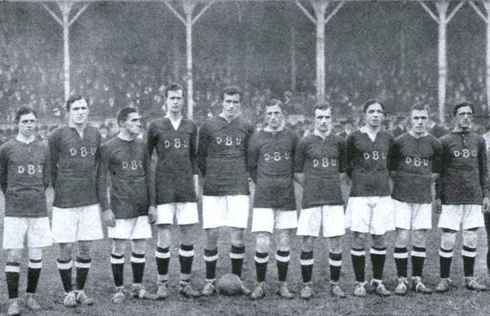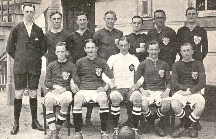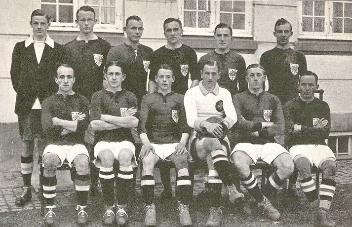 Fyrsti landsliðsmaðurinn Stefán Pálsson skrifar 3. apríl 2016 11:00 Samúel Thorsteinsson annar til vinstri á myndinni. Í síðustu viku töpuðum við Íslendingar enn og aftur fyrir Dönum. Það voru svo sem ekki óvænt tíðindi. Þetta var 24. knattspyrnulandsleikur landanna í karlaflokki og enn er Ísland án sigurs. Miðað við erkifjendur verður að játast að keppnissagan er býsna einhliða. Þó hafa Íslendingar stundum séð til sólar í viðureignum við Dani. Frægasta dæmið er þó að verða hundrað ára gamalt.Skipulögð knattspyrnukeppni hófst á Íslandi árið 1912 með þriggja liða Íslandsmóti. Nánast um leið fóru reykvískir fótboltamenn að láta sig dreyma um að spreyta sig gegn útlendingum: helst Englendingum eða Skotum sem taldir voru sparkvissastir allra, en til vara Dönum, sem þóttu líka harla góðir. Fyrri heimsstyrjöldin truflaði öll slík áform, en um leið og friður komst á í Evrópu hófu Reykjavíkurliðin Fram og KR að leita fyrir sér um erlenda gesti. Fyrir valinu varð Kaupmannahafnarliðið Akademisk Boldklub, betur þekkt undir skammstöfuninni AB. Eins og nafnið gefur til kynna var AB lið stúdenta og kennara við Kaupmannahafnarháskóla og varð Danmerkurmeistari í fyrsta sinn árið 1919, skömmu áður en það hélt í Íslandsför sína. Ákvörðunin um að bjóða AB hafði þó verið tekin áður en félagið hampaði meistaratitlinum og því um hálfgerða hundaheppni skipuleggjendanna að ræða.Einstakir hæfileikar Íþróttablaðið Þróttur, sem ÍR-ingar gáfu út, fjallaði ítarlega um heimsóknina í aðdraganda hennar og sagði lesendum sínum deili á væntanlegum gestum. Voru mannlýsingarnar bráðskemmtilegar og hefðu sómt sér vel í hvaða Íslendingasögu. Þannig var læknastúdentinum Sv. Holm lýst að hann væri „…?lítill vexti en sterkur og harðger. Hann er mjög lipur knattreki og næsta þrautseigur.“ Mestar vonir batt ritstjóri Þróttar þó við að fá að sjá stærðfræðiprófessorinn Harald Bohr. Harald var kunnur vísindamaður, þrátt fyrir að standa nokkuð í skugga bróður síns, eðlisfræðingsins Níelsar Bohr. Þeir bræðurnir léku báðir um tíma með AB. Níels sem markvörður en Harald sem aðalmarkaskorari. Voru frásagnir af afrekum hans ævintýralegar í meira lagi:„Í eitt skifti fékk hann tíu þúsundir manna til að æpa fagnaðaróp og klappa í tíu mínútur. Það var í miklum og tvísýnum kappleik við Englendinga, að Bohr rak knöttinn af mikilli snild fram hjá tveimur mótherjum. Fólkið var mjög hrifið. En nú hafði Bohr mist vasaklút sinn – og í staðinn fyrir að skora mark, snýr Bohr nú við, rekur knöttinn til baka og sleppur aftur fram hjá Englendingunum, nær vasaklútnum og rekur nú knöttinn í þriðja sinni fram hjá Bretanum, – sem stóð og glápti af undrun – og beina leið í mark.“ Því miður brást sú von greinarhöfundar að sjá stærðfræðinginn stórkostlega, því Harald Bohr var ekki í leikmannahópi AB sem kom til Reykjavíkur. Þar var þó margt snjallra leikmanna sem settu svip á bæinn. Reykjavík var raunar með alþjóðlegasta móti þessa sumardaga, því á sama tíma var þar staddur danskur kvikmyndatökuhópur til að festa á filmu Sögu Borgarættarinnar eftir Gunnar Gunnarsson. Hefur rithöfundurinn Ólafur Gunnarsson dregið upp skýra mynd af atburðum þessara vikna í skáldsögu sinni Höfuðlausn.Á hestbaki Danirnir reyndust algjörir ofjarlar íslensku félagsliðanna og unnu stórsigra á Fram, KR og sameiginlegu liði Vals og Víkings. Markatalan í leikjunum þremur var 23:2 gestunum í vil. Fjórða viðureignin var svo gegn úrvalsliði Reykjavíkurliðanna og þar urðu heldur betur óvænt úrslit, Íslendingarnir unnu 4:1. Leikurinn fór fram í úrhellisrigningu og var í snarhasti skipulögð önnur viðureign, þar sem danska liðið kom fram hefndum. Íslendingar jafnt sem Danir áttu bágt með að trúa úrslitunum í fjórða leiknum, þótt heimamenn væru að sönnu vanari gegnblautum malarvelli en gestirnir. Kallaði þetta á sérstakar skýringar og fannst afsökunin fljótt: daginn áður höfðu dönsku gestirnir haldið í reiðtúr suður í Hafnarfjörð og voru illa þjakaðir af harðsperrum og rasssæri. Með tímanum varð sagan um reiðtúrinn afdrifaríka höfð til marks um sérstök klókindi gestgjafanna. Lægra var hvíslað um aðra skýringu: þá að í Hafnarfirði var slegið upp veislu og fengu sumir ferðalanganna sér óþarflega vel neðan í því. Sem fyrr segir, var það ekki danska meistaratignin sem varð þess valdandi að AB var boðið til Íslands fyrstu erlendra knattspyrnufélaga. Ástæðan var miklu fremur persónuleg tengsl. Í liði AB var nefnilega Íslendingurinn og læknaneminn Samúel Thorsteinsson. Samúel var sonur Péturs J. Thorsteinssonar, einhvers umsvifamesta athafnamanns á Íslandi um aldamótin 1900. Pétur byggði upp verslunar- og fiskvinnsluveldi sitt á Bíldudal, en var með annan fótinn í Danmörku. Hann átti fjölda barna, þar á meðal listamanninn Guðmund eða Mugg. Muggur lék einmitt eitt aðalhlutverkið í Sögu Borgarættarinnar, svo ekki er útilokað að danski kvikmyndatökuleiðangurinn hafi orðið enn frekari hvati til að knattspyrnuflokkur AB mætti á svæðið.Fótboltafjölskylda Flest af börnum Péturs voru listfeng, þótt ekki yrðu þau þjóðfræg fyrir þá iðju líkt og Muggur. Bræður hans þrír kynntust hins vegar allir fótbolta í Danmörku og urðu afburðamenn á því sviði. Yngstur var Friðþjófur, sem var mesti markaskorarinn á upphafsárum íslenskrar knattspyrnu. Hann skoraði til dæmis bæði mörk Fram í 2:0 sigri á KR í vígsluleik Melavallarins þann 17. júní 1911, en sú viðureign er oft sögð fyrsti opinberi knattspyrnuleikurinn. Þá skoraði hann helming marka reykvíska úrvalsliðsins í 