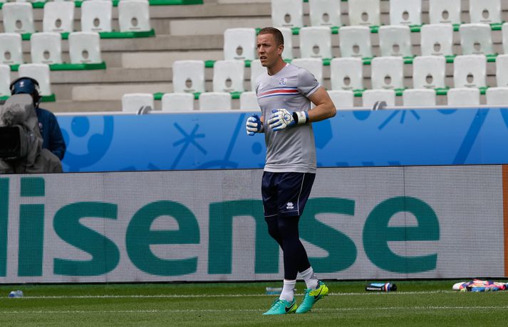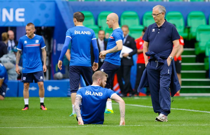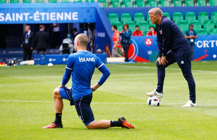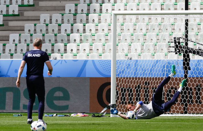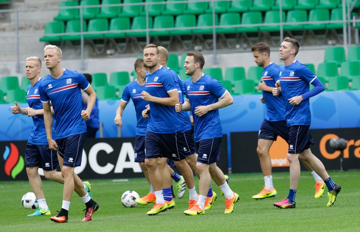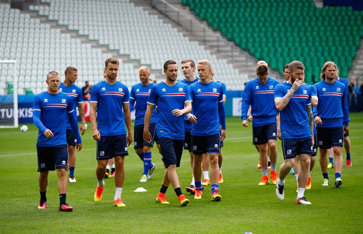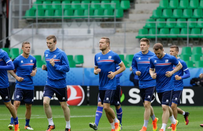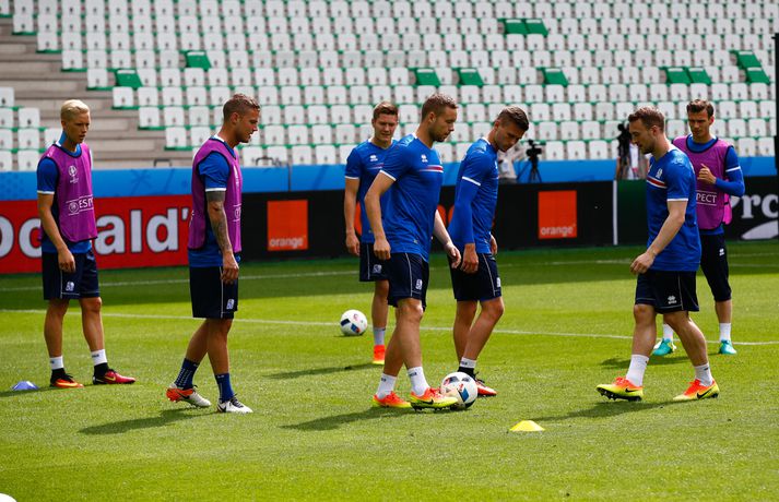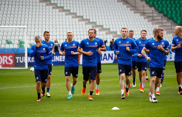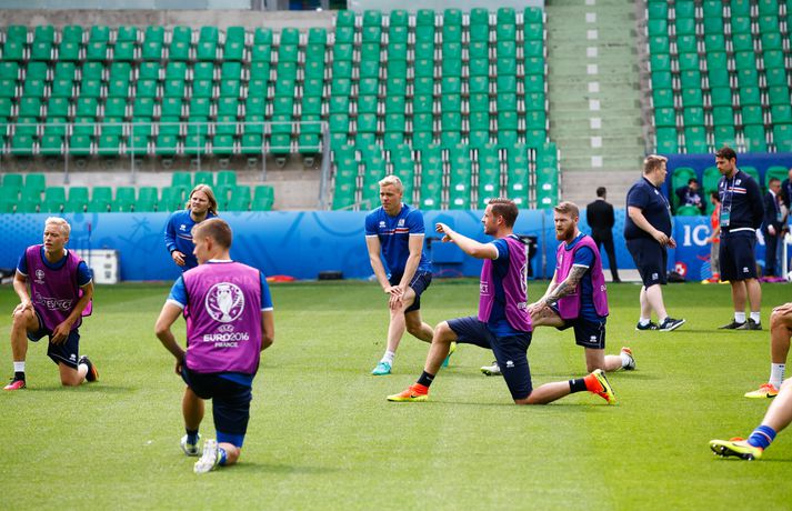 Leikmenn karlalandsliðsins í knattspyrnu æfðu í fyrsta skipti á Stade Geoffroy-Guichard leikvanginum í Saint-Étienne síðdegis í dag. Æfingin fór fram að loknum blaðamannafundi með þjálfurunum Heimi og Lars og miðjumönnunum Aroni Einari og Gylfa Þór. Að neðan má sjá upptöku UEFA frá æfingu landsliðsins. Blaðamannafundinn í heild sinni má sjá hér að neðan en hann var í beinni útsendingu á Vísi Æfing strákanna okkar var opin og nýtti Vilhelm Gunnarsson, ljósmyndari Fréttablaðsins og Vísis, tækifærið og myndaði strákana í bak og fyrir. Æfingin hófst á hefðbundin hátt með léttu skokki og reitarbolta.Ekki missa af neinu sem gerist á EM í Frakklandi. Vísir er með hóp fjölmiðlamanna á mótinu sem færa ykkur allar nýjustu fréttirnar af strákunum okkar. Fylgdu okkur á Facebook, Twitter og Snapchat (sport365).