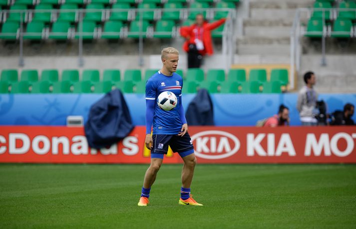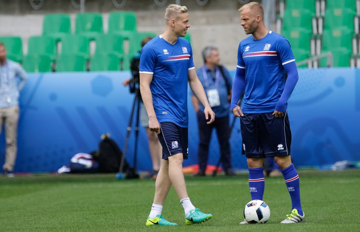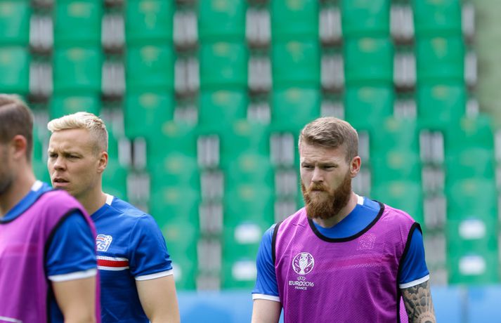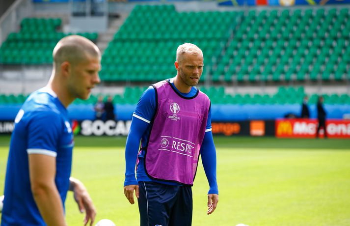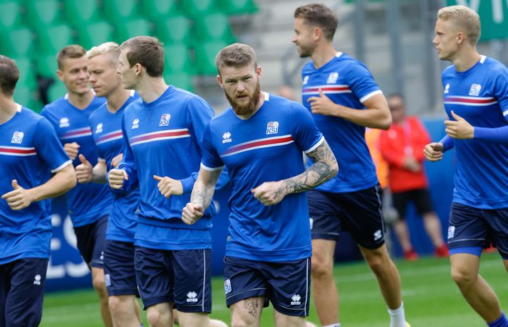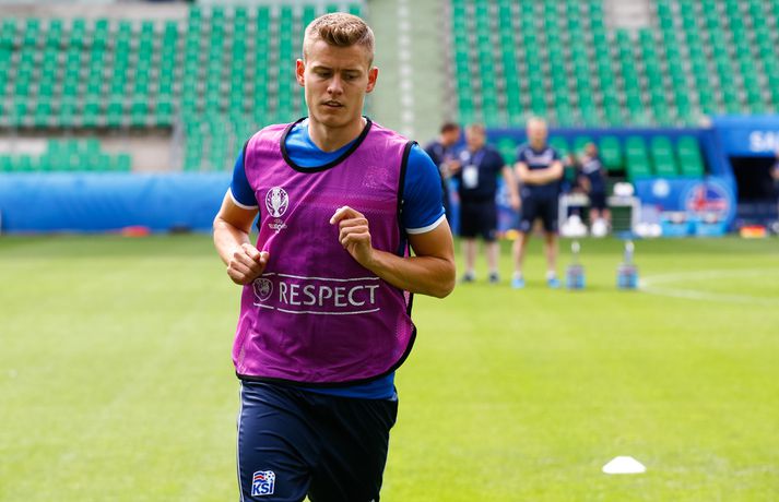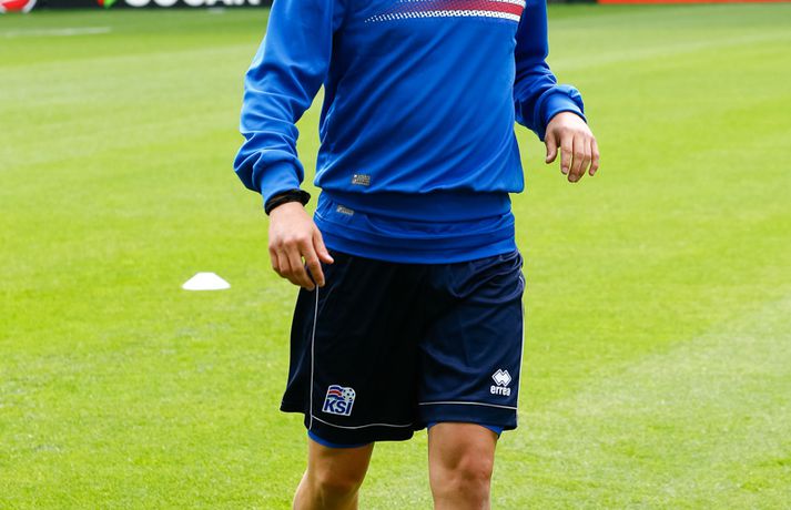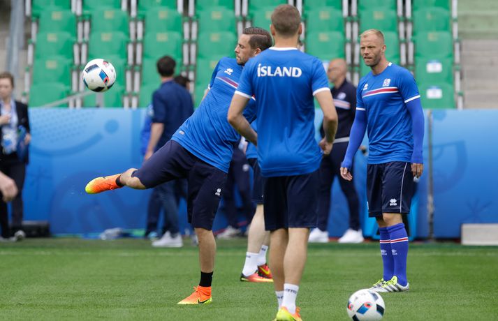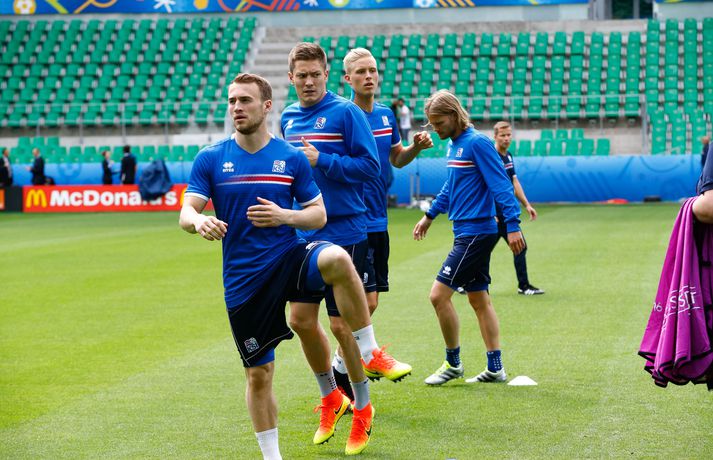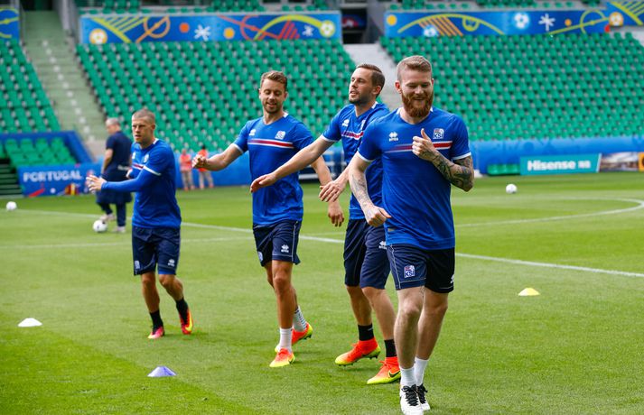 Sjáðu myndirnar: Strákarnir æfðu á Stade Geoffroy-Guichard Kolbeinn Tumi Daðason skrifar 13. júní 2016 16:15 Jóhann Berg Guðmundsson fær selbita frá Emil Hallfreðssyni og félögum. Vísir/Vilhelm Leikmenn karlalandsliðsins í knattspyrnu æfðu í fyrsta skipti á Stade Geoffroy-Guichard leikvanginum í Saint-Étienne síðdegis í dag. Æfingin fór fram að loknum blaðamannafundi með þjálfurunum Heimi og Lars og miðjumönnunum Aroni Einari og Gylfa Þór. Að neðan má sjá upptöku UEFA frá æfingu landsliðsins. Blaðamannafundinn í heild sinni má sjá hér að neðan en hann var í beinni útsendingu á Vísi Æfing strákanna okkar var opin og nýtti Vilhelm Gunnarsson, ljósmyndari Fréttablaðsins og Vísis, tækifærið og myndaði strákana í bak og fyrir. Æfingin hófst á hefðbundin hátt með léttu skokki og reitarbolta.Ekki missa af neinu sem gerist á EM í Frakklandi. Vísir er með hóp fjölmiðlamanna á mótinu sem færa ykkur allar nýjustu fréttirnar af strákunum okkar. Fylgdu okkur á Facebook, Twitter og Snapchat (sport365). EM 2016 í Frakklandi Mest lesið Grafalvarleg staða: „Þurfum að fara í sársaukafullar aðgerðir“ Handbolti Ógeðslega erfitt og ógeðslega vont en brosir oft í viku á eftir Sport Fram þvertekur fyrir metnaðarleysi og leitar að nýjum þjálfurum Íslenski boltinn „Nú er nóg komið“ Fótbolti Skortir Liverpool breidd þrátt fyrir gríðarleg fjárútlát síðasta sumar? Enski boltinn Nefna greinar Íslandsmótsins í CrossFit í höfuðið á íslenskum íþróttakonum Sport Arnór Snær snýr aftur heim Handbolti Sádar eru ekki að fara að byggja HM-leikvang ofan á skýjakljúfi Fótbolti Besta handboltadeild heims missir aðalstyrktaraðila sinn Handbolti Eldgos og brjósklos skapa óvissu: „Vonum bara að móðir náttúra leyfi þetta“ Sport Fleiri fréttir Mikilvægt fyrir United að hamra járnið meðan það er heitt Félagið í greiðslustöðvun en borgaði öll laun degi fyrr Bretinn ráðinn tæknilegur ráðgjafi hjá Val Fram þvertekur fyrir metnaðarleysi og leitar að nýjum þjálfurum Nýr þjálfari Juventus er með Napoli-húðflúr „Nú er nóg komið“ Skortir Liverpool breidd þrátt fyrir gríðarleg fjárútlát síðasta sumar? Sádar eru ekki að fara að byggja HM-leikvang ofan á skýjakljúfi Hetja Englands á EM sleit krossband Lofar frekari fjárfestingum Juventus ræður Spalletti út tímabilið Meistaradeildin skiptir um bjór og Heineken snýr sér að padel Aron Einar kominn á toppinn Tölur úr Bestu: Hallgrímur Mar bjó til langflest færi Fantasýn: „Þessi vörn er eitthvað skrímsli“ Scholes hættir og setur einhverfan son sinn í fyrsta sætið Rúmar tvær milljónir í boði ef þú finnur hundinn hans Aarons Ramsey Carrick í einkaviðtali: Sigurinn á Anfield stór stund fyrir Man. Utd Hefur spilað 16 mínútur og fengið tvö rauð spjöld Bættu Evrópumet AC Milan liðsins með Gullit og Van Basten innanborðs Slot: Engin auka pressa við þetta tap Real Madrid vill stórar skaðabætur frá UEFA „Mjög sáttur með samninginn“ „Hefði séð eftir því alla ævi“ Magnús Már í viðræðum við HK Bað alla nema þjálfarann afsökunar Vísar slúðrinu til föðurhúsanna Ísak Bergmann lagði upp gegn Bayern „Við tókum bara þá ákvörðun að fara í Svanavatnið“ Albert og Mikael Egill í vondum málum á Ítalíu Sjá meira