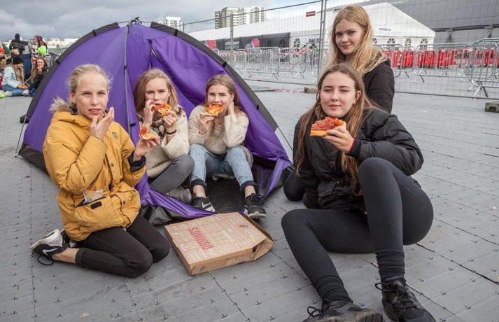 Annan daginn í röð byrjaði röð að myndast fyrir utan Kórinn í Kópavogi en Justin Bieber stígur aftur á svið þar í kvöld. Búist er við nítján þúsund manns á tónleikunum í kvöld og sennilega verða örlítið fleiri í kvöld en í gærkvöldi. Fyrstu gestirnir mættu eldsnemma í morgun og þurfa því að bíða þar í marga klukkutíma áður en hleypt verður inn í höllina klukkan fimm. Að þessu sinni mættu starfsmenn Dominos á svæðið og gáfu þeim sem voru í röðinni pítsu um hádegisbilið í dag. Eðlilega voru krakkarnir mjög ánægðir með uppátækið og borðuðu pítsurnar af bestu list. Hér að neðan má sjá myndir af sáttum krökkum í röðinni en það hefur rignt töluvert meira í dag en í gær á þá aðila sem eru í röðinni.