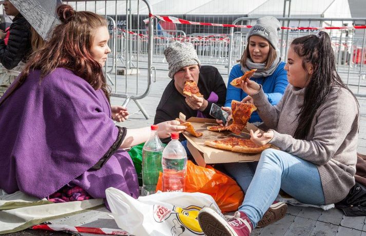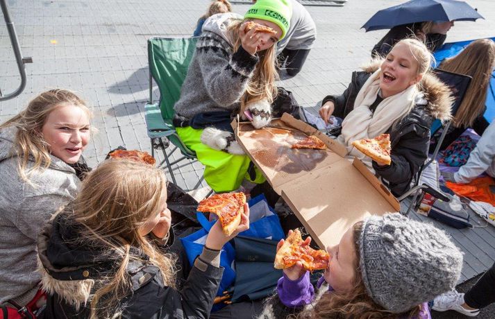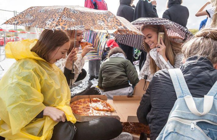 Hafa beðið eftir Justin Bieber í rigningunni í allan dag: Fengu gefins pítsur Stefán Árni Pálsson skrifar 9. september 2016 16:45 Þessar voru sáttar. Myndir/mummi LÚ Annan daginn í röð byrjaði röð að myndast fyrir utan Kórinn í Kópavogi en Justin Bieber stígur aftur á svið þar í kvöld. Búist er við nítján þúsund manns á tónleikunum í kvöld og sennilega verða örlítið fleiri í kvöld en í gærkvöldi. Fyrstu gestirnir mættu eldsnemma í morgun og þurfa því að bíða þar í marga klukkutíma áður en hleypt verður inn í höllina klukkan fimm. Að þessu sinni mættu starfsmenn Dominos á svæðið og gáfu þeim sem voru í röðinni pítsu um hádegisbilið í dag. Eðlilega voru krakkarnir mjög ánægðir með uppátækið og borðuðu pítsurnar af bestu list. Hér að neðan má sjá myndir af sáttum krökkum í röðinni en það hefur rignt töluvert meira í dag en í gær á þá aðila sem eru í röðinni. Justin Bieber á Íslandi Tengdar fréttir Bein útsending: Aðdáendur Justin Bieber streyma í Kórinn Justin Bieber er mættur og stígur á sviðið í kvöld. 8. september 2016 14:45 Justin Bieber hélt fallega ræðu, þakkaði guði og söng síðan Purpose - Myndband "Að vera á tónleikaferðalagi getur verið erfitt en það er líka eitthvað það mest gefandi í lífinu,“ sagði tilfinningaríkur Justin Bieber í Kórnum í gær áður en hann tók lagið Purpose. 9. september 2016 10:15 Einlægur Bieber slítur barnsskónum Það var þaulvanur flytjandi sem steig á svið í Kórnum í Kópavogi á slaginu hálf níu í gærkvöldi. 9. september 2016 09:45 Einkaviðtal Fréttablaðsins: Hakk og spagettí uppáhaldsmatur Justin Bieber Hinn klassíski ítalski réttur, Spaghetti Bolognese, eða hakk og spagettí er uppáhaldsmatur poppstjörnunnar Justin Bieber. 8. september 2016 14:15 Fyrstu tónleikagestirnir mættir: „Búnar að bíða eftir honum í níu ár“ Þórey og Ragnheiður eru miklir aðdáendur. 8. september 2016 09:02 Bieber var víkingaklappaður upp og tók síðan Sorry í rigningunni - Myndband Víkingaklappið er að verða einskonar einkennismerki Íslendinga um heim allan. Frá því á EM í Frakklandi í sumar hafa Íslendingar og margir aðrir notað klappið ópspart. 9. september 2016 10:50 Justin Bieber elskar að vera einn í náttúrunni Tónleikarnir í Kórnum í gærkvöldi voru þeir fyrstu á ferðalagi Biebers um Evrópu þar sem hann fylgir eftir nýjustu plötu sinni, Purpose. 9. september 2016 07:15 Mest lesið Hvað þýðir „six-seven“? Lífið Meðalmennskan plagar Brján Gagnrýni Aldrei of seint að prófa sig áfram Tíska og hönnun Kynslóðabilið kom í ljós þegar umræðan beindist að blautbolakeppni Lífið Vafðist tunga um tönn þegar Bond bar á góma Bíó og sjónvarp Hótelstjóri Hótels Tindastóls er allur Bíó og sjónvarp Skein skært í sögulegum gleðikonukjól Tíska og hönnun Smáforrit til að deila heimilisverkum: „Fæ þrjú stig fyrir að þurrka af á heimilinu“ Lífið Troðningur á yfirfullri opnun: „Þetta var svolítið kreisí“ Lífið Fékk lífið til baka á korteri eftir tólf ár af sársauka Lífið Fleiri fréttir Eitt glæsilegasta hús Reykjavíkur til sölu „Þetta er það fallegasta sem einhver hefur sagt um mig“ Hvað þýðir „six-seven“? Smáforrit til að deila heimilisverkum: „Fæ þrjú stig fyrir að þurrka af á heimilinu“ Kynslóðabilið kom í ljós þegar umræðan beindist að blautbolakeppni Ljúffengar banana- og kakóbollakökur í nestisboxið Troðningur á yfirfullri opnun: „Þetta var svolítið kreisí“ Pétur Kr. og Ingibjörg selja 270 fermetra eign við Ægisíðu Barist upp á líf og dauða „Get ekki hætt að hugsa um bragðarefinn sem hann pantaði“ Langþráður draumur verður að veruleika Samsæriskenningar notaðar sem stjórntæki Stjörnulífið: „Dagur sem mun aldrei gleymast“ Gisti hálft ár á sófum hjá bekkjarfélögum Betra að vera blankur nemi í New York Kynlífið innantómt með öðrum en fyrrverandi Fékk lífið til baka á korteri eftir tólf ár af sársauka Staðfesta loks sambandið Einar og Milla skírðu drenginn Með blæðandi hjarta og ber örin með stolti Krakkatían: Kvennafrídagurinn, Ólsen ólsen og málsháttur Áslaug Arna kom alblóðug inn í sjúkratjaldið Upplifði stöðugan ótta við helvíti í samfélagi múslima í Svíþjóð Getur alls ekki verið einn Fréttatía vikunnar: Ungfrú Ísland Teen, Louvre-þjófnaður og hrukkur Myndaveisla: Troðfullur miðbær á kvennafrídegi Borgarfulltrúi bjargaði stolnum barnavagni „Segið að ég sé samkynhneigður en ekki ljúga með hitt“ Notaði ákveðinn mat til að hjálpa í krabbameinsmeðferðinni „Konu“ tónleikar í Hvolnum á Hvolsvelli í kvöld Sjá meira