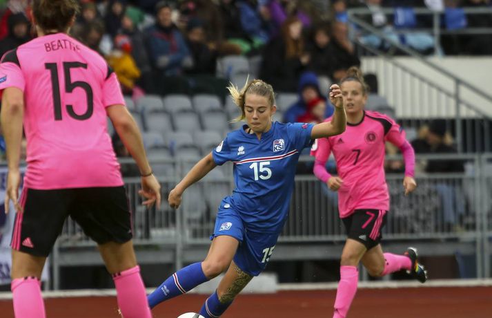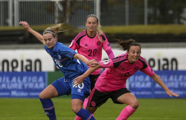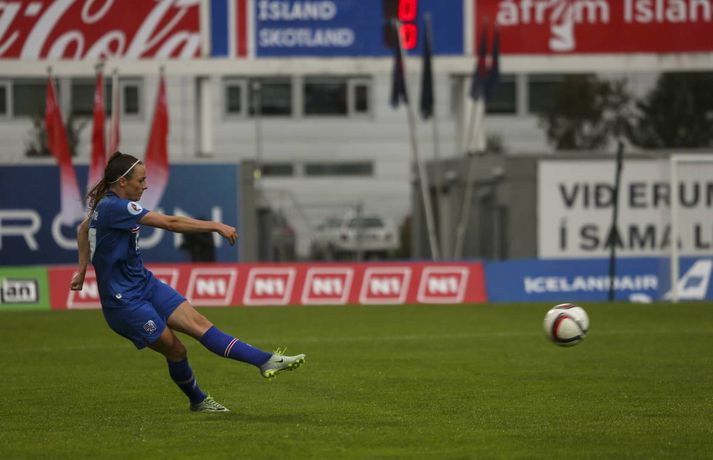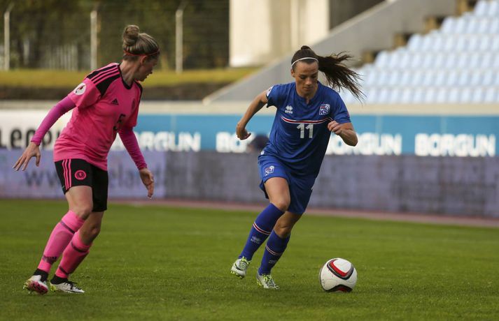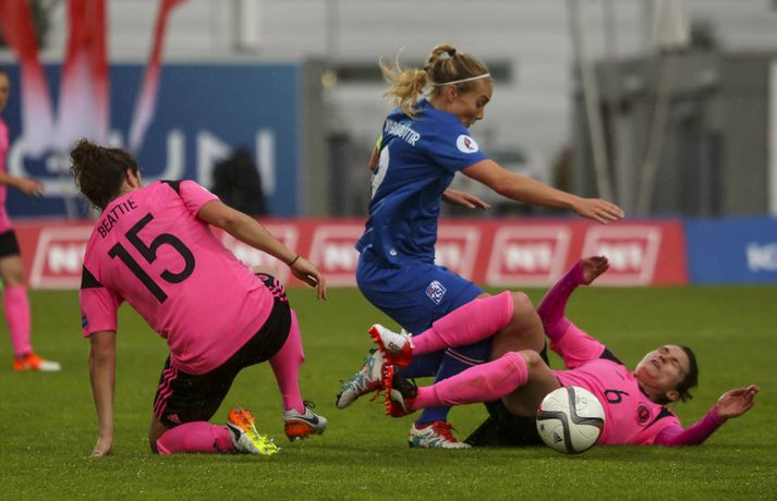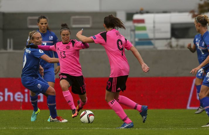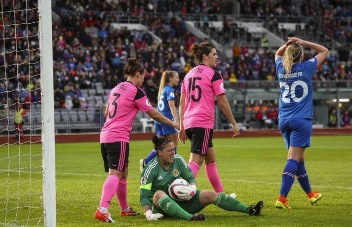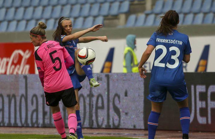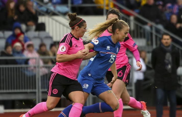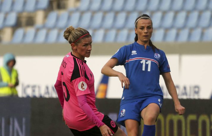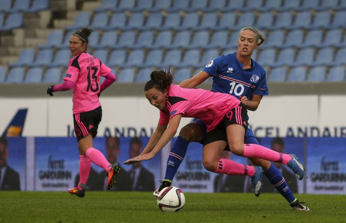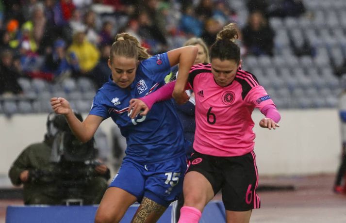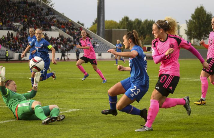 Ísland tapaði fyrir Skotlandi, 2-1, í lokaleik kvennalandsliðið í riðlinum fyrir undankeppni EM í Hollandi næsta sumar, en Ísland hafði þegar tryggt sig inn á mótið. Þrátt fyrir tapið í dag hélt Ísland toppsætinu, en liðið tapaði einungis einum leik í riðlinum og það var leikurinn í kvöld. Ísland, sem hafði haldið hreinu í öllum níu leikjunum í undankeppninni fyrir þennan, fékk á sig fyrsta markið á 25. mínútu leiksins, en Fanndís Friðriksdóttir jafnaði fyrir hlé. Jane Ross skoraði sigurmarkið af vítapunktinum á 56. mínútu. Ein breyting var gerð á íslenska liðinu frá 4-0 sigrinum á Slóveníu á föstudaginn, en Elín Metta Jensen kom inn á hægri kantinn í stað Hólmfríðar Magnúsdóttur sem fékk sér sæti á bekknum. Skotarnir byrjuðu mikið betur en íslenska liðið og réðu algjölega ferðinni. Ísland náði lítið sem ekkert að halda boltanum og þegar Ísland fékk loksins boltann gáfu þær boltann rakleiðis útaf. Gestirnir höfðu ógnað með frábærum fyrirgjöfum og það kom ekki mikið á óvart þegar Skotland komst yfir með marki eftir eina slíka. Emma Mitchell gaf þá frábæra fyrirgjöf fyrir markið og Jane Ross skallaði boltann í netið og var þar af leiðandi fyrst til að skora á Ísland í undankeppninni. Frammistaða Íslands var langt frá því að vera sannfærandi í fyrri hálfleik, en liðinu gekk afar illa að halda boltanum. Það var því dálítið gegn gangi leiksins þegar Fanndís Friðriksdóttir jafnaði metin með laglegri vippu yfir markvörð Skota, en Fanndís fékk góða sendingu inn fyrir frá Berglindi Björgu. Staðan 1-1 þegar liðin gengu til búningsherbergja og gat íslenska liðið prísað sig sæla að vera með jafna stöðu í hálfleik enda voru Skotar með tögl og haldir á fyrri hálfleik, fyrir utan síðustu fimm mínúturnar í fyrri hálfleik, en Ísland með svona gott sóknarlið getur alltaf refsað fyrir mistök og það gerði Fanndís. Allt annað var að fylgjast með íslenska liðinu í síðari hálfleik. Boltinn gekk hraðar, sóknirnar voru beinskeyttari, hreyfaleikinn var meiri, en Skotarnir áttu þó bestu tilraunina í upphafi síðari hálfleiks þegar Caroline Weir þrumaði boltanum í stöngina af löngu færi. Það voru hins vegar Skotarnir sem náðu aftur forystunni þegar Jane Ross skoraði annað mark sitt og Skota, en hún skoraði af vítapunktinum eftir að Sara Björk Gunnarsdóttir braut á Lisu Evans innan teigs. Fljótlega eftir markið gerðu þeir Freyr Alexandersson og Ásmundur Haraldsson, þjálfarar Íslands, tvöfalda breytingu og með Gunnhildi kom mikið líf inn á miðsvæðið, en hún var afar dugleg og færði íslenska liðinu mikin kraft. Dagný Brynjarsdóttir fékk gott tækifæri til að jafna metin, en brást bogalistinn. Okkar stúlkum gekk ekki alveg nægilega vel að skapa sér afgerandi marktækifæri, en tækifærin til þess að búa til góð færi voru sannarlega til staðar. Lokatölur urðu 2-1 sigur Skotland og fyrsta tapið og fyrstu mörkin sem Ísland fær á sig riðlinum staðreynd í lokaleiknum. Þrátt fyrir tapið varð Ísland efst í riðlinum, en stelpurnar voru með betri markatölu en Skotland sem lenti í öðru sætinu. Spilamennskan var ekki góð í dag, þá sérstaklega í fyrri hálfleik, en jafntefli hefði ekki verið ósanngjörn úrslit. Staðreyndin er samt sú að Ísland er á leið á EM í þriðja skiptið í röð næsta sumar og nú hefst undirbúningur fyrir lokamótið með tilheyrandi æfingarleikjum og slíku. Stelpurnar hafa staðið sig vel í riðlinum og eru vel að þessu komnar, þrátt fyrir tapið í kvöld. vísir/ernirvísir/ernir