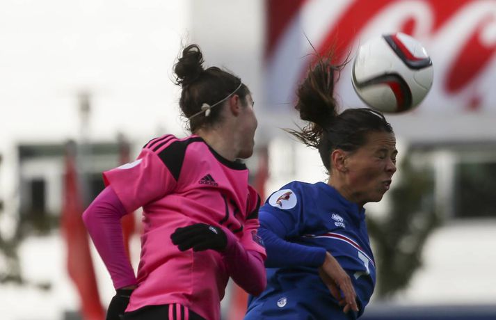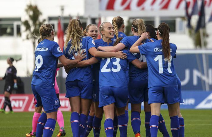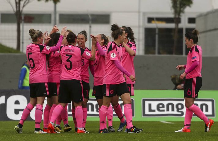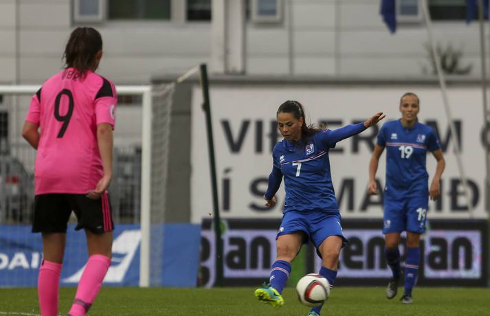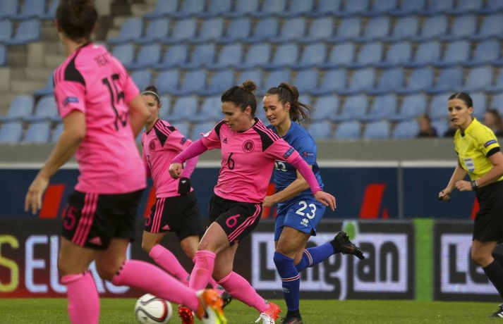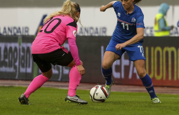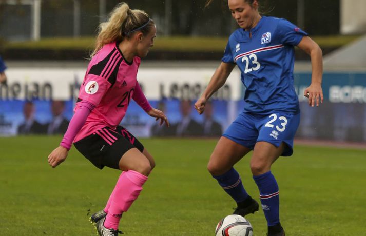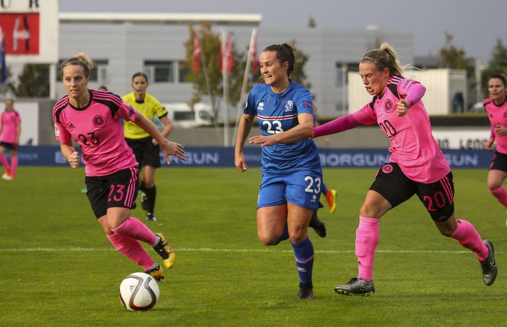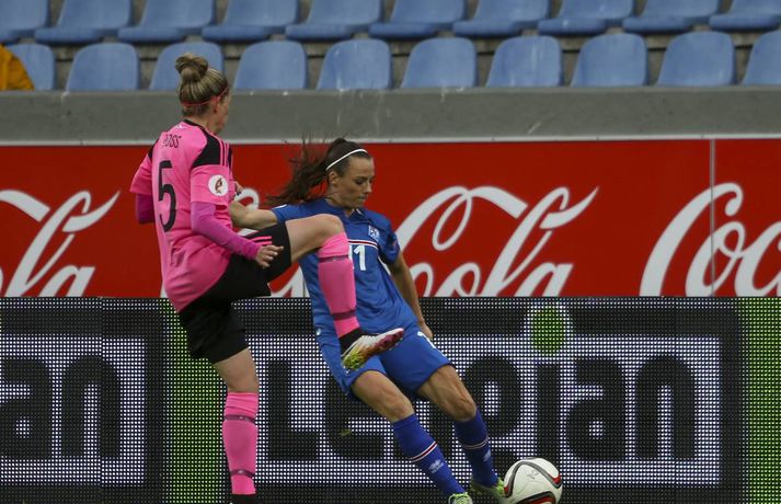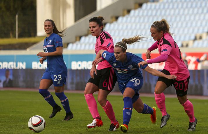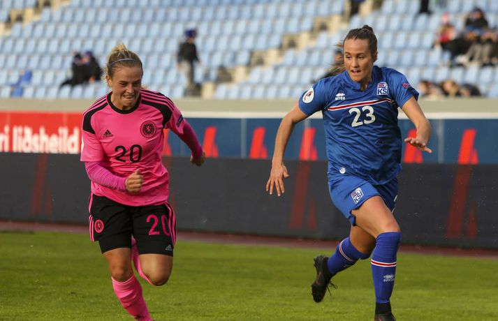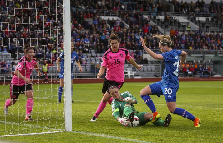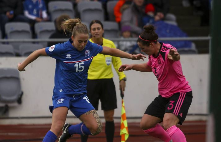 Ísland tapaði fyrir Skotlandi, 2-1, í lokaleik kvennalandsliðið í riðlinum fyrir undankeppni EM í Hollandi næsta sumar, en Ísland hafði þegar tryggt sig inn á mótið. Þrátt fyrir tapið í dag hélt Ísland toppsætinu, en liðið tapaði einungis einum leik í riðlinum og það var leikurinn í kvöld. Ísland, sem hafði haldið hreinu í öllum níu leikjunum í undankeppninni fyrir þennan, fékk á sig fyrsta markið á 25. mínútu leiksins, en Fanndís Friðriksdóttir jafnaði fyrir hlé. Jane Ross skoraði sigurmarkið af vítapunktinum á 56. mínútu. Ein breyting var gerð á íslenska liðinu frá 4-0 sigrinum á Slóveníu á föstudaginn, en Elín Metta Jensen kom inn á hægri kantinn í stað Hólmfríðar Magnúsdóttur sem fékk sér sæti á bekknum. Skotarnir byrjuðu mikið betur en íslenska liðið og réðu algjölega ferðinni. Ísland náði lítið sem ekkert að halda boltanum og þegar Ísland fékk loksins boltann gáfu þær boltann rakleiðis útaf. Gestirnir höfðu ógnað með frábærum fyrirgjöfum og það kom ekki mikið á óvart þegar Skotland komst yfir með marki eftir eina slíka. Emma Mitchell gaf þá frábæra fyrirgjöf fyrir markið og Jane Ross skallaði boltann í netið og var þar af leiðandi fyrst til að skora á Ísland í undankeppninni. Frammistaða Íslands var langt frá því að vera sannfærandi í fyrri hálfleik, en liðinu gekk afar illa að halda boltanum. Það var því dálítið gegn gangi leiksins þegar Fanndís Friðriksdóttir jafnaði metin með laglegri vippu yfir markvörð Skota, en Fanndís fékk góða sendingu inn fyrir frá Berglindi Björgu. Staðan 1-1 þegar liðin gengu til búningsherbergja og gat íslenska liðið prísað sig sæla að vera með jafna stöðu í hálfleik enda voru Skotar með tögl og haldir á fyrri hálfleik, fyrir utan síðustu fimm mínúturnar í fyrri hálfleik, en Ísland með svona gott sóknarlið getur alltaf refsað fyrir mistök og það gerði Fanndís. Allt annað var að fylgjast með íslenska liðinu í síðari hálfleik. Boltinn gekk hraðar, sóknirnar voru beinskeyttari, hreyfaleikinn var meiri, en Skotarnir áttu þó bestu tilraunina í upphafi síðari hálfleiks þegar Caroline Weir þrumaði boltanum í stöngina af löngu færi. Það voru hins vegar Skotarnir sem náðu aftur forystunni þegar Jane Ross skoraði annað mark sitt og Skota, en hún skoraði af vítapunktinum eftir að Sara Björk Gunnarsdóttir braut á Lisu Evans innan teigs. Fljótlega eftir markið gerðu þeir Freyr Alexandersson og Ásmundur Haraldsson, þjálfarar Íslands, tvöfalda breytingu og með Gunnhildi kom mikið líf inn á miðsvæðið, en hún var afar dugleg og færði íslenska liðinu mikin kraft. Dagný Brynjarsdóttir fékk gott tækifæri til að jafna metin, en brást bogalistinn. Okkar stúlkum gekk ekki alveg nægilega vel að skapa sér afgerandi marktækifæri, en tækifærin til þess að búa til góð færi voru sannarlega til staðar. Lokatölur urðu 2-1 sigur Skotland og fyrsta tapið og fyrstu mörkin sem Ísland fær á sig riðlinum staðreynd í lokaleiknum. Þrátt fyrir tapið varð Ísland efst í riðlinum, en stelpurnar voru með betri markatölu en Skotland sem lenti í öðru sætinu. Spilamennskan var ekki góð í dag, þá sérstaklega í fyrri hálfleik, en jafntefli hefði ekki verið ósanngjörn úrslit. Staðreyndin er samt sú að Ísland er á leið á EM í þriðja skiptið í röð næsta sumar og nú hefst undirbúningur fyrir lokamótið með tilheyrandi æfingarleikjum og slíku. Stelpurnar hafa staðið sig vel í riðlinum og eru vel að þessu komnar, þrátt fyrir tapið í kvöld. vísir/ernirvísir/ernir