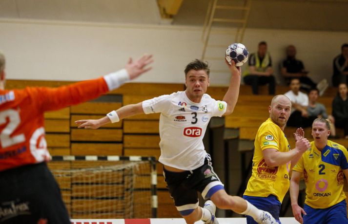 Það eru gríðarlega spennandi lokaumferðir framundan í Olís-deild karla en FH-ingar gerðu sitt og jöfnuðu Hauka og ÍBV að stigum með 28-20 sigri á Gróttu í dag en eftir það þýðir að öll þrjú liðin eru jöfn þegar aðeins tvær umferðir eru eftir. FH-ingar eru með örlögin í eigin höndum þegar stutt er eftir af tímabilinu en takist FH að vinna alla leikina þá verða þeir deildarmeistarar. Ernir Eyjólfsson, ljósmyndari Vísis og Fréttablaðsins, var í Kaplakrika og smellti af myndunum sem sjá má hér fyrir ofan. Seltirningar gátu aftur á móti gengið langt með að gulltryggja sæti sitt í deild þeirra bestu á næsta ári með sigri í dag en framundan voru tveir leiki gegn liðum í fallbaráttunni. Leikið var í Kaplakrika og voru heimamenn sterkari strax frá fyrstu mínútu en FH tók þriggja marka forskot inn í seinni hálfleikinn í stöðunni 13-10 og eftir það var ekki aftur snúið. FH-ingar bættu hægt og bítandi við forskotið og unnu að lokum átta marka sigur. Óðinn Þór Ríkharðsson var markahæstur í liði FH með sjö mörk og bætti Einar Rafn Eiðsson við fjórum mörkum en allir útivallarleikmenn FH nema einn komust á blað í leiknum. Í liði Gróttu var Elvar Friðriksson atkvæðamestur með fimm mörk en Finnur Ingi Stefánsson bætti við fjórum mörkum. FH-ingar eiga eftir að mæta Haukum og Selfyssingum í lokaumferðinni en örlögin eru áfram í þeirra höndum þegar skammt er til leiksloka. Það verður væntanlega svakaleg stemming í DB-Schenker höllinni á miðvikudaginn þar sem FH-ingar geta með sigri stigið risaskref í átt að deildarmeistaratitlinum.
