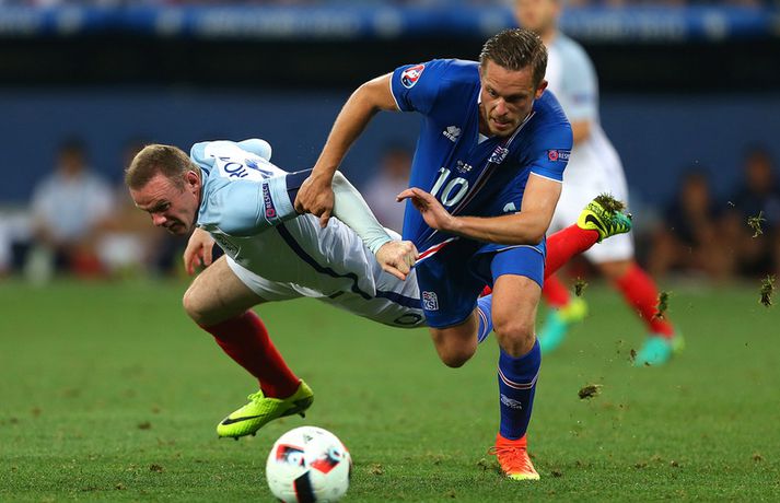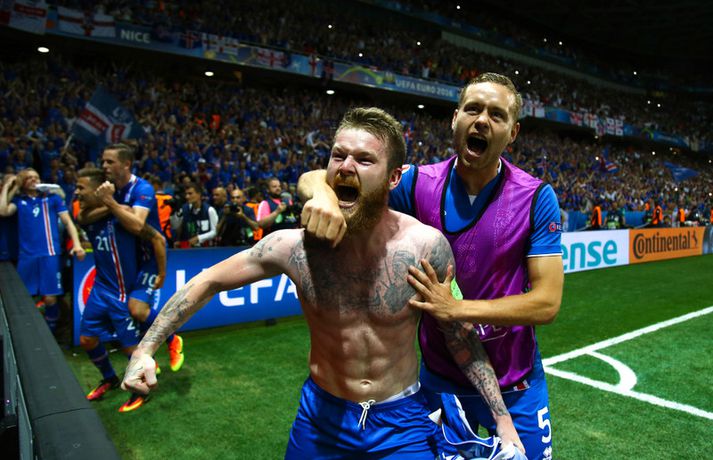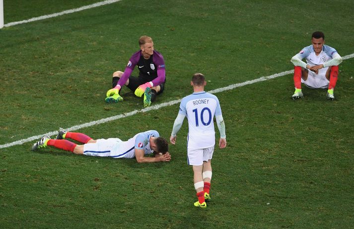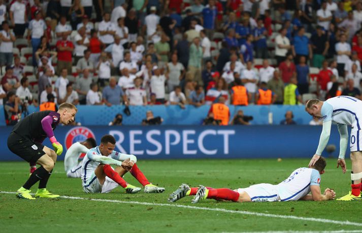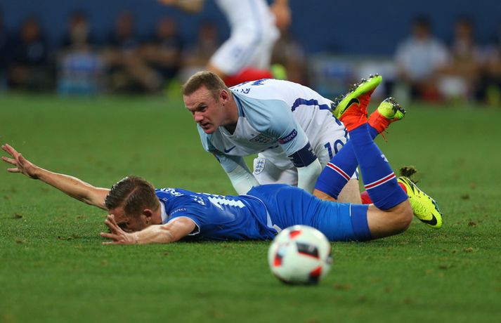 Englendingar eru ekki ennþá búnir að jafna sig eftir tapið á móti Íslandi í sextán liða úrslit Evrópumótsins síðasta sumar. Nú vitum við hinsvegar meira um hvað gerðist í klefa enska landsliðsins eftir leikinn fræga. Ísland vann þá 2-1 sigur í Nice og komst áfram í átta liða úrslitin á meðan stórstjörnur enska landsliðsins snéru aftur heim með skottið á milli lappanna. Þjálfarinn Roy Hodgson er ennþá atvinnulaus og það mun taka enska landsliðið tíma að jafna sig á áfallinu að tapa á móti litla Íslandi. Marcus Rashford er ein af framtíðarstjörnum enska landsliðsins og hann hefur nú sagt frá því hvað gerðist í búningsklefa enska landsliðsins eftir tapið á móti Íslandi 27. júní 2016. „Þegar við duttum út á móti Íslandi á EM þá voru það gríðarleg vonbrigði. Við sátum allir hljóðir í búningsklefanum eftir leikinn og vissum ekki alveg hvernig við áttum að haga okkur. Þá stendur Wayne upp og hann segir bara eitt,“ rifjar Marcus Rashford upp í viðtali við The Playerstribune.com. „Berið höfuðið hátt. Við höfum fyrir miklu að berjast í framtíðinni. Horfið fram á veginn,“ segir Rashford að Wayne Rooney hafi sagt eftir leikinn. Rooney gerði meira en það því að hann gekk á hvern mann fyrir sig, horfði í augu viðkomandi manns og endurtók þessi orð. Enska landsliðið hefur spilað fjóra keppnisleiki eftir tapið á móti Íslandi og unnið þrjá þeirra. Liðið vann Slóvakíu (1-0), Möltu (2-0) og Skotland (3-0) og gerði markalaust jafntefli við Slóveníu í fyrstu leikjum sínum í undanriðli HM í Rússlandi 2018. Mökrin sem Ragnar Sigurðsson og Kolbeinn Sigþórsson skoruðu hjá enska landsliðinu í Nice í júní 2016 eru ennþá tvö síðustu mörkin sem enska fótboltalandsliðið fékk á sig í keppnisleik því Englendingar hafa haldið hreinu í fjórum fyrstu leikjum sínum í undankeppni HM 2018.vísir/gettyVísir/Getty