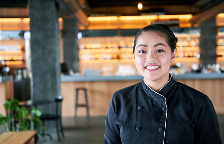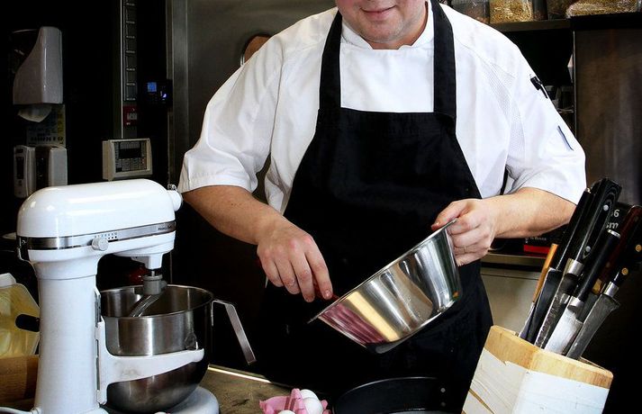 „Það er lítið mál að gera þessa ostaköku. Hún er hræðilega einföld og hrikalega góð. Svo er aukameðlæti með henni ef einhver vill spreyta sig, en takið eftir að það þarf að gera hvíta súkkulaðið daginn áður,“ segir Leifur Kolbeinsson matreiðslumeistari. Hann brást vel við þegar hann var beðinn um uppskrift að ljúffengum eftirrétti sem prýtt gæti páskaborð.Vigdís May Diem Vo, konditor.Vísir/Anton BrinkLeifur er nýbúinn að opna nýjan veitingastað, Marshall restaurant og bar á Grandagarði. Þar er Vigdís May Diem Vo konditor hans hægri hönd þegar kemur að kökum og það er hún sem á flest handtökin við kökuna sem hér birtist mynd af.Leifur Kolbeinsson kokkur í önnum í eldhúsinu. Vísir/GVASagan á bak við kökuna En Leifur lumar á lítilli sögu á bak við þessa köku. „Ég fékk þessa köku lánaða með góðum hætti á litlum veitingastað í San Sebastian á Spáni. Staðurinn heitir Lavina og á matseðlinum hjá mér skíri ég kökuna Ostakaka Lavína. Þetta er er lítill tapasbar og nánast það eina sem veitingamaðurinn gerir er að afgreiða þessa köku. Það er alltaf fullt þarna, alla daga og öll kvöld.“Ein fögur og ljúffeng.Vísir/Anton BrinkLeifur sýnir í raun ótrúlegt örlæti með því að gefa þjóðinni hlutdeild í þessu ævintýri. Hann útskýrir það svona. „Af því ég fékk kökuna lánaða svo fallega hjá Lavina þá gef ég hana áfram.“