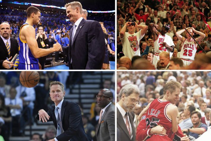 Curry og félagar tóku í nótt annað met af Jordan og Bulls-liðinu fræga Óskar Ófeigur Jónsson skrifar 5. apríl 2017 17:45 Steve Kerr sem þjálfari Golden State Warriors í dag og leikmaður Chicago Bulls í gamla daga. Vísir/Samsett/Getty Golden State Warriors vann síðustu nótt sinn 64. leik á tímabilinu í NBA-deildinni og bætti þar sem met sem var í eigu Chicago Bulls-liðsins frá 1995 til 1998. Þetta er ekki í fyrsta sinn sem Golden State tekur met af þessu liði Michael Jordan. Golden State Warriors hefur unnið 204 leiki á síðustu þremur tímabilum en Bulls-liðið vann 203 leiki á fyrrnefndum þremur tímabilum á tíunda áratug síðustu aldar. Steve Kerr tók við liði Warriors fyrir 2014-15 tímabilið og síðan hefur liðið unnið 204 af 242 leikjum sínum eða 84,3 prósent leikjanna. Golden State Warriors liðið tók í fyrra metið af Chicago Bulls yfir flesta sigurleiki á einu tímabili með því að vinna 73 af 82 leikjum sínum. Chicago Bulls vann 72 af 82 leikjum tímabilið 1995-96. Steve Kerr var einmitt leikmaður Chicago Bulls á þessum tíma og spilaði þá 214 af 246 leikjum liðsins en hann kom við sögu í 178 af þessum 203 sigrum. Sigurinn í nótt var tólfti sigurinn í röð hjá Stephen Curry og félögum en Curry hefur spilað frábærlega undanfarnar vikur. Í þessum tólf leikjum er hann með 26,3 stig og 8,0 stoðsendingar að meðaltali þar sem hefur skorað 4,7 þrista í leik og hitti úr 46 prósent skota sinna fyrir utan þriggja stiga línuna. Golden State fær fjóra leiki í viðbótar til að bæta metið enn frekar en vinnist þeir allir jafnar Warriors-liðið einnig metið yfir flest sigra á tveimur samliggjandi tímabilum sem er í eigu fyrrnefnds Bulls-liðs. Chicago Bulls vann 141 leik tímabilinu 1995-96 og 1996-97 en Steve Kerr spilaði þá alla.Besta þriggja ára sigurhlutfallið í NBA-deildinni:Golden State Warriors 2014-2017204 sigrar - 38 töp 84,3 prósent sigurhlutfall 2014-15: 67 sigrar - 15 töp 2014-15: 73 sigrar - 9 töp 2014-15: 64 sigrar - 14 töpChicago Bulls 1995-1998203 sigrar - 43 töp 82,5 prósent sigurhlutfall 1995-96: 72 sigrar - 10 töp 1996-97: 69 sigrar - 13 töp 1997-98: 62 sigrar - 20 töpWarriors: 204 wins over last 3 seasons, most in a 3-season span in NBA history (1995-98 Bulls had 203).— ESPN Stats & Info (@ESPNStatsInfo) April 5, 2017 NBA Mest lesið Sakaður um svindl á HM í pílukasti Sport Hleður Kjartan lofi eftir frábæra frumraun með Aberdeen Fótbolti Óttast að Isak hafi fótbrotnað Enski boltinn Ótrúleg tíðindi á HM í pílukasti: „Mikið sjokk“ Sport HM í pílu: Littler flaug áfram og kvöldinu lauk með spennutrylli Sport Hjalti Þór ráðinn aðalþjálfari Álftaness Körfubolti Túfa gerir þriggja ára samning í Svíþjóð Fótbolti Í bann fyrir að kasta flösku í barn Körfubolti Dagskráin í dag: Sá elsti á HM í pílu og enski boltinn Sport Arnór Ingvi orðinn leikmaður KR Íslenski boltinn Fleiri fréttir Í bann fyrir að kasta flösku í barn Hjalti Þór ráðinn aðalþjálfari Álftaness Kolbrún María kom við sögu í endurkomu Hannover Næstframlagshæstur í grátlegu tapi Fékk næstum 4,5 milljóna króna sekt fyrir að sýna dómara fingurinn „Komum eins og aumingjar inn í þennan leik“ „Jólasteikin mun bragðast betur í ljósi þessa sigurs“ Stjarnan - Álftanes 108-104 | Unnu grannaslaginn naumlega Uppgjörið: Ármann - ÍA 102-83 | Ármann náði í gríðarlega mikilvæg stig í fallbaráttunni með sigri gegn Skagamönnum Jokic tók NBA-met af Abdul-Jabbar í nótt KR á frábærum stað en getur ekki unnið titilinn Útilokar ekki breytingar: „Er klárlega að líta í kringum mig“ Uppgjörið: Keflavík - Njarðvík 93-83 | Enn taplausir í Sláturhúsinu „Ánægður að spila ekki betur en þetta en vinna samt“ „Svo lengi sem það er ekki jákvæð og góð umfjöllun um okkur erum við sáttir“ „Hefðum þurft að hafa heppnina með okkur í liði“ ÍR - Valur 82-85 | Baráttusigur í Breiðholti „Sáttur að geta farið heim, borðað vel og fengið mér nokkra kalda“ Tindastóll - KR 130-117 | Kláruðu gestina í seinni hálfleik Þór Þ. - Grindavík 94-106 | Baráttusigur gegn löskuðu liði Þórs Liðsfélagar Guðbjargar ekki fæddir þegar hún spilaði fyrsta leikinn Þola þeir ekki gott umtal? „Helmingur minna leikmanna skilur ekki íslensku“ „Ef við hefðum ekki verið að setja þessi skot þá hefðum við skíttapað“ KR á toppinn Uppgjörið: Grindavík - Haukar 92-93 | Fullkomin jólagjöf Spilaði 13 mínútur en var stigahæstur Rýndu í gamlar myndir: „Svakalega ertu kringlóttur í framan“ Guðbjörg fyrsta konan í fjögur hundruð leikina Stjarnan og Grindavík mætast í bikarnum Tryggvi og Sara best á árinu Sjá meira