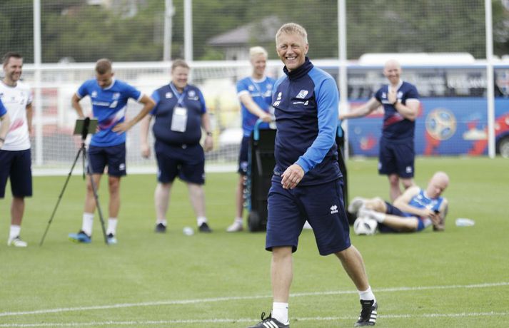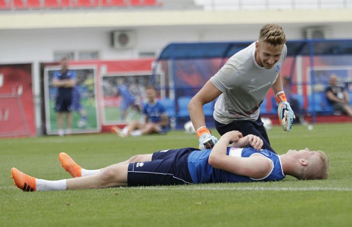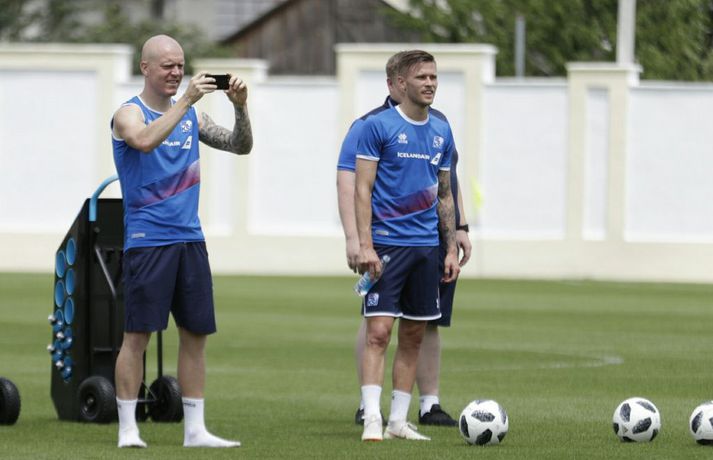 Svona æfa menn eftir að hafa sjokkerað heiminn enn einu sinni Kolbeinn Tumi Daðason í Kabardinka skrifar 17. júní 2018 13:30 Birkir Bjarnason tók því rólega á æfingunni í morgun. Skoðaði símann sinn og tyllti sér á kælinn. Smá útilegustemmning hjá kantmanninum knáa. Vísir/Vilhelm Strákarnir okkar voru mættir til æfinga í Kabardinka niðri við Svartahaf í morgun klukkan 11. Reyndar allir nema þrír. Alfreð Finnbogason, Gylfi Þór Sigurðsson og Jóhann Berg Guðmundsson urðu eftir á hótelinu og fór Jóhann Berg raunar í myndatöku á sjúkrahúsi til að fá nánari upplýsingar um meiðsli hans á kálfa. Leiknum í Moskvu í gær lauk klukkan sex að staðartíma. Um tveimur tímum síðar héldu þeir frá leikvanginum, út á flugvöll þaðan sem flogið var beinustu leið í suður, til Gelendzhik við Svartahaf. Þaðan er tíu mínútna akstur á fimm stjörnu hótel strákanna í Kabardinka þangað sem þeir voru komnir um hálf tólf að staðartíma. Leikmenn fegnu meðhöndlun í fluginu, þeirra á meðal Emil Hallfreðsson sem var í góðum höndum Friðriks Ellerts Jónssonar sjúkraþjálfara. Rúnar Vífill Arnarson í landsliðsnefnd KSÍ sagði leikmenn hafa verið þreytta þegar þeir komu á hótelið undir miðnætti. Þeir leikmenn sem spiluðu leikinn í gær voru í teygjuæfingum og endurheimt á æfingunni í morgun á meðan hinir leikmennirnir, varamenn sem ekkert spiluðu auk Ara Frey Skúlasonar og Rúriks Gíslasonar, sem tóku þátt í æfingunni. Þar var boðið upp á töluvert tempó, fyrst spil og svo skotæfingu.Vilhelm Gunnarsson, ljósmyndari Vísis, myndaði æfinguna í bak og fyrir.Vísir er með öflugt teymi í Rússlandi sem verður með ítarlegan fréttaflutning af íslenska liðinu á HM. Fylgist með á samfélagsmiðlum okkar - á Facebook, Twitter og Instagram. HM 2018 í Rússlandi Mest lesið Líður alltaf yfir hana þegar hún kemur í mark Sport „Hefði séð eftir því alla ævi“ Íslenski boltinn „Mjög sáttur með samninginn“ Íslenski boltinn „Hann ætti bara að skrifa afsökunarbiblíuna“ Körfubolti Scholes hættir og setur einhverfan son sinn í fyrsta sætið Enski boltinn Rekinn fyrir ummæli sín um krabbameinssjúka handboltagoðsögn Handbolti Magnús Már í viðræðum við HK Íslenski boltinn Hefur spilað 16 mínútur og fengið tvö rauð spjöld Enski boltinn Real Madrid vill stórar skaðabætur frá UEFA Fótbolti Rúmar tvær milljónir í boði ef þú finnur hundinn hans Aarons Ramsey Fótbolti Fleiri fréttir Fantasýn: „Þessi vörn er eitthvað skrímsli“ Scholes hættir og setur einhverfan son sinn í fyrsta sætið Rúmar tvær milljónir í boði ef þú finnur hundinn hans Aarons Ramsey Carrick í einkaviðtali: Sigurinn á Anfield stór stund fyrir Man. Utd Hefur spilað 16 mínútur og fengið tvö rauð spjöld Bættu Evrópumet AC Milan liðsins með Gullit og Van Basten innanborðs Slot: Engin auka pressa við þetta tap Real Madrid vill stórar skaðabætur frá UEFA „Mjög sáttur með samninginn“ „Hefði séð eftir því alla ævi“ Magnús Már í viðræðum við HK Bað alla nema þjálfarann afsökunar Vísar slúðrinu til föðurhúsanna Ísak Bergmann lagði upp gegn Bayern „Við tókum bara þá ákvörðun að fara í Svanavatnið“ Albert og Mikael Egill í vondum málum á Ítalíu Palace neitar að sleppa takinu á Liverpool „Eitthvað sem ég mun aldrei gleyma“ Einkunnir Íslands: Þrjár heitastar í frostinu Viktor Bjarki skoraði og lagði upp í fyrsta byrjunarliðsleiknum Uppgjörið: Ísland - Norður-Írland 3-0 | Áfram hluti af elítunni Pedri gæti verið frá keppni til langs tíma Arteta fyrstur stjóranna á fætur Þorsteinn breytir engu á milli leikja Snjóbræðslukerfi Þróttar kom KSÍ til bjargar Tölur úr Bestu 2025: Klúðraði langflestum dauðafærum í sumar Segja spurningar vakna um stöðu Elísabetar Litu á hann sem risaeðlu en sjáið hvað er í tísku núna Formaðurinn hjálpaði til við að moka völlinn Formenn sambandanna hjálpuðu við að moka völlinn Sjá meira