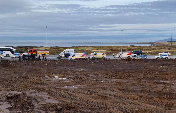 Umferðarslys varð á Reykjanesbraut rétt vestan við mislæg gatnamót við Krísuvíkurveg. Samkvæmt upplýsingum frá slökkviliði höfuðborgarsvæðisins voru sjö sjúkrabílar og tveir dælubílar sendir á vettvang. Tíu voru fluttir á slysadeild, flestir með minniháttar meiðsli, en einn eða tveir eru sagðir með alvarlegri áverka. Bæði lögregla og sjúkralið eru nú við vinnu á vettvangi. Reynt verður að stjórna umferð fram hjá slysstað þannig að Reykjanesbraut verði ekki alveg lokuð. Lögregla í Hafnarfirði fer með rannsókn slyssins. Svo virðist sem að minnsta kosti tvær bifreiðar hafi lent í slysinu, ef marka má myndir af vettvangi.Fréttin hefur verið uppfærð.