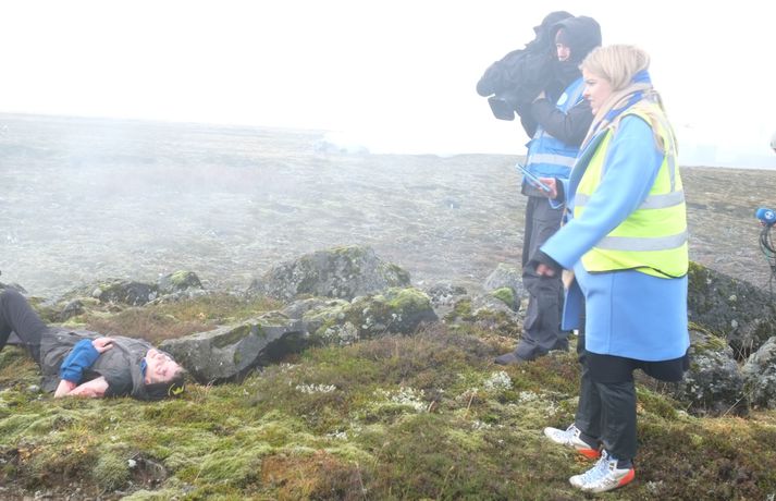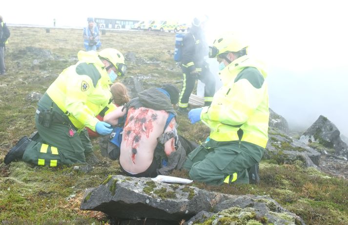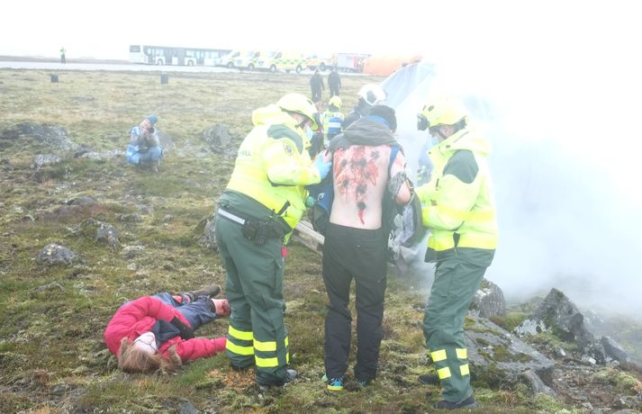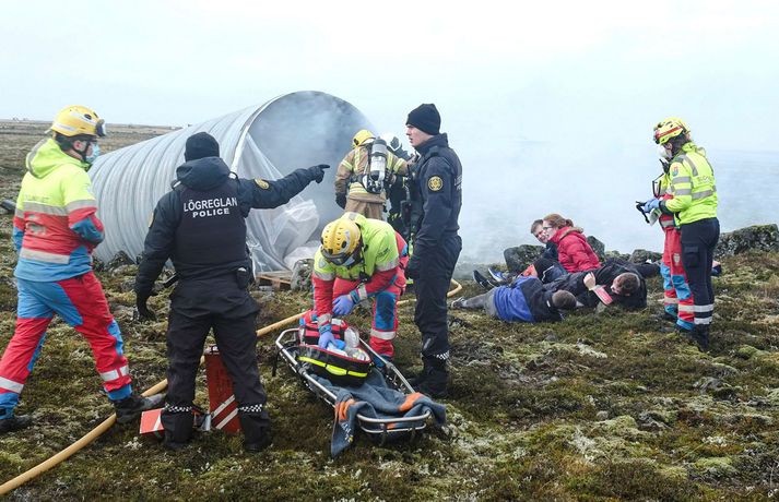 Myndasyrpa: Barnsgrátur og brunasár á flugslysaæfingu í Keflavík Óttar Kolbeinsson Proppé skrifar 23. október 2021 17:32 Fyrsta flugslysæfingin var haldin á Íslandi í fimm ár. Þar var öllu tjaldað til, kveikt í ýmsu braki, sem átti að vera úr flugvél og 150 leikurum, sem léku slaða flugfarþega, komið fyrir víða á stóru svæði við Keflavíkurflugvöll. Á fimmta hundrað manns tóku þátt í æfingunni í dag. Þar af um 150 leikarar en hinir voru björgunaraðilar; lögreglumenn, slökkviliðsmenn, sjúkraflutningamenn, björgunarsveitarmenn og heilbrigðisstarfsfólk. Fréttastofa fékk að fylgjast með æfingunni í dag með myndavélina á lofti: Slökkviliðsmenn mættu fyrstir á vettvang til að slökkva í brennandi brakinu.Vísir/óttarKveikt var í bílhræjum víða á svæðinu, sem áttu að líkja eftir braki úr flugvél sem hafði hrapað.Vísir/óttarHelstu aðgerðirnar í dag fóru fram við rör þar sem fólk átti að vera fast inni.vísir/óttarFljótlega var fjöldi viðbragðsaðila mættur til að bjarga fólki út úr brennandi rörinu.vísir/óttarBjörguaraðgerðir gengu velvísir/óttarFagaðilar og sjálfboðaliðar koma saman til að bjarga fólki.vísir/óttarNokkuð stór hópur fékk að fylgjast með æfingunni í dag og var leiddur um vettvanginn af vöskum mönnum.vísir/óttarDómsmálaráðherra var á meðal þeirra sem fylgdust með í dag.Vísir/óttarRáðherrann tekur mynd af leiknu fórnarlambi flugslyssins. Vísir/óttarLeikmunum hafði verið komið fyrir víða um svæðið, til dæmis þessum ónýtu flugsætum.vísir/óttarBrúður sem voru inni í braki.vísir/óttarVel farðaður leikari, sem á að vera með mjög alvarlegt brunasár á bakinu.vísir/óttarHonum var hjálpað á fætur áður en ákveðið var að leggja hann aftur niður og bíða eftir sjúkrabörum.Vísir/óttarFarþegatöskur lágu víða um svæðið. Vísir/óttarEldur logaði víða við Keflavík í dag.vísir Erfitt að vinna við þessar aðstæður Það var hálfóhuggulegt að standa í miðjunni á björgunaraðgerðunum, sérstaklega þar sem fólk þóttist vera fast inni í brennandi röri en þaðan mátti heyra barnsgrátur og öskur. Er ekki erfitt fyrir björgunarfólk að vinna í slíkum aðstæðum? „Jú, auðvitað. Það er vissulega erfitt. Og það er auðvitað tilgangurinn með þessu, það reynir svolítið á mannskapinn," segir Otti Rafn Sigmarsson, meðlimur í björgunarsveitinni Þorbirni. Otti Rafn Sigmarsson, í björgunarsveitinni Þorbirni.Foto: Flugslys æfing/adelina Allt gekk vel Og æfingin gekk vel fyrir sig að sögn æfingastjórans. „Þetta er búið að ganga ljómandi vel. Við erum með hátt í 500 þátttakendur á þessari æfingu og þar af eru 150 manns sem eru þolendur í þessu slysi," segir Elva Tryggvadóttir æfingastjóri. „Óhugnanleg upplifun" Áslaug Arna Sigurbjörnsdóttir var mætt til að fylgjast með æfingunni.vísir/Adelina Dómsmálaráðherra var á meðal þeirra sem fylgdust með æfingunni í dag. „Þetta er auðvitað talsvert óhugnanleg upplifun en gríðarlega mikilvæg reynsla og gaman að sjá hvað samhæfing og samstarf allra aðila gengur vel þegar á það er reynt," segir Áslaug Arna Sigurbjörnsdóttir. Við gripum tækifærið og reyndum að fiska eftir því hvort hún teldi líklegt að hún héldi áfram í sínu ráðuneyti á næsta kjörtímabili. Þessar æfingar eru haldnar á þriggja til fjögurra ára fresti, heldurðu að þú verðir viðstödd hérna á næstu æfingu? „Það er aldrei að vita. Maður er auðvitað mjög stoltur af almannavarnakerfinu okkar og hvernig allir þessir viðbragðsaðilar vinna saman og það hefur auðvitað reynt mikið á það síðustu tvö ár. En ekki með svona stóru slysi og mikilvægt að æfa það. En það verður svo að koma í ljós." Þannig þú telur líklegt að þú haldir áfram sem dómsmálaráðherra? „Það er ekkert hægt að segja til um það. Ég veit ekkert meira um það en þú einmitt núna," segir hún. Almannavarnir Lögreglan Björgunarsveitir Keflavíkurflugvöllur Reykjanesbær Slökkvilið Samgönguslys Mest lesið Veðurvaktin: Snjókoman rétt að byrja og víða erfið færð Veður Ungur Miðflokksmaður gengst við rasisma og segir af sér Innlent Snjókoman rétt að byrja Innlent Flugmaðurinn sem fórst millilenti oft í Reykjavík Innlent Eldur í blokk við Ljósheima Innlent Bílar út af veginum á Reykjanesbraut Innlent Ráðgjafinn ráðinn í tímabundið starf eftir dýra skreppitúra Innlent Hvatt til varúðar vegna snjóflóðahættu á suðvesturhorninu Innlent Skvísur geti virkað sem hálfgerðir þroskaþjófar Innlent Fjölmargir farþegar fastir í flugvélum á Keflavíkurflugvelli Innlent Fleiri fréttir Kærðu umdeildar framkvæmdir allt of seint Skellt í lás í sundlaugum borgarinnar vegna veðurs Reglur brotnar og þjónusta sem bjóða ætti út Þarf að borga bætur þrátt fyrir breytingar á hlaupahjólinu Hvatt til varúðar vegna snjóflóðahættu á suðvesturhorninu Meiri kvika en í síðasta gosi Eldur í blokk við Ljósheima Flugmaðurinn sem fórst millilenti oft í Reykjavík Halla leiðir krabbameinsráð ráðherra Snjókomumet og umferðaröngþveiti Segir sameiginlegum gildum Norðurlanda ógnað Fjölmargir farþegar fastir í flugvélum á Keflavíkurflugvelli Ungur Miðflokksmaður gengst við rasisma og segir af sér Sturlað ástand og United vettlingar prjónaðir í bílnum Mesta snjódýpt í Reykjavík sem mælst hefur í október Viðbragðsaðilar í mikilli hættu vegna bíla á sumardekkjum Bílar út af veginum á Reykjanesbraut Vill heimila Samkeppniseftirlitinu að ráðast í húsleitir Snjókoman rétt að byrja Píratar berjist gegn „rísandi bylgju lýðskrums og fasisma“ Skvísur geti virkað sem hálfgerðir þroskaþjófar Ráðgjafinn ráðinn í tímabundið starf
