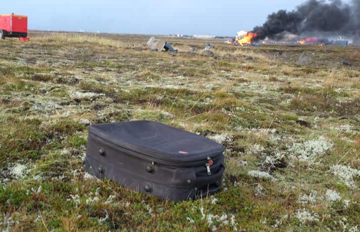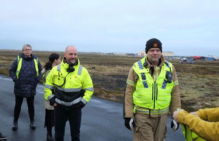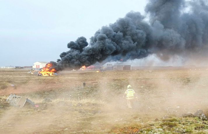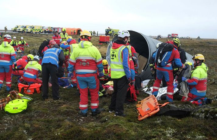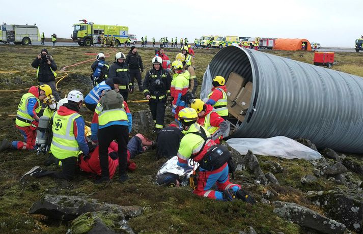 Á fimmta hundrað manns tóku þátt í æfingunni í dag. Þar af um 150 leikarar en hinir voru björgunaraðilar; lögreglumenn, slökkviliðsmenn, sjúkraflutningamenn, björgunarsveitarmenn og heilbrigðisstarfsfólk. Fréttastofa fékk að fylgjast með æfingunni í dag með myndavélina á lofti: Slökkviliðsmenn mættu fyrstir á vettvang til að slökkva í brennandi brakinu.Vísir/óttarKveikt var í bílhræjum víða á svæðinu, sem áttu að líkja eftir braki úr flugvél sem hafði hrapað.Vísir/óttarHelstu aðgerðirnar í dag fóru fram við rör þar sem fólk átti að vera fast inni.vísir/óttarFljótlega var fjöldi viðbragðsaðila mættur til að bjarga fólki út úr brennandi rörinu.vísir/óttarBjörguaraðgerðir gengu velvísir/óttarFagaðilar og sjálfboðaliðar koma saman til að bjarga fólki.vísir/óttarNokkuð stór hópur fékk að fylgjast með æfingunni í dag og var leiddur um vettvanginn af vöskum mönnum.vísir/óttarDómsmálaráðherra var á meðal þeirra sem fylgdust með í dag.Vísir/óttarRáðherrann tekur mynd af leiknu fórnarlambi flugslyssins. Vísir/óttarLeikmunum hafði verið komið fyrir víða um svæðið, til dæmis þessum ónýtu flugsætum.vísir/óttarBrúður sem voru inni í braki.vísir/óttarVel farðaður leikari, sem á að vera með mjög alvarlegt brunasár á bakinu.vísir/óttarHonum var hjálpað á fætur áður en ákveðið var að leggja hann aftur niður og bíða eftir sjúkrabörum.Vísir/óttarFarþegatöskur lágu víða um svæðið. Vísir/óttarEldur logaði víða við Keflavík í dag.vísir Erfitt að vinna við þessar aðstæður Það var hálfóhuggulegt að standa í miðjunni á björgunaraðgerðunum, sérstaklega þar sem fólk þóttist vera fast inni í brennandi röri en þaðan mátti heyra barnsgrátur og öskur. Er ekki erfitt fyrir björgunarfólk að vinna í slíkum aðstæðum? „Jú, auðvitað. Það er vissulega erfitt. Og það er auðvitað tilgangurinn með þessu, það reynir svolítið á mannskapinn," segir Otti Rafn Sigmarsson, meðlimur í björgunarsveitinni Þorbirni. Otti Rafn Sigmarsson, í björgunarsveitinni Þorbirni.Foto: Flugslys æfing/adelina Allt gekk vel Og æfingin gekk vel fyrir sig að sögn æfingastjórans. „Þetta er búið að ganga ljómandi vel. Við erum með hátt í 500 þátttakendur á þessari æfingu og þar af eru 150 manns sem eru þolendur í þessu slysi," segir Elva Tryggvadóttir æfingastjóri. „Óhugnanleg upplifun" Áslaug Arna Sigurbjörnsdóttir var mætt til að fylgjast með æfingunni.vísir/Adelina Dómsmálaráðherra var á meðal þeirra sem fylgdust með æfingunni í dag. „Þetta er auðvitað talsvert óhugnanleg upplifun en gríðarlega mikilvæg reynsla og gaman að sjá hvað samhæfing og samstarf allra aðila gengur vel þegar á það er reynt," segir Áslaug Arna Sigurbjörnsdóttir. Við gripum tækifærið og reyndum að fiska eftir því hvort hún teldi líklegt að hún héldi áfram í sínu ráðuneyti á næsta kjörtímabili. Þessar æfingar eru haldnar á þriggja til fjögurra ára fresti, heldurðu að þú verðir viðstödd hérna á næstu æfingu? „Það er aldrei að vita. Maður er auðvitað mjög stoltur af almannavarnakerfinu okkar og hvernig allir þessir viðbragðsaðilar vinna saman og það hefur auðvitað reynt mikið á það síðustu tvö ár. En ekki með svona stóru slysi og mikilvægt að æfa það. En það verður svo að koma í ljós." Þannig þú telur líklegt að þú haldir áfram sem dómsmálaráðherra? „Það er ekkert hægt að segja til um það. Ég veit ekkert meira um það en þú einmitt núna," segir hún.