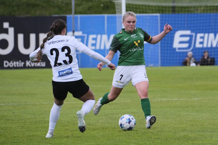 Þetta var í fyrsta sinn sem Kópavogsliðin mætast í kvennaflokki, án þess að HK tefli fram sameiginlegu liði með öðru félagi, en svo fór að Íslandsmeistararnir unnu öruggan sigur. HK er þó á réttri leið með að skapa fleiri Kópavogsslagi þar sem liðið er á toppi Lengjudeildarinnar eftir sex umferðir. Auk Breiðabliks verða FH, Valur og Lengjudeildarlið ÍBV í skálinni þegar dregið verður til undanúrslita en þau fara svo fram í lok júlí. Bikarúrslitaleikurinn sjálfur verður svo 16. ágúst. Birta með tvö og stoðsendingu fyrir hlé Breiðablik byrjaði leikinn í kvöld af miklum krafti og sýndi strax yfirburði sína. Edith Kristín Kristjánsdóttir kom sér í dauðafæri og Andrea Rut Bjarnadóttir átti bylmingsskot í þverslá áður en fyrsta markið kom þegar Birta Georgsdóttir skoraði á tólftu mínútu, eftir að hún nýtti sér mistök í vörn HK. HK fékk ekki mörg færi en eftir eitt þeirra brunuðu Blikar fram og refsuðu með öðru marki sem hin efnilega Hrafnhildur Ása Halldórsdóttir skoraði eftir þríhyrningsspil við Birtu. Staðan þá orðin 2-0 eftir rétt rúmar tuttugu mínútur. Skömmu síðar skoraði Birta svo sitt annað mark, eftir sendingu frá Öglu Maríu Albertsdóttur, og eflaust margir haldið að úrslitin væru hreinlega ráðin. HK náði hins vegar að svara fyrir sig og Loma McNeese gerði það þegar hún skoraði rétt um mínútu síðar, með skoti af vítateigslínunni, og var staðan 3-1 í hálfleik. Sextán ára innsiglaði sigurinn Agla María kom Blikum aftur þremur mörkum yfir eftir korters leik í seinni hálfleik með góðu skoti og eftir það var aldrei spurning hvernig færi. Hin 16 ára Edith Kristín, sem hafði verið afar dugleg við að koma sér í færi, skoraði svo fimmta mark Breiðabliks með skalla af stuttu færi á 67. mínútu. Mörk Blika hefðu hæglega getað orðið fleiri en það breytir engu um að liðið er nú komið áfram í undanúrslit.