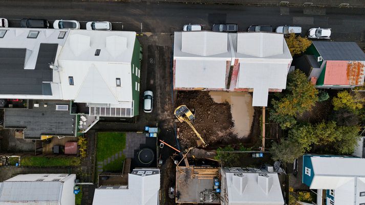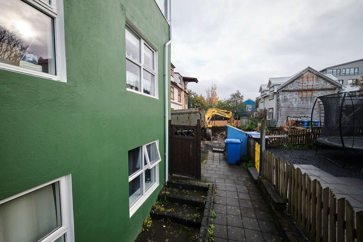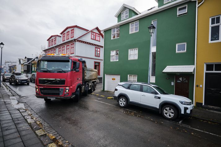 „Við erum bara búin að fá upp í kok bæði við og fólkið hér í kring. Við höfum gengið í hús og það eru um þrjátíu íbúar búnir að skrifa undir, kannski fleiri,“ segir Hjálmtýr Heiðdal íbúi að Grettisgötu. Umræddar framkvæmdir eru við Grettisgötu 20a og 20b. Hús Hjálmtýs er til vinstri á myndinni, rétt við framkvæmdirnar.Vísir/Anton Brink „Við fengum bréf í maí 2024 þar sem það var kynnt að þarna yrði rifið hús og annað byggt á grunni þess. Við svöruðum því að við hefðum ekkert á móti því, enda myndi það ekki skerða okkar birtu eða neitt. Svo í byrjun þessa árs var þetta aftur kynnt, hvenær þetta myndi hefja framkvæmdir og í apríl byrjuðu þeir að brjóta niður gamalt hús hérna og höggbora ofan í klett sem er undir öllum húsunum. Hér er enginn kjallari hjá okkur og ekki heldur í húsunum í kring vegna þessa.“ Að sögn Hjálmtýs á þarna að vera tvöfaldur kjallari, tvær hæðir niður. Því um mikið verk að ræða. Þeir byrji gjarnan átta að morgni og borið standi yfir til klukkan fimm, stundum til klukkan sex. Nú séu líkur á því að þetta standi yfir út október. Vörubíll keyrir úr portinu með tilheyrandi hávaða.Vísir/Anton Brink Mikil röskun í langan tíma „Þeir sögðust ætla að hætta 30. júní en þetta hefur haldið áfram og heldur ennþá áfram. Svo fara þeir alltaf inn á okkar lóð og við höfum sýnt þeim fulla kurteisi og fært okkar bíla þegar það á við en það hefur aldrei verið haft samband við okkur fyrirfram eða verið beðið um leyfi frá þeim sem eru á bakvið þetta.“ Hjálmtýr segir íbúa ítrekað hafa haft samband við borgina vegna málsins. Skrifað bæði heilbrigðiseftirlitinu og bygginga-og skipulagsnefnd en engin svör fengið. „Næst erum við þá komin með lögfræðing í málið sem er að skrifa bréf af því að við teljum að þessi ákvörðun um að leyfa þessa framkvæmd sé algjörlega út úr kortinu. Þetta er mikil röskun á okkar lífi í þetta langan tíma og er ekki viðbúið.“ Framkvæmdunum fylgir gríðarleg röskun fyrir nærliggjandi íbúa. Vísir/Anton Brink Verði að læra af málinu Sjálfur hefur Hjálmtýr tekið myndband af því hvernig er að lifa við hávaðann og birt á íbúahópi miðborgarinnar á Facebook. Hann segir það afar þreytandi að geta ekki haft opna glugga heima hjá sér og segir að íbúar vilji að borgaryfirvöld læri af málinu. „Það verður nú líklega engu breytt héðan af, framkvæmdin er að verða búin en við erum aðallega að þessu því að borgin verður að læra af þessu. Þetta er sama vitleysan og með græna skrímslið uppi í Breiðholti. Það er gefið leyfi til framkvæmda sem aldrei hefði átt að leyfa. Það er lærdómurinn.“ Klippa: Morgun á Grettisgötu vegna framkvæmda