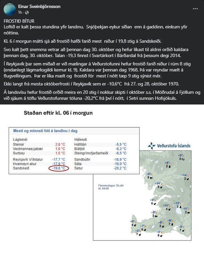 Á þetta bendir veðurfræðingurinn Einar Sveinbjörnsson á Facebook-síðu sinni. „Svo kalt þetta snemma vetrar og hefur líkast til aldrei orðið kaldara þennan dag, 30. október. Talan -19,3 finnst í Svartárkort í Bárðardal frá þessum degi 2014,“ segir Einar í færslunni. Með færslunni birtir hann mynd af vef Veðurstofunnar þar sem sjá má að hitinn var hæstur á Steinum, þar sem hann náði 2,8 gráðum en næsturfrostið var nokkuð mikið á suðvesturhorninu og náði 17,7 stigum í Víðidal í Reykjavík. Hann segir þó að almennt frost í Reykjavík hafi farið niður í rúm átta stig. Síðast var kaldara í Reykjavík þennan dag árið 1968. Þá hafi þó verið mælt á flugvellinum, þar sem frostið fór niður í 9 gráður í nótt. „Ekki langt frá mesta októberfrosti í Reykjavík sem er -10,6°C frá 27. og 28. október 1970. Á landsvísu hefur frostið orðið meira en 20 stig í nokkur skipti í október s.s. í Möðrudal á Fjöllum og við sjáum á töflu Veðurstofunnar í morgun töluna -20,2°C frá því í nótt, í Setri sunnan Hofsjökuls.“