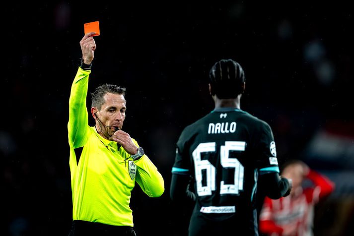 Nallo spilaði annan leik sinn fyrir Liverpool í gærkvöld þegar hann kom inn á sem varamaður í strembinni stöðu. Liðið var 2-0 undir gegn Crystal Palace á Anfield. Arne Slot gerði tíu breytingar á liði Liverpool frá 3-2 tapi fyrir Brentford um helgina og aðallið félagsins fékk að stærstum hluta hvíld. Calvin Ramsey, Trey Nyoni, Kieran Morrison og Rio Ngumoha fengu tækifæri í byrjunarliðinu og fjórir unglingar komu inn af bekknum; Kaide Gordon, Wellity Lucky, Trent Kone-Doherty og áðurnefndur Amara Nallo. Nallo kom inn af bekknum á 67. mínútu og tólf mínútum síðar var honum vísað af velli fyrir að tosa niður Justin Devenney sem var sloppinn í gegn. Réttilega fékk hann rautt spjald að launum og vísað í sturtu. Nallo virtist niðurbrotinn og hefur eflaust vottað fyrir slæmum endurminningum. Hann entist enn skemur á vellinum í eina leiknum sem hann hafði spilað með Liverpool-liðinu fyrir gærkvöldið. Hann fékk tækifæri gegn PSV Eindhoven í Meistaradeildinni í janúar síðastliðnum. Nallo hafði verið á vellinum í um fjórar mínútur þegar hann fékk reisupassann í Hollandi í janúar.EYE4images/NurPhoto via Getty Images Aðeins fjórum mínútum síðar var honum vísað af velli, einnig fyrir að brjóta af sér sem aftasti varnarmaður. Nallo fór niðurbrotinn af velli í gær og fóru stuðningsmenn Liverpool einnig grautfúlir heim á leið eftir 3-0 tap fyrir Crystal Palace sem fer áfram í næstu umferð deildabikarsins. Um er að ræða sjötta tap Liverpool í síðustu sjö leikjum og jafnframt þriðja tap liðsins fyrir Crystal Palace á þessari leiktíð.