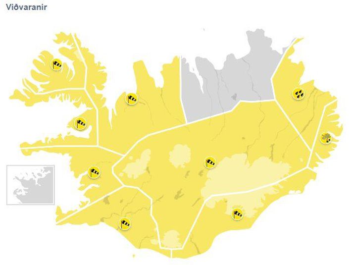 Gular viðvaranir taka gildi ein af annarri á morgun í flestum landshlutum, frá austri til vesturs, vegna hvassviðris eða storms, en á Austfjörðum má búast við miklum leysingum, auknu afrennsli og vatnavöxtum í ám og lækjum vegna hækkandi hitastigs. Viðvaranir ná ekki til norðausturlands, suðausturlands eða höfuðborgarsvæðisins. Svona verður viðvaranakort Veðurstofu Íslands klukkan tvö síðdegis á morgun.Veðurstofa Íslands Enn er þó slæm færð víða á höfuðborgarsvæðinu, en Vegagerðin vekur athygli á að umferð þar gangi hægt og búast megi við töfum. Í stuttri tilkynningu á vef Strætó segir að búast megi við miklum seinkunum í dag á öllu höfuðborgarsvæðinu, og eru farþegar beðnir um að fylgjast með staðsetningu vagna á rauntímakorti. Fréttastofu hafa borist ábendingar um að strætisvagnar fari hægt yfir, og séu sumir hverjir yfirfullir af farþegum. Stórvarasamt á morgun Veðurfræðingur segir að heilt yfir sé að hlýna. „Það gerir það aðallega í nótt og fyrramálið og það hlýnar dálítið ákveðið,“ segir Einar Sveinbjörnsson veðurfræðingur. Þó muni ekki rigna mikið á höfuðborgarsvæðinu. „Þannig að við fáum ekki vætu ofan í allan þennan snjó, en hann er auðleystur og fer af stað, þannig að það verður vatnsagi í nótt og fyrramálið. Svo er bara svo mikill klakabunki á vegum og þetta verður allt saman stórvarasamt í fyrramálið, að keyra á þessu. Eftir frostið í nótt þá er þetta orðið samfast við götur og vegina, þannig að menn þurfa að huga vel að því hvað þeir ætla að gera í fyrramálið.“ Snjórinn hverfi um helgina Hláka verði raunar um allt land, en víðast hvar á landinu hafi snjóað, sem er óvenjulegt fyrir lok október. Von sé á að snjórinn verði horfinn á einhverjum svæðum um helgina. Einar Sveinbjörnsson veðurfræðingur segir mikla mildi að ekki sé mikil rigning í kortunum á höfuðborgarsvæðinu. Næg verði hálkan án hennar.Vísir/Steingrímur Dúi „Við fáum að minnsta kosti þrjá væna daga með þokkalegum hita, fimm til sex stiga hita á láglendi og blástur með.“ Það sé einkar heppilegt að ekki sé von á rigningu á suðvesturhorninu. „Ég býð ekki í þetta ef það væri að gera sunnanátt og miklar rigningar eins og stundum gerir á þessum árstíma, ofan í allan þennan snjó. Þannig að við sleppum vel hvað það varðar,“ segir Einar.