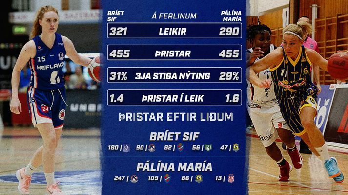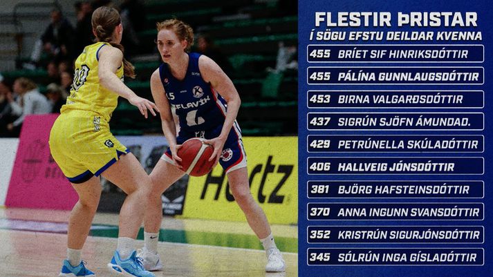 Bríet Sif skoraði einn þrist í sigurleik Keflavíkur á Króknum sem var hennar 455. í efstu deild. Með því jafnaði hún met Pálínu Gunnlaugsdóttur sem hafði áður tekið metið af Birnu Valgarðsdóttur. Pálína var einmitt sérfræðingur í Bónus Körfuboltakvöldi þegar fjallað var um leik Keflavíkurliðsins en hún vissi ekkert um að hún ætti sjálf metið. Klippa: Bríet jafnaði þriggja stiga met Pálínu „Það var samt einn merkilegur þristur sem kom í þessum leik í gær. Bríet Hinriksdóttir setti þennan þrist hér,“ sagði Ólöf Helga Pálsdóttir og sýndi þristinn. „Þarna var hún að jafna met í flestum þristum, Pálína,“ sagði Ólöf og um leið kom upp topplistinn þar sem Pálína var jöfn Bríeti í efsta sætinu. „Ha, átti ég metið,“ sagði Pálina hissa. „Ég þarf að rífa fram skóna,“ sagði Pálina létt. Hallveig Jónsdóttir, sem var hinn sérfræðingur þáttarins, var einnig á listanum eða í sjötta sætinu með 406 þrista. Það má sjá þessa skemmtilegu uppákomu í þættinum hér fyrir ofan.