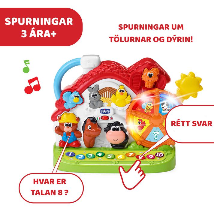 „Það var draumur minn að íslensk börn gætu leikið sér með talandi leikfang sem skilur og svarar þeim á þeirra eigin tungumáli,“ segir Sigríður Fanney Gunnarsdóttir, sölu- og markaðsstjóri Gullskóga sem er umboðsaðili Chicco á Íslandi. „Eftirþví sem ég best veit var bóndabærinn fyrsta þroskaleikfangið hér á landi sem bregst við leik barnsins á íslensku.“ Bóndabærinn er frá ítalska framleiðandanum Chicco, sem er þekktur fyrir vönduð þroskaleikföng. En íslenska útgáfan hefði aldrei orðið að veruleika nema fyrir frumkvæði Sigríðar. „Þegar ég hafði samband við Chicco voru þau ekki viss um að íslenskan væri þess virði því það eru jú ekki svo margir sem tala hana,“ segir hún og hlær. „En ég lofaði að sjá um allt sjálf ef þau myndu leiðbeina mér. Ég fékk íslenskan leiklistarnema til að tala inn á bóndabæinn og útkoman varð frábær. Það má því segja að þetta hafi verið mín leið til að leggja íslenskunni lið á skemmtilegan hátt.“ Nú talar bóndabærinn yfir 50 orð, setningar, hljóð og lög og börn geta valið hvort hann tali á íslensku eða ensku og þannig kennir leikfangið börnum m.a. að þekkja litina, tölurnar og dýrin á bóndabænum með því að spyrja börnin einfaldra spurninga. Hægt er að stilla erfiðleikastigið á bóndabænum og geta því yngri börn fengið auðveldari spurningar heldur en þau eldri. „Börn læra svo mikið í gegnum leik og það er dýrmætt að þau fái að heyra og nota íslensku í því samhengi,“ segir Sigríður. „Þegar barnið ýtir á kúna og heyrir „muuu“ eða togar í sólina og hlustar á söng, þá tengist tungumálið gleði og leik. Það er besta leiðin til að styrkja íslenskuna.“ Í tilefni dags íslenskrar tungu hvetur Sigríður foreldra til að taka tungumálið með í leikinn. „Hvort sem það er með bóndabænum, bók eða söng þá er allt sem kveikir íslenskt tal og hlátur hjá börnum gulls ígildi,“ segir hún. Og ef einhver vill sjá bóndabæinn í eigin persónu (eða heyra hann segja „Hæ, hæ!“) þá er hann m.a. til sölu í Dótabúðinni, Leikfangalandi, Vaski á Egilsstöðum, Kaupfélagi Skagfirðinga, Kaupfélagi Borgfirðinga, Lyfjavali og Kaupfélag Vestur-Húnvetninga.