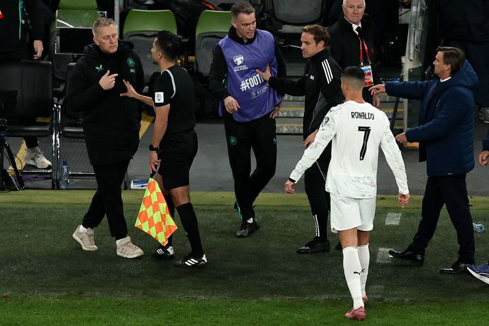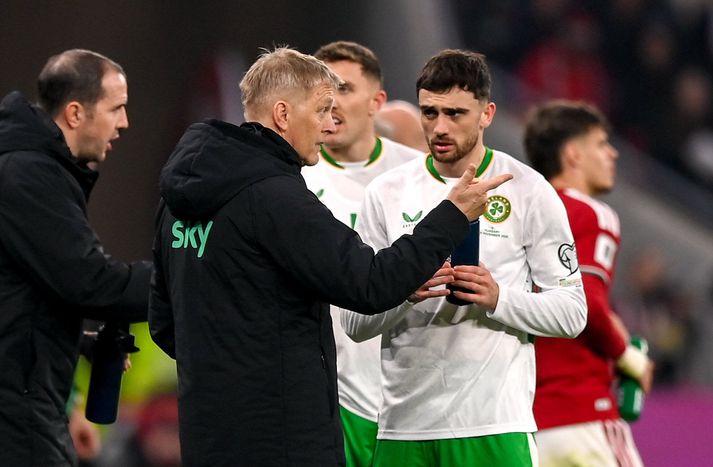 Heimir sagði Ronaldo að hann væri himinlifandi með þetta Óskar Ófeigur Jónsson skrifar 19. nóvember 2025 09:28 Heimir Hallgrímsson ræðir málin við Cristiano Ronaldo eftir leikinn. Getty/Michael P Ryan Heimir Hallgrímsson, þjálfari írska karlalandsliðsins í fótbolta, var mættur í Bítið á Bylgjunni í morgun og veitti þar sitt fyrsta viðtal á Íslandi eftir magnaðan árangur írska landsliðsins undir hans stjórn. Írar unnu þrjá síðustu leiki sína í undankeppni HM, þar af þá tvo síðustu á móti Portúgal og Ungverjalandi, og tryggðu sér sæti í umspili um laust sæti á heimsmeistaramótinu í fótbolta næsta sumar. Útlitið var ekki bjart fyrir lokakafla undankeppninnar og mikil umræða í írskum fjölmiðlum um að það ætti jafnvel að reka Heimi en nú eftir þrjá sigurleiki í röð er Heimir orðinn þjóðhetja á Írlandi. Heimir Hallgrímsson kátur í leikslok í Búdapest.Getty/Stephen McCarthy Sigmar Vilhjálmsson og Lilja Katrín Gunnarsdóttir ræddu við Heimi um ævintýri helgarinnar. Var orðinn pirraður Lilja Katrín spurði Heimi út í það hvernig væri að upplifa þessar dramatísku síðustu mínútur leiksins þegar Ungverjar voru að reyna að tefja leikinn. „Maður var bara pirraður yfir því að þeir voru að eyða tímanum. En svo auðvitað kom það bara í bakið á þeim í lokin því að þeir höfðu nánast engan tíma til að jafna eftir að við skoruðum. Vitandi það, þetta var bara okkar eini séns, þannig að það var ekkert nema eitt í huganum, bara halda áfram. Reyna og reyna og reyna. Stundum heppnast það eins og núna, en oftast þá heppnast það ekki,“ sagði Heimir Hallgrímsson, en hvernig voru taugarnar á hliðarlínunni? Litum á hvern annan og brostum „Þær voru bara ágætar og við vorum vel undirbúnir fyrir það hvað við ætluðum að gera ef að þessi staða kæmi upp. Við í þjálfarateyminu vorum búnir að tala um það deginum áður. Hvaða skiptingu við myndum gera og svo framvegis. Þannig að við vorum í raun bara búin að gera það sem við gátum. Þetta var bara ekki svona eitthvað. Þess vegna var þetta bara svo fallegt þegar þetta heppnaðist, þannig að við litum svona á hvern annan og brostum bara,“ sagði Heimir. Heimir og Caomin Kelleher, markvörður írska landsliðsins og enska úrvalsdeildarfélagsins Brentford, eftir sigurinn á Ungverjum á sunnudaginn.Getty/ Stephen McCarthy/ Sigmar spurði Heimi út í fas hans á hliðarlínunni en Írum þykir hann vera mjög rólegur. „Þú ert nú kallaður svona bara rólegasti þjálfarinn og varst á tímabili svolítið gagnrýndur fyrir þetta í írskum miðlum, að þú værir svona meiri áhorfandi frekar en að vera þjálfarinn,“ sagði Sigmar. Það fannst þeim líklega eitthvað niðurlægjandi „Ég hef einhvern veginn ekkert verið mikið í einhverjum öskurleikjum eða þvíumlíkt. Ég var náttúrulega bara gagnrýndur fyrir að enginn þekkti mig þegar ég kom þangað. Enginn vissi hver þessi maður var og hvað þá þá einhver Íslendingur að fara að gera eitthvað fyrir Írland. Það fannst þeim líklega vera eitthvað niðurlægjandi,“ sagði Heimir. „Auðvitað eru margir af bestu knattspyrnumönnum, jafnvel í heimi, sem koma frá Írlandi, þannig að auðvitað hljómar þetta svolítið svona öfugt að fá einhvern Íslending til þess að reyna að bæta upp fyrir þau ár eða áratugi sem að Írland hefur ekkert getað neitt í fótbolta. Þeim fannst það eitthvað skrýtið og ég skil það bara alveg þannig,“ sagði Heimir. Auðvitað sárt þegar þeir tala illa um mann „Þannig að ég tók það ekkert mjög nærri mér, en auðvitað er það sárt þegar þeir tala illa um mann og allt það, en ég fylgist mjög lítið með umræðunni. Ég er ekki á samfélagsmiðlum eða neitt svoleiðis, þannig að ég svona slapp örugglega við það ljótasta,“ sagði Heimir en synirnir hafa þó látið hann vita af ýmsu sem kemur þar fram. Írar fögnuðu þessum úrslitum gríðarlega út um allan heim enda mikið stemningsfólk. Bítisfólk vildi fá að vita: Hvernig var sigrinum á Ungverjum fagnað? Stuðningurinn við írska landsliðið hefur ávallt verið til staðar en er að aukast til muna um þessar mundirGetty Írar eru mjög stoltir „Það voru líklega seldir einhverjir Guinness-bjórar þetta kvöld,“ sagði Heimir léttur. „Synirnir eru alltaf að senda vídeó af einhverjum pöbbum þar sem fólk var. Það var komið úr ofan, það var allt orðið vitlaust, sjónvörpin duttu af veggjunum og eitthvað svona. Þetta skiptir miklu máli. Írar eru mjög stoltir og ekkert ósvipaðir okkur. Þeir eru glaðir, syngja mikið og þegar þeir skemmta sér, þá skemmta þeir sér. Það er ekkert svona, það er ekkert hérna eitthvert hálfkák í því,“ sagði Heimir. Cristiano Ronaldo átti samskipti við Heimi Hallgrímsson eftir að hann fékk að líta rauða spjaldið.Getty/Michael P Ryan Sigmar spurði Heimi líka út í samskiptin við Cristiano Ronaldo sem fékk rauða spjaldið á móti Írum en þeir létu einhver orð falla þegar Ronaldo gekk af velli. „Hann er klókur og er ekkert að byrja í þessum leik. Það var engin vanvirðing af hans hálfu við mig. Hann spurði mig hvort ég væri ánægður með þetta. Ég setti auðvitað pressu á hann og dómarann,“ sagði Heimir. „Mér fannst hann stjórna fyrir leiknum sem við töpuðum 1-0 í Portúgal. Hann er bara af þeirri stærðargráðu að ef hann segir eitthvað, þá hlustar fólk og hann stjórnaði ekki bara dómaranum í leiknum úti, heldur bara öllu fólkinu. Það var náttúrulega stútfullur völlur í Lissabon. Og þegar að hann lyfti höndum, þá kom fólkið með og þess vegna fannst mér hann vera svolítið svona leikstjóri þarna,“ sagði Heimir. Hann vildi líka passa upp á það a