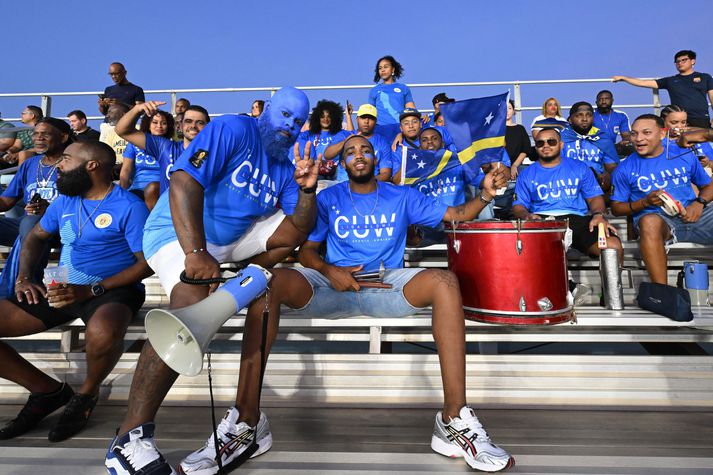 Það búa vissulega aðeins 150 þúsund manns á eyjunni en enginn þeirra er þó í landsliðinu sem tryggði Curacao sæti á HM. Sætið á lokamótinu á næsta ári var í höfn eftir markalaust jafntefli við Jamaíku á útivelli. Liðið er skipað Hollendingum með tengsl við þjóðina, flottir leikmenn en bara ekki nógu góðir til að fara með hollenska landsliðinu á stórmót. Hollendingurinn Dick Advocaat er síðan þjálfari Curaçao en var þó ekki viðstaddur leikinn af persónulegum ástæðum þar sem eiginkona hans glímir við veikindi. Þjálfarinn slær líka met Hann setur líka met með því að verða elsti þjálfari á heimsmeistaramóti, 78 ára gamall. Hann slær þar með met Otto Rehhagel sem var 71 árs þegar hann stýrði Grikklandi árið 2010. Curaçao, sem er um sextíu kílómetra frá strönd Venesúela, varð ekki sjálfstætt land innan Konungsríkisins Hollands fyrr en árið 2010, eftir upplausn Hollensku Antillaeyja. Fyrir tíu árum var liðið í 150. sæti á heimslista FIFA. Nú er það í 82. sæti á heimslistanum, átta sætum á eftir íslenska landsliðinu. View this post on Instagram A post shared by 1X1 FTBL (@1x1ftbl) Stærra HM 2026, þar sem 48 þjóðir keppa í stað 32, ásamt því að gestgjafarnir Kanada, Mexíkó og Bandaríkin komast sjálfkrafa áfram, hefur gefið Curacao mun betri möguleika á HM-sæti. Liðið verður fjórði nýliðinn á mótinu næsta sumar og bætist í hóp Grænhöfðaeyja, Úsbekistan og Jórdaníu. Stuðningsmenn Curacao eru kannski ekki mjög margir en þeir eru jafnan í miklu stuði.Getty/ GERRIT VAN COLOGNE Einn stærsti viðburður í sögu Curacao „Þetta er galið og yrði einn stærsti viðburður í sögu Curacao,“ sagði miðjumaðurinn Juninho Bacuna, fyrrverandi leikmaður Huddersfield, Rangers og Birmingham City, fyrir leikinn. Hann var einn af þeim sem fögnuðu mest þegar lokaflautið í leiknum gegn Jamaíku gall. Í samtali við BBC Radio 5 Live bætti hann við: „Þetta er ótrúlegt og stórkostlegt. Fyrir nokkrum árum hefði manni ekki einu sinni dottið þetta í hug. Að vera persónulega hluti af þessu og láta þennan draum rætast væri ótrúlegt,“ sagði Bacuna. Í tíu leikjum í undankeppninni hefur liðið unnið sjö og lauk keppni án taps. Ævintýri þeirra virtist í molum á fjórðu af fimm mínútum uppbótartíma á móti Jamaíku þegar varamaðurinn Jeremy Antonisse hjá Curacao virtist hafa brotið á Isaac Hayden og dómarinn frá El Salvador, Ivan Barton, benti strax á vítapunktinn. En myndbandsdómarar hvöttu dómarann fljótlega til að skoða atvikið á skjánum við hliðarlínuna og hann sneri ákvörðun sinni við, áhorfendum til mikillar gremju. Gleðin var hins vegar mikil hjá leikmönnum Curacao. View this post on Instagram A post shared by CBS Sports Golazo (@cbssportsgolazo) Frá janúar 2024 hefur Hollendingurinn Advocaat stýrt liðinu með frábærum árangri. Það hjálpaði líka mikið hversu góð tengsl hann hefur við Holland. Advocaat hefur þrisvar sinnum þjálfað landslið Hollands, auk þess að þjálfa Sameinuðu arabísku furstadæmin, Suður-Kóreu, Belgíu, Rússland, Serbíu og Írak. Hann hjálpaði Hollandi að komast í fjórðungsúrslit HM 1994 og lið hans, Suður-Kórea, féll úr leik í riðlakeppninni 2006. Advocaat tók ekki við stjórnartaumunum hjá Curacao fyrr en greiðsludeila milli leikmanna og knattspyrnusambands landsins var leyst, og hann setti strax stefnuna á að komast á HM 2026. Góð yfirsýn yfir leikmannamengi Hollands Hann hafði fylgst með hollenskum fótbolta í langan tíma og hafði gríðargóða yfirsýn yfir leikmannamengi þjóðarinnar og hvaða góðu leikmenn ættu kannski aldrei möguleika á því að spila fyrir hollenska landsliðið á stórmóti. Þeir 24 leikmenn sem Dick Advocaat valdi fæddust allir í Konungsríkinu Hollandi en á evrópskri grund: Amsterdam, Groningen, Emmen, Haarlem, Rotterdam. „Það eru margir leikmenn sem dreymdi um að spila fyrir Holland einn daginn. Sumir eru nú þegar 23, 24 eða 25 ára og hugsa ekki lengur um landsliðið. Við ættum að gefa þeim tækifæri,“ sagði Advocaat í fyrsta leik sínum og vísaði þar til Riechedly Bazoer og Justin Kluivert. Töldu sig enn geta klæðst hollensku treyjunni „Í eitt og hálft ár var mikill þrýstingur á mér vegna nokkurra leikmanna sem töldu sig enn geta klæðst hollensku treyjunni, en sem betur fer hafa þeir valið Curaçao,“ sagði Advocaat ákveðinn. „Ég er stoltur. Ég á stóra fjölskyldu á Curacao og að fara á HM er gríðarleg upplifun. Það er ekki hægt að bera það saman við að spila með yngri landsliðunum. Ég hlakka mikið til þess sem koma skal,“ segir Armando Obispo (PSV), einn þeirra síðustu til að ganga til liðs við „Bláu bylgjuna“. „Allir vita að Dick Advocaat er stórt nafn, hann er frábær þjálfari og allir virða ákvarðanir hans og vinnubrögð,“ sagði Bacuna. „Nærvera hans er virkilega mikilvæg fyrir okkur sem lið og einnig fyrir landið, og áhrif hans hafa verið gríðarlega mikil. Við byrjuðum að vinna með honum í undankeppni Þjóðadeildarinnar og sáum vöxt í liðinu, bæði í vinnubrögðum og baráttu í leikjum,“ sagði Bacuna. Fékk að spila með eldri bróður sínum Auk þess að hafa hollenskan þjálfara er mikill meirihluti leikmanna í landsliðshópi Curaçao fæddur í Hollandi en hefur fjölskyldutengsl sem gera þeim kleift að spila fyrir landsliðið. Fyrir Bacuna var það einnig tækifæri til að spila landsleiki með eldri bróður sínum, Leandro, fyrirliða landsliðsins, og það var stór hvatning fyrir hann eftir að hafa leikið með U-21 landsliði Hollands. „Ég byrjaði að spila fyrir Curaçao árið 2019 og það var stór ákvörðun fyrir mig,“ sagði Juninho Bacuna. „Á þeim tíma var ég aðeins 21 árs og átti mörg 