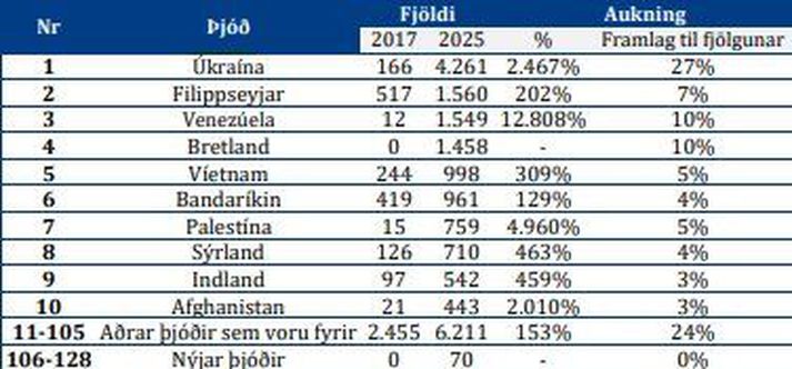Þetta segir í skýrslu starfshóps sem Þorbjörg Sigríður Gunnlaugsdóttir dómsmálaráðherra kynnti í dag. Skýrsluna, sem telur fimmtíu blaðsíður, má lesa í heild sinni hér. Þar segir jafnframt að vísbendingar séu um að þriðju ríkis borgarar séu í efnahagslega viðkvæmri stöðu og brýn þörf sé á aukinni aðlögun og inngildingu. Í skýrslunni sé fjallað um 25 atriði sem telja megi sem misræmi í löggjöf og framkvæmd tengt dvalarleyfaveitingum á Íslandi samanborið við önnur Norðurlönd. Slíkt misræmi geti gert viðkvæma hópa útsetta fyrir hagnýtingu og leitt til hlutfallslega meira innflæðis þriðju ríkis borgara til Íslands en annarra Norðurlanda. Ætlað að veita betri yfirsýn Í apríl 2025 skipaði dómsmálaráðherra starfshóp til að yfirfara reglur um dvalarleyfi á Íslandi. Hópinn skipuðu Edda Bergsveinsdóttir, fulltrúi frá dómsmálaráðuneytinu og formaður, Vilhjálmur Hilmarsson, hagfræðingur, og Þórhildur Ósk Hagalín, fulltrúi frá Útlendingastofnun. Arnar Sigurður Hauksson frá dómsmálaráðuneytinu og Anna Lísa Ingólfsdóttir frá Útlendingastofnun voru varamenn í hópnum. Auk þeirra tók Alda Karen Svavarsdóttir, sviðsstjóri leyfasviðs hjá Útlendingastofnun, þátt í störfum hópsins. Markmið vinnunnar var að taka saman upplýsingar og veita betri yfirsýn yfir þann hóp sem sækir um og eftir atvikum fær útgefið dvalarleyfi hér á landi, meðal annars með hliðsjón af þeim markmiðum sem nefnd eru í stefnuyfirlýsingu ríkisstjórnarinnar um að gæta skuli samræmis við reglur nágrannaríkja á sviði útlendingamála. Jafnframt skyldi starfshópurinn taka saman helstu áskoranir í málaflokknum, með hliðsjón af viðkvæmum hópum og þeim dvalarleyfum sem telja má að fylgi mest hætta á misnotkun og hagnýtingu einstaklinga. Að lokum var starfshópurinn beðinn um að draga saman tillögur að úrbótum í málaflokknum. 57 þúsund á níu árum Í skýrslunni segir að á árunum 2017 til 2025 hafi íbúum Íslands fjölgað um 57 þúsund, sem samsvarar 17 prósenta aukningu. Fólksfjölgunin á Íslandi á tímabilinu hafi verið rúmlega þrettán sinnum meiri en í Evrópu að meðaltali og nær fjórum sinnum meiri en á öðrum Norðurlöndum. Fjölgun erlendra ríkisborgara skýri 69 prósent af fólksfjölgun tímabilsins. Fjöldi dvalarleyfishafa frá löndum utan EES hafi nær fimmfaldast á tímabilinu 2017 til 2025, frá rúmlega 4.000 manns í tæplega 20.000. Fjöldi þriðju ríkis borgara sem dvelur á Íslandi á grundvelli alþjóðlegrar eða tímabundinnar verndar hafi 22-faldast á tímabilinu en aukningin hafi verið á bilinu tvö- til fjórföld í öðrum flokkum dvalarleyfa. Veiting dvalarleyfa til þriðju ríkis borgara hafi verið stærsti áhrifaþáttur fólksfjölgunar á Íslandi frá árinu 2023. Skýra megi um 76 prósent af fjölgun þriðju ríkis borgara á árunum 2017 til 2025 með tíu ríkisföngum af 128 ríkisföngum þriðju ríkis borgara sem nú búa á Íslandi. Þar af skýrist um helmingur aukningarinnar af ríkisborgurum þriggja ríkja, það er Úkraínu, Venesúela og Bretlandi. 23 ný ríkisföng hafi þá bæst við flóru þriðju ríkis borgara á tímabilinu, meðal annars Tjad, Djíbúti, Kirgistan, Vestur-Sahara, Burkína Fasó og Vanúatú. Vernd og fjölskyldusameiningar vega þyngst Fjörutíu prósent af fjölgun í hópi ríkisborgara utan EES á tímabilinu skýrist af veittum dvalarleyfum á grunni alþjóðlegrar eða tímabundinnar verndar, á meðan tuttugu prósent megi skýra með fjölskyldusameiningu. Rúmur meirihluti fjölskyldusameininga tengist Íslendingum eða EES-borgurum innanlands. Veiting nýrra dvalarleyfa á grundvelli verndar sé á niðurleið en veitt verndarleyfi á árinu 2024 hafi verið helmingi færri en árið 2022. Umsóknum um vernd fari fækkandi en námsleyfi og fjölskyldusameiningar séu nú í vexti. Ísland hafi tekið verulega fram úr öðrum Norðurlöndum eftir 2019 þegar kemur að veitingu nýrra dvalarleyfa. Á árunum 2020 til 2024 hafi Ísland veitt allt að 37 prósent fleiri ný dvalarleyfi á hvern íbúa en önnur Norðurlönd að meðaltali en mismunandi eftir árum, þar af allt að 78 prósent fleiri ný dvalarleyfi en Norðmenn, allt að 58 prósent fleiri en Danir og allt að 64 prósent fleiri en Svíar. Fimmfalt fleiri námsleyfi til fólks frá Afríku Munur í fjölda veittra nýrra dvalarleyfa samanborið við önnur Norðurlönd hafi verið mismunandi eftir undirflokki dvalarleyfa síðustu ár en Ísland skeri sig sérstaklega úr þegar kemur að veitingu nýrra verndarleyfa og námsleyfa. Veitt hafi verið allt að 254 prósent fleiri verndarleyfi á Íslandi en öðrum Norðurlöndum að meðaltali eftir 2020 og allt að 56 prósent fleiri námsleyfi. Verulegur munur hafi verið á námsleyfaveitingum Íslands og annarra Norðurlanda síðustu ár. Á árinu 2024 hafi Íslendingar til að mynda veitt þrisvar sinnum fleiri námsleyfi á hvern íbúa en Norðmenn og 54 prósent fleiri námsleyfi en Svíar. „Samsetning námsleyfaveitinga á Íslandi er allt önnur en á öðrum Norðurlöndum. Á árinu 2024 veittu Íslendingar til að mynda nær fimmfalt fleiri námsleyfi til Afríkuþjóða á hvern íbúa en önnur Norðurlönd.“ Höfum náð hinum Norðurlöndunum Loks segir um tölfræði um fólksfjölgun að hlutdeild þriðju ríkis borgara af íbúafjölda á Íslandi sé nú orðin um það bil sú sama og á öðrum Norðurlöndum að meðaltali og hærri en í Svíþjóð og Noregi. Samsetning hópsins sé þó önnur en á öðrum Norðurlöndum þegar horft er til uppruna og tegundar dvalarleyfis. Hlutdeild Suður-Ameríkubúa sé til að mynda hlutfallslega fjórum sinnum hærri á Íslandi en á öðrum Norðurlöndum og námsmenn frá löndum Afríku hlutfallslega nær þrefalt fleiri en annars staðar á 