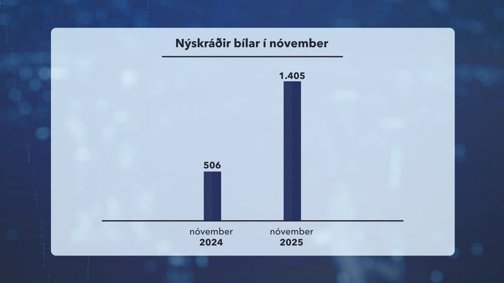 Meðalbílaleigubíllinn verði fyrir mestum áhrifum Bjarki Sigurðsson skrifar 15. desember 2025 23:39 Benedikt S. Benediktsson er framkvæmdastjóri Bílgreinasambandsins. Vísir/Anton Brink Nýskráningar bíla í nóvember voru tæplega þrefalt fleiri en í sama mánuði í fyrra. Mikla aukningu má líklegast rekja til hækkunar vörugjalda um áramótin að sögn framkvæmdastjóra Bílgreinasambandsins. Bílaleigur sem ekki kaupa rafbíla verði fyrir hvað mestum áhrifum. Um áramótin hækka vörugjöld á bíla sem ganga fyrir bensíni og dísil. Gjald fólksbíla fer úr fimm prósentum í fimmtán. Gjöld á bíla sem áður báru þrettán prósenta vörugjald, svo sem vinnuvélar, fara í tuttugu prósent og gjöld á hópferðabifreiðar, bifhjól og fjórhjól fara úr þrjátíu prósentum í fjörutíu. Fólk kaupi bíl strax Fjölmörg bílaumboð hafa í aðdraganda hækkunarinnar hvatt fólk í bílahugleiðingum að ganga frá kaupum fyrr en síðar, enda verði bílarnir dýrari eftir áramót. Dæmi um auglýsingar frá bílaumboðum þar sem fólk er látið vita af hækkuninni.Vísir/Sara Líklegt er að auglýsingarnar hafi borið árangur en fjórtán hundruð ökutæki voru nýskráð í nóvember. Sama mánuð í fyrra voru þau fimm hundruð. Fjöldi nýskráðra bíla var tæplega þrefaldur í nóvember í ár miðað við sama mánuð á síðasta ári.Vísir/Sara Töluverð áhrif Benedikt S. Benediktsson, framkvæmdastjóri Bílgreinasambandsins, segir gríðarlega fjölgun nýskráðra tvinnbíla vekja athygli. „Ef þetta fer fram sem horfið, verði þessi aukning fyrir áramót og þá verður væntanlega lág deyða í sölu á nýjum bílum fram eftir næsta ári. Jafnvel fram yfir verslunarmannahelgi eða eitthvað slíkt. Þá má gera ráð fyrir því að sala á rafmagnsbílum verði í góðu horfi þar sem þetta hefur minni háttar áhrif á hana. En þegar það kemur að öllum bílum sem að einhverju leyti ganga fyrir jarðefnaeldsneyti, já þá má gera ráð fyrir að það hafi töluverð áhrif,“ segir Benedikt. Fáir vilji leigja rafbíla Sextíu og fimm prósent nýskráðra bíla einstaklinga eru rafmagnsbílar og hækkun gjaldanna nær því ekki til þeirra. Hins vegar eru rafbílar eingöngu tæp níu prósent af nýskráningum bílaleiga. „Helmingurinn af kaupendum eru bílaleigur. Það eru erfiðleikar sem þær þurfa að glíma við þegar kemur að því að koma rafbílum í útleigu. Þannig að þar er eitthvað verkefni sem þarf að vinna,“ segir Benedikt. „Það er alla vega ljóst að meðalbílaleigubíll og svipaðir bílar munu taka hvað mestri hækkun ef fram fer sem horfir,“ segir Benedikt. Bílar Vistvænir bílar Orkuskipti Skattar, tollar og gjöld Ríkisstjórn Kristrúnar Frostadóttur Tengdar fréttir Breytingar á vörugjaldi muni bitna illa á tengiltvinnbílum Runólfur Ólafsson, framkvæmdastjóri Félags íslenskra bifreiðaeigenda, segir að boðaðar breytingar á vörugjaldi muni bitna illa á tengiltvinnbílum, þar sem verið er að koma með nýtt mat á koltvísýringsútlosun þeirra. 18. október 2025 10:30 Mest lesið Hafi hnakkrifist í teiti hjá Conan stuttu fyrir morðið Erlent Óvíst hvort Guðmundur Ingi snúi aftur í ráðuneytið Innlent Þau eru tilnefnd sem maður ársins Innlent Meðalbílaleigubíllinn verði fyrir mestum áhrifum Innlent Fjölgun landsmanna það eina sem hafi komið í veg fyrir tekjufall Rúv Innlent Skýrslan ekki til neins ef ekki verði brugðist við Innlent Umferðarslys á Breiðholtsbraut Innlent Ekki lengur hægt að breiða yfir sannleikann Innlent Segir Reiner hafa verið myrtan vegna andúðar í sinn garð Erlent „Ég var kölluð „hryðjuverkamaður““ Innlent Fleiri fréttir Meðalbílaleigubíllinn verði fyrir mestum áhrifum Óvíst hvort Guðmundur Ingi snúi aftur í ráðuneytið Fjölgun landsmanna það eina sem hafi komið í veg fyrir tekjufall Rúv Umferðarslys á Breiðholtsbraut Orð gegn orði um samskipti innan almannavarnarnefndar Skýrslan ekki til neins ef ekki verði brugðist við Faðir sem missti þrjú börn í Súðavík tjáir sig um uppgjör rannsóknarnefndar Bíll bilaði og Hvalfjarðargöngum lokað um stund Kanna áhuga á mögulegu framboði Guðlaugs í borginni Vistunin sé kerfisbundið brot á mannréttindum Hvorki álit né vangaveltur um ábyrgð einstaklinga í skýrslunni Þau eru tilnefnd sem maður ársins Lögðu hald á sautján skotvopn og skotfæri um helgina Stór mál standa enn út af Í takt við það sem verið hefur Aðalsteinn gefur kost á sér í oddvitasæti og fer í leyfi Bein útsending: Kynna skýrslu um snjóflóðið í Súðavík Þurftu að lenda í Liverpool á leið til Manchester Súðavíkurskýrslan afhent forseta Alþingis Ekki lengur hægt að breiða yfir sannleikann Heyrði skothvellina á Bondi strönd Vinstri beygjan bönnuð Sinntu fimmtán málum í tengslum við Iceguys tónleikana „Ég var kölluð „hryðjuverkamaður““ Magnea sækist eftir 2.-4. sæti á lista Samfylkingar Komu sér fyrir í ruslageymslu og kveiktu þar eld Vinna að því að koma upp efnagreiningu í neyslurýmum Ekki mótfallin Fljótagöngum en ekki með nýrri forgangsröðun Fleiri lífeyrisþegar og leikskólaforeldrar sem þurfa jólaaðstoð „Mjög erfitt starf tilfinningalega“ Sjá meira