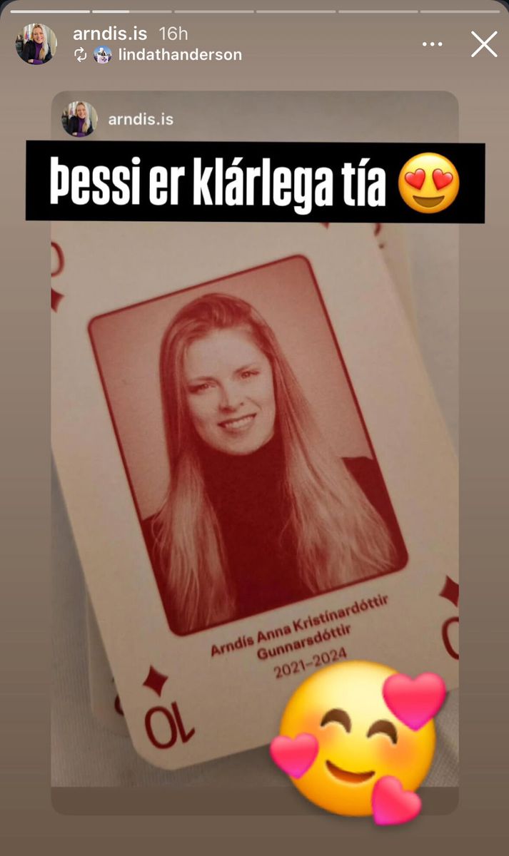 Arndís er fædd árið 1982 og Linda 1992 en sést hefur til parsins hér og þar undanfarnar vikur. Arndís Anna mætti til dæmis með Lindu upp á arminn í boð fyrrverandi þingmanna á dögunum og virðist ástin blómstra hjá þessu glæsipari. Linda deildi sömuleiðis nýverið mynd af nýju þingkonuspili þar sem Arndís Anna prýðir tígultíuna og skrifaði: „Þessi er klárlega tía.“ Arndís Anna er tía!Skjáskot Instagram
