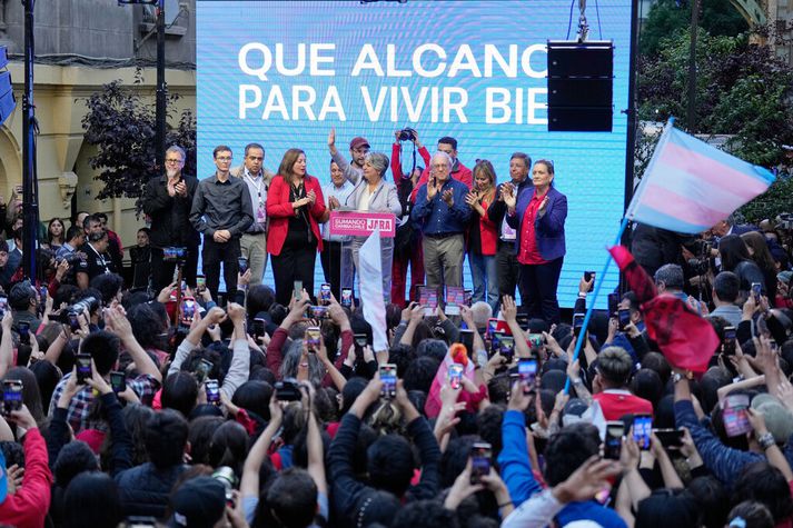 Fyrrverandi þingmaðurinn hlaut 58,2 prósent atkvæða gegn 41,8 prósentum Jeannette Jara, frambjóðanda Kommúnistaflokksins og atvinnumálaráðherra í ríkisstjórn Gabriels Boric, fráfarandi forseta. Munurinn á frambjóðendunum hefði vart getað verið meiri. Jara kemur úr fjölskyldu úr verkamannastétt sem barðist gegn herforingjastjórninni sem Pinochet leiddi. Kast er aftur á móti trúrækinn kaþólikki en þýskur faðir hans var félagi í Nasistaflokknum í heimalandi sínu. Bróðir Kast var ráðherra í herforingjastjórninni. Verðandi forsetinn er alfarið á móti hjónaböndum samkynhneigðra og vill banna þungunarrof með öllu. Hann lagði áherslu á aðgerðir til að draga úr glæpum og að skera upp herör gegn innflytjendum sem dvelja ólöglega í landinu. „Síle þarfnast reglu. Reglu á götunum, í ríkinu, í þeim forgangsatriðum sem hafa glatast,“ sagði Kast í sigurræðu sinni sem AP-fréttastofan hafi verið hófstilltari en orðræða frambjóðandans í kosningabaráttunni. Í stuðningsmannahópi Kast sem hlýddi á sigurræðuna mátti sjá ungt fólk sem hélt á myndum af harðstjórranum Pinochet. Vinstrið á undanhaldi Hægri sveifla á sér nú stað í Suður-Ameríku. Kjör Kast í Síle fylgir fast á hæla stjórnarskipta í Bólivíu þar sem hægri maður tók við völdum eftir langa valdatíð vinstri manna. Jeannette Jara veifar til stuðningsmanna sinna eftir tapið í forsetakosningunum um helgina.AP/Natacha Pisarenko Javier Milei, harður frjálshyggjumaður sem var kjörinn forseti Argentínu fyrir tveimur árum, var fyrstur til að óska Kast til hamingju með sigurinn. „Vinstrið er á undanhaldi,“ skrifaði Milei í samfélagsmiðlafærslu. Marco Rubio, utanríkisráðherra Bandaríkjanna, fagnaði einnig sigri Kast. Hann væri viss um að hann ætti eftir að reynast góður bandamaður í baráttu gegn ólöglegum fólksflutningum sem er Bandaríkjastjórn ofarlega í huga um þessar mundir.