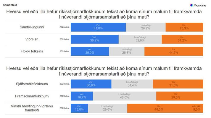 Tæplega 42 prósent svarenda í nýrri könnun maskínu segja Samfylkingunni ganga vel og rúmlega 28 prósent segja henni ganga illa að koma sínum málum í verk. Rest segir flokknum ganga í meðallagi. Þá töldu 36 prósent svarenda að Viðreisn gengi vel að koma málum í framkvæmd og 31 prósent töldu flokknum takast það illa en aðrir segja flokknum ganga í meðallagi. Aftur á móti telja um 29 prósent að Flokki fólksins gangi vel að hrinda sínum málum í framkvæmd en 44 prósent telja flokknum ganga illa við það og rest segir flokknum ganga í meðallagi. Flokki Ingu Sæland hefur gengið brösuglega að ná fram áherslumálum á borð við 48 strandveiðidaga og tengingu almannatryggingakerfisins við launavísitölu, en málin fengu ekki afgreiðslu fyrir þinglok í sumar. Meðal áherslumála flokksins sem hafa náð fram að ganga eru aftur á móti lögfesting samnings sameinuðu þjóðanna um réttindi fatlaðs fólks og frumvarp sem heimilar gæludýrahald í fjölbýli. Úr könnun sem Maskína framkvæmdi.Maskína Sömu spurningar var spurt í desember 2023, á tímum ríkisstjórnar Katrínar Jakobsdóttur. Þar þóttu Sjálfstæðismenn standa sig best þar sem 30 prósent töldu þeim ganga vel en 31,5 prósent töldu flokknum ganga illa. Tæp 17 prósent töldu Framsókn ganga vel að hrinda málum í framkvæmd en og 30 prósent töldu þeim ganga illa. Verst gekk Vinstri grænum en þar töldu 13 prósent að flokknum gengi vel og 48 prósent að flokknum gengi illa að ná málum sínum fram.