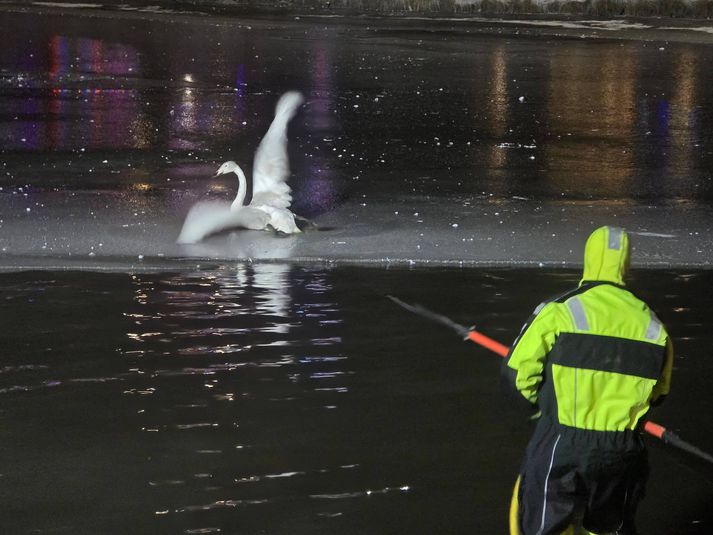 Maður ársins og slökkviliðið brugðust við vegna álftar sem fraus föst Elín Margrét Böðvarsdóttir skrifar 12. janúar 2026 10:17 Slökkviliðið á höfuðborgarsvæðinu kom álftinni til aðstoðar en hún hafði frosið föst við ísinn á tjörninni í Hafnarfirði. Facebook/Guðmundur Fylkisson Meðal verkefna Slökkviliðsins á höfuðborgarsvæðinu síðastliðinn sólarhring var að aðstoða álft sem var frosin föst á læknum í Hafnarfirði. Slökkviliðinu tókst að leysa álftina úr prísundinni og hélt álftin svo áfram leið sinni um lækinn. Slökkviliðið greinir frá verkefninu í stuttri færslu um helstu verkefni síðastliðins sólarhrings á Facebook í morgun. Það virðast þó hafa verið fuglavinir í Hafnarfirði sem kölluðu eftir aðstoð en sjálfur maður ársins, Guðmundur Fylkisson lögreglumaður, deildi myndum af álftinni á samfélagsmiðlum í gærkvöldi og sagði hjálp vera á leiðinni. Álftin sat föst við ísinn í kuldanum.Facebook/Guðmundur Fylkisson Myndunum deildi Guðmundur í Facebook-hópinn „Project-Henrý“, hópur sem tileinkaður er fuglum og fuglalífinu við Lækinn í Hafnarfirði, Víðistaðatjörn og höfnina í Hafnarfirði. Þar deildi Guðmundur einnig myndum frá björgunaraðgerðum eftir að slökkviliðið var mætt á vettvang. „Takk SHS. Við fylgjumst með henni,“ skrifaði Guðmundur eftir að álftin var laus úr prísundinni. Ekki er langt síðan að björgunarsveitir og Brunavarnir Árnessýslu fengust við sambærilegt verkefni þegar álft hafði frosið föst við klaka í Ölfusá, líkt og Vísir greindi frá í síðustu viku, en þá tókst vöskum björgunarmönnum einnig að losa álftina sem sat föst í Ölfusá. Á leið til aðstoðar.Facebook/Guðmundur Fylkisson Loksins var álftin aftur laus.Facebook/Guðmundur Fylkisson Fuglar Dýr Dýraheilbrigði Hafnarfjörður Slökkvilið Mest lesið „Martröð sem ég mun bera með mér alla ævi“ Innlent Sturla Böðvarsson er látinn Innlent Sérsveitaraðgerð á Selfossi Innlent Enn til skoðunar hvort úrskurðurinn verði kærður Innlent Danir standi á krossgötum Erlent Játar að hafa brotið á stúlku í Hafnarfirði Innlent Guðbjörg Ingunn fer í verðskuldað frí Innlent Maður ársins og slökkviliðið brugðust við vegna álftar sem fraus föst Innlent Fengu ekki réttargæslumann þrátt fyrir grun um ofbeldi á leikskólanum Innlent Rannsaka nú og skoða ákærur gegn seðlabankastjóranum Erlent Fleiri fréttir Þóttist vera borgarstarfsmaður og sveik út síma og verkfæri Guðbjörg Ingunn fer í verðskuldað frí Játar að hafa brotið á stúlku í Hafnarfirði Vonskuveður víða um land og óvissustig í gildi Íslenskum ríkisborgurum fjölgaði fimmtán sinnum meira en erlendum Enn til skoðunar hvort úrskurðurinn verði kærður Bálhvasst á Austfjörðum og óvissustig vegna snjóflóðahættu Maður ársins og slökkviliðið brugðust við vegna álftar sem fraus föst Þrjár vikur í fyrsta gjalddaga og 15% eiga eftir að skrá kílómetrastöðu Fengu ekki réttargæslumann þrátt fyrir grun um ofbeldi á leikskólanum „Martröð sem ég mun bera með mér alla ævi“ Draumur að skipuleggja kvennaverkfall í Þýskalandi Sturla Böðvarsson er látinn Forsjá varla ákveðin útfrá erfðafræðilegum tengslum Þjóðverjar horfi í ríkari mæli að Norður-Atlantshafi Sérsveitaraðgerð á Selfossi Fleiri stelpur týndar en áður Húsnæðismálin „helsti drifkraftur verðbólgu síðasta áratuginn“ „Evrópusambandið hefur haft sömu viðskiptastefnu og Trump“ Sviminn hvarf eftir aðgerðina og hækjan horfin Banaslys í Rangárþingi Útkoman mikill skellur eftir að vonarneisti kviknaði Bein útsending: Ráðherraskipti á ríkisráðsfundi Fyrsta ár Náttúruverndarstofnunar gekk glimrandi vel Inga vill skóla með aðgreiningu Átti í útistöðum við Frú Ragnheiði Meirihluti hlynntur aðildarviðræðum: „Margt breyst á stuttum tíma“ Meirihluti vill viðræður við ESB og mikið mannfall í Íran Grunaðir um íkveikju í eigin húsnæði Jóhanna Lilja, kartöflubóndi í Þykkvabæ, heiðruð Sjá meira