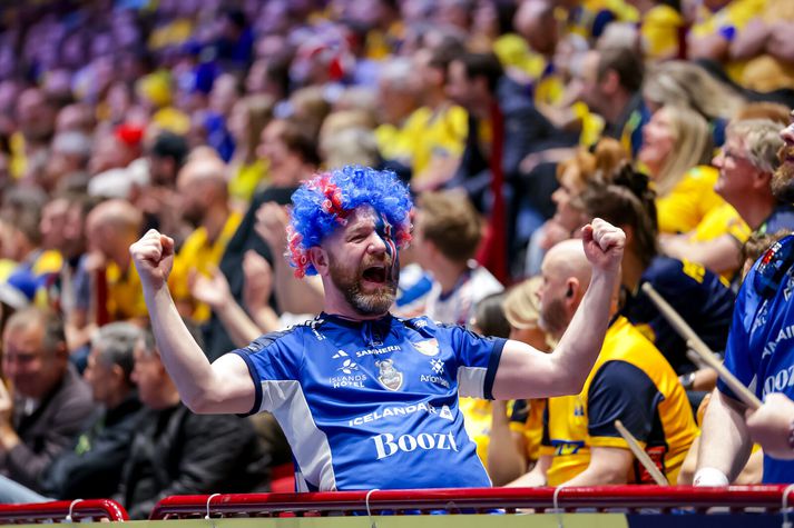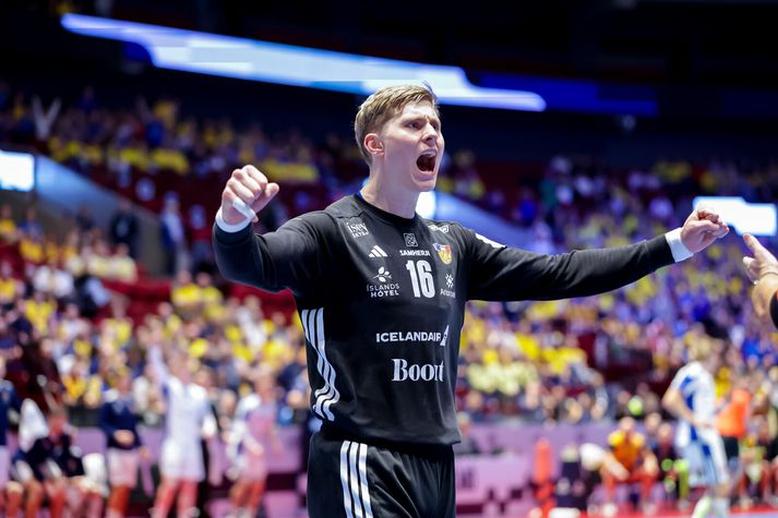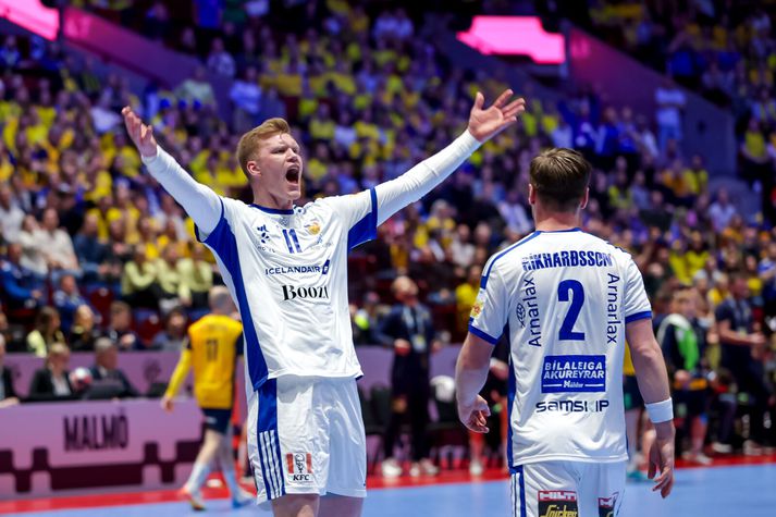 Ísland, Svíþjóð og Slóvenía komu öll með tvö stig með sér úr riðlakeppninni og hafa öll þrjú náð í tvö stig af fjórum mögulegum í fyrstu tveimur leikjum sínum. Króatar komu stigalausir inn í milliriðlinn en hafa unnið báða leiki sína í milliriðlinum. Ýmir Örn Gíslason fór á kostum í ótrúlegri vörn Íslands í gær. Vörn skilar titlum, segir einhvers staðar.VÍSIR/VILHELM Ef að lið enda jöfn að stigum er farið eftir árangri í innbyrðis leikjum þeirra liða, til að ákveða í hvaða sæti þau enda. Hins vegar er það þannig, samkvæmt reglum EHF um Evrópumótið, að þangað til að öllum leikjum í milliriðlakeppninni lýkur þá er liðum EKKI raðað eftir innbyrðis úrslitum heldur eftir heildarárangri. Stórsigur Íslands í gær kemur liðinu því á toppinn í riðlinum einfaldlega vegna þess að liðið er með bestu heildarmarkatöluna, eða +8. Svíþjóð er með +4, Slóvenía +2 og Króatía -3. Staða Íslands líka góð innbyrðis Þegar síðustu tveimur umferðunum lýkur verður hins vegar horft til innbyrðis úrslita og liðunum raðað eftir þeim. Ef miðað væri við þau núna þá væri Ísland í 2. sæti og Svíþjóð á toppnum. Tvö efstu liðin komast í undanúrslit. Svíar standa nefnilega best að vígi þegar innbyrðis úrslit úr leikjum Íslands, Svíþjóðar, Slóveníu og Króatíu eru skoðuð. Þeir hafa unnið bæði Slóveníu og Króatíu, en tapað gegn Íslandi, og eru því einir með fjögur stig úr þessum innbyrðis leikjum. Þeir eru líka eina liðið sem er búið með alla þrjá leiki sína innbyrðis við þessi lið. Gísli Þorgeir Kristjánsson réðist á sænsku varnarmennina hvað eftir annað og var eflaust í martröðum þeirra í nótt.VÍSIR/VILHELM Íslendingar og Króatar eru síðan með einn sigur og eitt tap en Slóvenar án stiga því þeir töpuðu á móti Svíum og hafa ekki spilað við hinar tvær þjóðirnar. Slóvenía er því sem stendur neðst í innbyrðis stigatöflu þessara fjögurra liða með núll stig út úr leikjum við hinar þrjár þjóðirnar. Ísland stendur vel að vígi í innbyrðis stigatöflunni eftir þennan átta marka stórsigur á Svíum í gærkvöld og aðeins eins marks tap fyrir Króötum. Ísland er því með +7 í innbyrðis markatölunni. Viktor Gísli Hallgrímsson stóð heldur betur fyrir sínu í gær og fagnar hér markvörslu gegn Svíum.VÍSIR/VILHELM Svíar eru með +4 í innbyrðis markatölu (+8 marka sigur gegn Króatíu, +4 marka sigur gegn Slóveníu, -8 marka tap gegn Íslandi) en yrðu með 0 í markatölu ef Slóvenía dytti út úr pakkanum. Króatar eru síðan með -7 eftir eins marks sigur á Íslandi og átta marka tap fyrir Svíum, og þurfa að treysta á fleira en eigin úrslit til að komast í undanúrslitin. Stuðingsmenn Íslands fóru á kostum eins og leikmennirnir í Malmö í gær.VÍSIR/VILHELM Allar þjóðir eiga eftir að spila tvo leiki í þessum milliriðli og það á því mikið eftir að gerast enn þá en það stefnir samt í það að þessi stórsigur á Svíum gæti komið sér afar vel þegar þessi milliriðill er gerður upp.