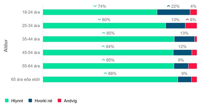 Þetta kemur fram í tilkynningu frá Prósent. Samkvæmt niðurstöðunum eru marktækt færri á aldrinum 18 til 24 ára hlynntir banninu samanborið við þau sem eru 35 ára eða eldri. Hversu hlynnt(ur) eða andvíg(ur/t) ert þú því að sala á orkudrykkjum verði bönnuð börnum og ungmennum undir 18 ára? Svör eftir aldri. Þá segir að þau sem eru með tvö börn eða fleiri á heimilinu eru hlynntari banninu en þau sem eru með eitt eða ekkert barn á heimilinu. Hversu hlynnt(ur) eða andvíg(ur/t) ert þú því að sala á orkudrykkjum verði bönnuð börnum og ungmennum undir 18 ára? Svör eftir fjölda barna á heimili. Fylgjendur Framsóknarflokksins, Viðreisnar, Flokks fólksins og Samfylkingarinnar eru marktækt hlynntari banninu en fylgjendur Miðflokksins og Sjálfstæðisflokksins. Þó vill mikill meirihluti kjósenda allra flokka bann við sölu á orkudrykkjum til barna. Hversu hlynnt(ur) eða andvíg(ur/t) ert þú því að sala á orkudrykkjum verði bönnuð börnum og ungmennum undir 18 ára? Svör eftir fylgi flokka. Könnunin var framkvæmd frá 21. janúar til 2. febrúar 2026 og var um að ræða netkönnun meðal könnunarhóps Prósents. Úrtakið voru tvö þúsund manns, 18 ára og eldri, og var svarhlutfallið fimmtíu prósent.
