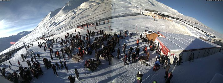 Það viðrar frábærlega til skíðaiðkunar á Akureyri í dag eins og sést glöggt á aðsókninni í Hlíðarfjall. Bílaröðin nær nánast niður í byggð og lögreglan lokaði veginum tímabundið á meðan mest lætur. Brynjar Helgi Ásgeirsson forstöðumaður harmar það að geta ekki boðið upp á fleiri bílastæði. „Það er náttúrlega bara yndislegt veður og allar brekkur fullar af snjó og bærinn stappaður af fólki í vetrarfríi. Það eru bara allir að reyna að komast á skíði í sama tíma,“ segir hann. Skjáskot úr vefmyndavél Hlíðarfjalls um hádegisbilið.Skjáskot Hann segir lögregluna þar í bæ hafa tímabundið lokað fyrir umferð upp í Hlíðarfjall á meðan versta teppan gekk yfir en að hleypt verði aftur upp í fjall um leið og gestir fara að tínast aftur í bæinn. Ertu með einhver ráð fyrir fólk í skíðahugleiðingum? „Nei, en ég er með ráð fyrir sveitarfélögin: ekki hafa öll vetrarfríin á sama tíma,“ segir Brynjar. Hann segir hátt á fjórða þúsund manns hafi gert sér ferð upp í fjallið í gær og að í dag komi jafnvel fleiri.