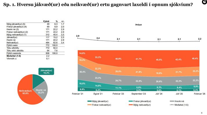 Sjókvíaeldi Skoðanakannanir Ríkisstjórn Kristrúnar Frostadóttur Viðreisn Sjávarútvegur Mest lesið Lögreglustjóri tilkynntur fyrir ofbeldi og áreitni á þorrablóti Innlent „Svo sprakk rúðan og glerbrot út um allt í bílnum“ Innlent Fallast ekki á svör borgarinnar og vilja „friðarviðræður“ Innlent Vissi alltaf að sonurinn myndi ekki þrífast í skólakerfinu Innlent Fangavörður sendur í leyfi Innlent Biðla til fólks að vera undirbúið undir vetrarfærð á morgun Innlent Enn óvíst hvar miðja bakkans lendir Innlent Átti að fá smáaura fyrir sögulegt smygl Innlent Þrjár stúlkur réðust á eina Innlent Tíðindalítil en metlöng stefnuræða Erlent Fleiri fréttir Leggja niður tólf störf hjá Sjúkratryggingum Yfir hundrað þúsund gert kröfu: „Réttlæti skal ná fram að ganga“ Þá var hægt að lækka fargjöld um 51 prósent Tæp sextíu prósent landsmanna vilja banna sjókvíaeldi Sjálfstæðisflokkurinn ekki í samkeppni og „alveg slök“ í Miðflokknum Einar fundar með borginni um málefni miðborgar Átti að fá smáaura fyrir sögulegt smygl Þjónustubátur sökk í Tálknafjarðarhöfn Lögreglustjóri tilkynntur fyrir ofbeldi og áreitni á þorrablóti Enn óvíst hvar miðja bakkans lendir Snjókomubakkinn nálgast borgina Vissi alltaf að sonurinn myndi ekki þrífast í skólakerfinu Ellefu í framboði í prófkjöri Pírata Býður sig fram í embætti varaformanns VG Hálfs árs fangelsi fyrir að berja mann með bifhjólakeðju Rúmar sex hundruð milljónir til sjö stjórnmálaflokka Rúta út af vegi í Fagradal og fleiri í vanda í hvassviðrinu Þau skipa lista Sjálfstæðisflokksins á Akureyri Þrjár stúlkur réðust á eina Fangavörður sendur í leyfi Fallast ekki á svör borgarinnar og vilja „friðarviðræður“ Vantrauststillagan sýni vanhæfni meirihluta Vöku Biðla til fólks að vera undirbúið undir vetrarfærð á morgun „Svo sprakk rúðan og glerbrot út um allt í bílnum“ Ný bráðamóttaka að taka á sig mynd Miðflokki fatast flugið Vökuliðar frestuðu afgreiðslu á vantrauststillögu Samgöngustofa ógildir skoðanir á gúmmíbjörgunarbátum Tímamót og glæný könnun Vara við krefjandi aðstæðum á höfuðborgarsvæðinu Sjá meira