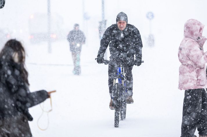 Það er ekki á hverju ári sem það þykja tíðindi að það snjói í febrúar á Íslandi, en þetta er hins vegar í fyrsta sinn síðan í lok október sem sjóað hefur svo hressilega á höfuðborgarsvæðinu. Alhvíta daga sem verið hafa á höfuðborgarsvæðinu síðan má telja á fingrum annarrar handar, en samkvæmt upplýsingum frá Veðurstofunni var einn snjódagur í nóvember, tveir í desember og tveir í janúar. Í öll skiptin var þó um að ræða töluvert minni snjó en féll í dag, og í október þegar snjókomumet í mánuðinum var slegið. Þeir allra hörðustu létu ekki smá snjókomu á sig fá og fóru leiðar sinnar á reiðhjóli.Vísir/Vilhelm Það var allur gangur á því hvort fólk sem fréttastofa ræddi við í dag var tilbúið fyrir snjókomuna þegar hún skall á í höfuðborginni síðdegis, líkt og heyra má í fréttinni hér að neðan. Lóló Rósenkrans er ein þeirra sem var ekki beint tilbúin í snjókomuna, en lætur snjóinn þó ekki á sig fá. „Stóð þetta eitthvað til? Ætluðum við að gera þetta núna? Nei, ég var ekki að bíða eftir honum,“ segir Lóló létt í bragði. „En það er ekkert að þessu, yndislegt veður.“ Gul viðvörun var í gildi til klukkan sjö í kvöld á höfuðborgarsvæðinu en snjókomubakkinn hefur síðan fært sig vestur eftir landinu og tekur gul viðvörun gildi á Vestfjörðum snemma í fyrramálið og rétt fyrir hádegi á norðanverðu Snæfellsnesi og annars staðar við Breiðafjörð. Vegfarendur eru hvattir til að hafa varann á og kynna sér veður og færð áður en lagt er af stað, einkum þeir sem eiga leið um fjallvegi á vestanverðu landinu, þar sem hálka, skafrenningur og þæfingsfærð gæti sett strik í reikninginn.