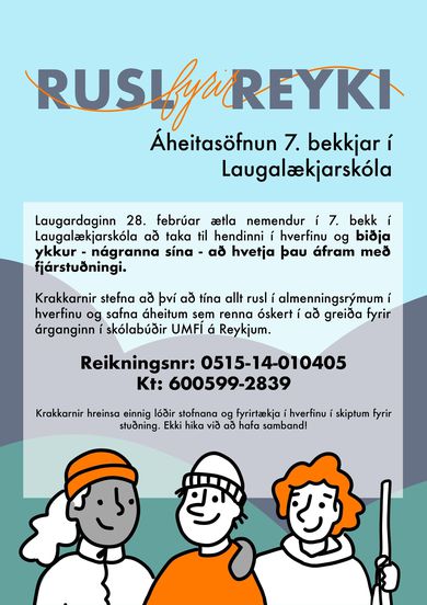 Tína rusl til að komast á Reyki Silja Rún Sigurbjörnsdóttir skrifar 25. febrúar 2026 21:51 Unnur Elísabet Björnsdóttir, Katrín Orradóttir, Hanna Kaðlín Magnúsdóttir, Ari Helgason og Dagur Atli Grönvold ætla að safna rusli til að komast á Reyki. Aðsend Krakkar í sjöunda bekk í Laugalækjarskóla fundu upp á nýrri leið til að safna fyrir ferðalagi þeirra í skólabúðirnar á Reykjum. Þau ætla að verja degi í að týna rusl í almenningsrýmum hverfisins og safna áheitum. Á fundi nemendanna veltu þeir og foreldrar vöngum yfir hvernig væri best að safna peningum fyrir ferðalagið. „Það vildi enginn vera að þvinga óþarfa hluti upp á fólk og að fara í það að selja eitthvað sem enginn þarf þegar markmiðið er að fólk vilji aðallega styrkja krakkana,“ segir Ariana Katrín Katrínardóttir, móðir stúlku í skólanum. Hugmyndin hafi vaknað eftir að eitt foreldrið, sem gekk á fundinn, minntist á hversu mikið rusl væri í Laugardalnum. Þannig vaknaði sú hugmynd að krakkarnir myndu tína rusl í fjáröflunarskyni, sem væri einnig mun umhverfisvænna heldur en að selja klósettpappír eða lakkrís. „Krakkarnir tóku vel í það að hafa svona stóran dag þar sem þau munu ganga skipulega um hverfið. Við foreldrarnir skiptum þeim í hópa og hólf,“ segir Ariana. „Við hugsuðum líka með okkur að þó að við gætum ekki safnað miklu værum við samt að skila einhverju til samfélagsins.“ Íþróttafélagið Þróttur kom til móts við krakkana og verður eins konar samkomustaður. Að auki ætla forsvarsmennirnir að bjóða hópnum í kakó að tínslunni lokinni. Ariana tekur fram að þótt það verði snjór yfir öllu um helgina verði ekki hætt við heldur valinn annar dagur. Grunnskólar Reykjavík Mest lesið Lögreglustjóri tilkynntur fyrir ofbeldi og áreitni á þorrablóti Innlent Hvetja fólk til að fara fyrr heim vegna veðurs Veður „Svo sprakk rúðan og glerbrot út um allt í bílnum“ Innlent Tólf sagt upp hjá Sjúkratryggingum Innlent Vissi alltaf að sonurinn myndi ekki þrífast í skólakerfinu Innlent Þrautaganga Ingva og fjölskyldu: Svefnleysi, bræðiköst og flogveiki en engin úrræði Innlent Fallast ekki á svör borgarinnar og vilja „friðarviðræður“ Innlent Þá var hægt að lækka fargjöld um 51 prósent Innlent Gögn um ásökun konu á hendur Trump vantar í Epstein-skjölin Erlent „Ætluðum við að gera þetta núna?“ Innlent Fleiri fréttir Þurfi að draga úr ofbeldi gegn eldri borgurum Geti átt í samstarfi við nær alla flokka Tína rusl til að komast á Reyki Trausti vill snúa aftur „Ætluðum við að gera þetta núna?“ Þrautaganga Ingva og fjölskyldu: Svefnleysi, bræðiköst og flogveiki en engin úrræði Rúta lenti utan vegar Ráðaleysi, viðvörun og hetjusaga Yrði glaður að fá Ísland í ESB: Atkvæðagreiðsla á næstu mánuðum Fékk Prins Póló: „Pabbi þetta er fyrir þig“ Enginn meðalmaður eða meðalkona til í alvörunni Maðurinn grunaður um manndráp á Kársnesi áfram í haldi Tólf sagt upp hjá Sjúkratryggingum Yfir hundrað þúsund gert kröfu: „Réttlæti skal ná fram að ganga“ Þá var hægt að lækka fargjöld um 51 prósent Tæp sextíu prósent landsmanna vilja banna sjókvíaeldi Sjálfstæðisflokkurinn ekki í samkeppni og „alveg slök“ í Miðflokknum Einar fundar með borginni um málefni miðborgar Átti að fá smáaura fyrir sögulegt smygl Þjónustubátur sökk í Tálknafjarðarhöfn Lögreglustjóri tilkynntur fyrir ofbeldi og áreitni á þorrablóti Enn óvíst hvar miðja bakkans lendir Snjókomubakkinn nálgast borgina Vissi alltaf að sonurinn myndi ekki þrífast í skólakerfinu Ellefu í framboði í prófkjöri Pírata Býður sig fram í embætti varaformanns VG Hálfs árs fangelsi fyrir að berja mann með bifhjólakeðju Rúmar sex hundruð milljónir til sjö stjórnmálaflokka Rúta út af vegi í Fagradal og fleiri í vanda í hvassviðrinu Þau skipa lista Sjálfstæðisflokksins á Akureyri Sjá meira
