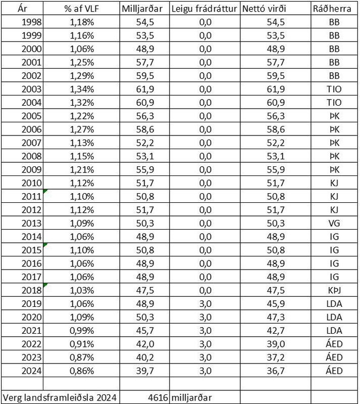Í fjaðrafokinu í kringum afsögn Ásthildar Lóu Þórsdóttur, fyrrverandi mennta- og barnamálaráðherra hnaut ég um orð siðfræðingsins Henrý Alexanders Henrýssonar. Hann segir í viðtali við RÚV að Ásthildur hafi verið veikur ráðherra með takmarkaðan trúverðugleika og að ein „helstu rök fyrir afsögn séu þau að ráðherra þurfi að hafa styrk til að koma mikilvægum málum í gegnum þing og keppa um fjármagn við samráðherra. Ráðherra með laskaðan trúverðugleika sé mikill dragbítur á málflokk hvers ráðuneytis.“ (Rúv, 2025). Þessi ummæli lýsa hlutverki ráðherra sem hafa þá frumskyldu að fjármagna verkefni sem þeir eru ábyrgir fyrir. Í þessari grein er styrkur menntamálaráðherra mældur út frá hagstofumælikvarða sem kallast „útgjöld ríkisins til framhaldsskólastigsins sem hlutfall af vergri landsframleiðslu“ en til eru nokkuð óslitnar samanburðarhæfar mælingar aftur til ársins 1998 ef frá er dreginn stökkbreyttur húsaleigukostnaður ríkisreknu framhaldsskólanna 2019 (Unnar, 2020). Forsendur Til að glöggva mig betur á áhrifum starfandi menntamálaráðherra á fjárlagagerð greindi ég á hvaða haustþingum þeir störfuðu og eignaði þeim þá „heiðurinn“ af fjárhagsniðurstöðum sem birtust í bókhaldinu árið eftir. Ásthildur Lóa, Guðmundur Ingi Kristinsson og Inga Sæland eru utan þessarar greiningar en þar sem Guðmundur Ingi starfaði á haustþinginu 2025 myndi ég eigna honum heiðurinn af fjármögnun framhaldsskólanna á yfirstandandi ári, þ.e. 2026. Niðurstöður ársreikninga árið 2025 hafa ekki verið birtar almenningi en Ásmundur Einar Daðason væri helsti áhrifavaldur þeirrar fjárlagagerðar. Þessar niðurstöður eru paraðar saman við áðurnefndan mælikvarða sem kallast „útgjöld ríkisins til framhaldsskólastigsins sem hlutfall af vergri landsframleiðslu“. Til að fá samanburðarhæft mat í milljörðum nota ég landsframleiðsluna 2024 sem er metin 4,6 billjónir og dreg frá 3 milljarða húsaleiguok (húsaleiga á verðlagi 2024) þar sem það á við. Niðurstöðurnar eru sem hér segir: Tafla 1: Fræðslugjöld ríkissjóðs til framhaldsskóla sem hlutfall af vergri landsframleiðslu umreiknaðir í milljarða á verðlagi VLF 2024 og parað við ábyrgan ráðherra menntamála að frádregnu leiguoki. Niðurstöður Hér hefur verið farið yfir forsendur greiningarinnar og ekkert að vanbúnaði að birta árangurinn í milljörðum. Tafla 2: Meðalfjármögnun á verðlagi landsframleiðslu 2024 í milljörðum talið. Munurinn sem við sjáum í þessu árangursmati er það mikill að erfitt er að koma honum í skiljanlegt samhengi. Samkvæmt þessu skilaði Tómas Ingi Olrich hæstu fjármögnuninni til framhaldsskólanna en Ásmundur Einar lægstu. Lilja Dögg hækkaði húsleigu framhaldsskólanna í stað þess að takast á við aukinn fjölda erlendra nemenda í skólakerfinu. Illugi Gunnarsson stóð fyrir styttingu námstímans til stúdentsprófs en ekkert fjármagn kom í staðinn. Þá eru nokkur atriði sem stinga í augu. Munurinn á hæstu og lægstu fjárframlögum í töflunni er t.a.m. 23,8 milljarðar sem gefur okkur þá hugmynd fjárframlög til framhaldsskólans lækki að meðaltali um heilan milljarð ár hvert eða tíu milljarða á áratug. Með þessu áframhaldi stefnum við hraðbyri að framhaldsskólalausu Íslandi 2050! Til samanburðar má benda á að tekjufærsla fjárveitingar til Menntaskólans á Akureyri var rétt rúmlega einn milljarður árið 2024 (Fjársýslan). Það munar því tuttugu og fjórum Menntaskólum á Akureyri á milli Tómasar Inga og Ásmundar Einars þegar við skoðum fjárveitingarnar á núvirði þjóðarframleiðslunnar 2024. Endanlegar niðurstöður matsins má sjá á mynd 1 hér að neðan: Mynd 1: Meðalfjármögnun menntamálaráherra í milljörðum Hvað gerir Inga þá? Ljóst að erfitt verkefni býður Ingu Sæland við ríkisstjórnarborðið á næstkomandi haustþingi. Boðaður niðurskurður ríkisstjórnarinnar á framhaldsskólastiginu upp á 2,5 milljarða rímar illa við svæðisskrifstofurnar sem kosta einhverja svipaða upphæð. Þarna munar fimm milljörðum sem seint verða dregnir úr kerfi sem sinnir tæpast hlutverki sínu. Af þeim fimm þúsund nemendum sem hafa annan uppruna en íslenskan í framhaldsskólum landsins má ætla að flestir séu í allt of fjölmennum hópum sem henta illa því sérhæfða íslenskunámi sem þeir eiga rétt á. Ef við gefum okkur að hóparnir séu að meðaltali 50% stærri en þeir ættu vera, þá erum við þar búin að finna aðra fimm milljarða sem upp á vantar og þá alls komnir tíu milljarðar. Svona vinda innviðaskuldirnar upp á sig. Það þýðir þá varla fyrir Daða Má núverandi fjármálaráðherra að bjóða Ingu upp á einn eða tvo milljarða eða mínustölur í nafni hagræðingar. Til samanburðar hafði Þorgerður Katrín að meðaltali úr 55 milljörðum að spila og spurning af hverju Inga ætti að sætta sig við 35 milljarða með miklu umfangsmeiri áskoranir? Hvað ætlar þú að gera Inga? Höfundur er framhaldsskólakennari. Heimildaskrá Fjársýsla ríkisins. (e.d.). Ársreikningar ríkisins. Sótt 18. febrúar 2026 afhttps://arsreikningar.rikisreikningur.is/ Guðjón Hreinn Hauksson. (2026, 11. janúar). Skipulagt svelti í framhaldsskólum. Vísir.https://www.visir.is/g/20262827411d/skipu-lagt-svelti-i-fram-halds-skolum Róbert Örvar Ferdinandsson. (2025, 2. október). Fjármál framhaldsskóla. Vísir.https://www.visir.is/g/20252783165d/fjarmal-framhaldsskola RÚV. (2025, 20. mars). Stjórnmálafræðingar: Afsögn Ásthildar Lóu skapar frið um störf ríkisstjórnar. https://www.ruv.is/frettir/innlent/2025-03-20-stjornmalafraedingar-afsogn-asthildar-lou-skapar-frid-um-storf-rikisstjornar-439329 Unnar Þór Bachmann. (2020, 18. nóvember).