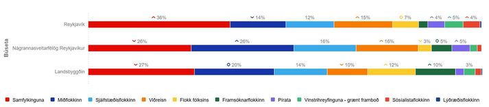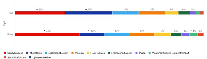 Af þeim sem tóku afstöðu þá myndu 30,1 prósent kjósa Samfylkinguna, 19,6 prósent Miðflokkinn, 13,7 prósent Sjálfstæðisflokkinn, 13,5 prósent Viðreisn, 7,7 prósent Flokk fólksins, 5,9 prósent Framsóknarflokkinn, 3,6 prósent Pírata, 3,3 prósent Vinstri græn, 2,4 prósent Sósíalistaflokkinn og 0,2 prósent Lýðræðisflokkinn. Fylgi flokka samkvæmt könnun Prósents. Prósent Niðurstöðurnar eru ólíkar þeim sem komu í könnun Maskínu fyrr í vikunni en þar var Samfylkingin með 27,2 prósenta fylgi, Miðflokkurinn með 19 prósenta fylgi og Sjálfstæðisflokkurinn með 16,2 prósenta fylgi. Samkvæmt niðurstöðum er fylgi Samfylkingarinnar marktækt meira hjá konum en körlum, eða 34 prósent á móti 26 prósentum. Fylgi Miðflokksins er marktækt meira hjá körlum en konum, eða 25 prósent á móti 13 prósentum. Fylgi eftir kyni. Prósent Þá segir að fylgi Viðreisnar sé marktækt meira hjá einstaklingum á aldrinum 35 til 54 ára en 65 ára og eldri og 25 til 34 ára. Fylgi Framsóknarflokksins er marktækt meira hjá 25 til 34 ára en 18 til 24 ára. Fylgi Flokks fólksins er marktækt meira hjá 55 ára og eldri en hjá þeim sem yngri eru. Fylgi Pírata er marktækt meira hjá 18–24 ára en hjá þeim sem eru 35 ára og eldri. Fylgi eftir aldri. Prósent Niðurstöður eru einnig greindar eftir búsetu og samkvæmt því er fylgi Samfylkingarinnar marktækt meira hjá þeim sem búa í Reykjavík en hjá þeim sem búa í nágrannasveitarfélögum Reykjavíkur og á landsbyggðinni. Fylgi Miðflokksins er marktækt meira hjá þeim sem búa í nágrannasveitarfélögum Reykjavíkur en hjá þeim sem búa á landsbyggðinni eða í Reykjavík. Fylgi Viðreisnar er marktækt meira hjá þeim sem búa í Reykjavík og nágrannasveitarfélögum en hjá þeim sem búa á landsbyggðinni. Fylgi eftir búsetu. Prósent Fylgi Flokks fólksins er marktækt meira á landsbyggðinni en í þeim sem búa í Reykjavík og í nágrannasveitarfélögum Reykjavíkur. Fylgi Framsóknarflokksins er marktækt meira hjá þeim sem búa á landsbyggðinni en í þeim sem búa í Reykjavík eða nágrannasveitarfélögum Reykjavíkur. Fylgi Vinstrihreyfingarinnar - græns framboðs er marktækt meira í Reykjavík en í nágrannasveitarfélögum Reykjavíkur og fylgi Sósíalistaflokksins er marktækt meira í Reykjavík en í nágrannasveitarfélögum Reykjavíkur og á landsbyggðinni. Gögnum var safnað frá 21. janúar til 16. febrúar 2026 í netkönnun meðal könnunarhóps Prósents. Úrtak var 3.900 og var svarhlutfall 50 prósent. Spurt var: Hvaða lista myndir þú kjósa ef gengið yrði til þingkosninga í dag?
