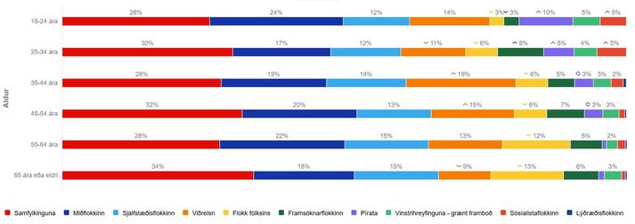 Skoðanakannanir Alþingi Samfylkingin Sjálfstæðisflokkurinn Miðflokkurinn Viðreisn Píratar Lýðræðisflokkurinn Sósíalistaflokkurinn Flokkur fólksins Mest lesið „Fyrir löngu búið að fara yfir þolmörk starfsfólks Ölduselsskóla“ Innlent Skóli blásinn af og foreldrar eitt stórt spurningarmerki Innlent Björn kemst ekki til Melaniu Innlent Kjartan og Marta út, Björn í tíunda og Friðjón í því ellefta Innlent Dóru Björt hafnað: „Nú eru kaflaskil“ Innlent Bandarískur reynslubolti gómaður við að þjálfa Kínverja Erlent Hreyflaskipti á flugvél dýrari en einbýlishús Innlent Sex hundruð fastir á Akureyri eftir að áhafnir runnu út á tíma Innlent Hálka í höfuðborginni og þungfært víða um land Innlent Endurskoða skipurit áður en ákvörðun um varaslökkviliðsstjóra verður tekin Innlent Fleiri fréttir Flutti kíló af kókaíni inn í borði og flúði lögreglu á hjóli Kjartan og Marta út, Björn í tíunda og Friðjón í því ellefta Tvöfalt fleiri karlar en konur kjósa Miðflokkinn Hreyflaskipti á flugvél dýrari en einbýlishús Endurskoða skipurit áður en ákvörðun um varaslökkviliðsstjóra verður tekin Björn kemst ekki til Melaniu Hálka í höfuðborginni og þungfært víða um land „Fyrir löngu búið að fara yfir þolmörk starfsfólks Ölduselsskóla“ Strætó fór útaf á Holtavörðuheiði Skóli blásinn af og foreldrar eitt stórt spurningarmerki Holtavörðuheiði og Fjarðarheiði lokaðar Sex hundruð fastir á Akureyri eftir að áhafnir runnu út á tíma Þúsundir í slæmri stöðu, stjórnvöld verði að bregðast við Dóru Björt hafnað: „Nú eru kaflaskil“ Bæjarstjóri Mosfelssbæjar á lista Samfylkingar í Reykjavík Ástand sem ekki hefur sést áður Steina vill áfrýja: „Brotið gegn grundvallarréttindum umbjóðanda míns“ Vilja finna unglingaskóla nýjan stað Vaktin: Sautján vélar á röngum velli og flugferðum aflýst Tíu manns í árekstri á Suðurlandi Sakfelling Steinu staðfest Heilsugæslan tekur við verkefnum Heyrnar- og talmeinastöðvar Lögðu hald á tugi kílóa lítt þekkts fíkniefnis Bein útsending: Veikindaréttindi og samspil milli vinnumarkaðar og heilbrigðisþjónustu Bein vaxið yfir augun og fólk afmyndast í andliti við notkun peptíða Gísli Rafn lætur af störfum hjá Rauða krossinum Tækinu ekki ekið of hratt þó hraðinn segi ekki allt Börnum með stöðu sakbornings fjölgar: „Sláandi tölur“ Viðreisn býður í fyrsta skipti fram á Akureyri Vonbrigði með verðbólgutölurnar og snjómokstur olli tjóni Sjá meira